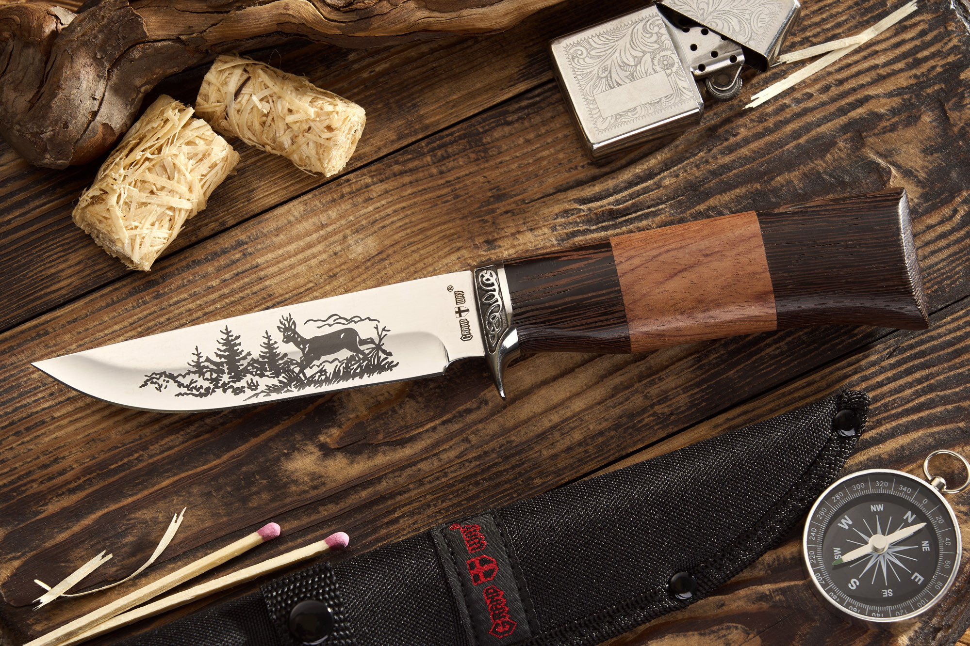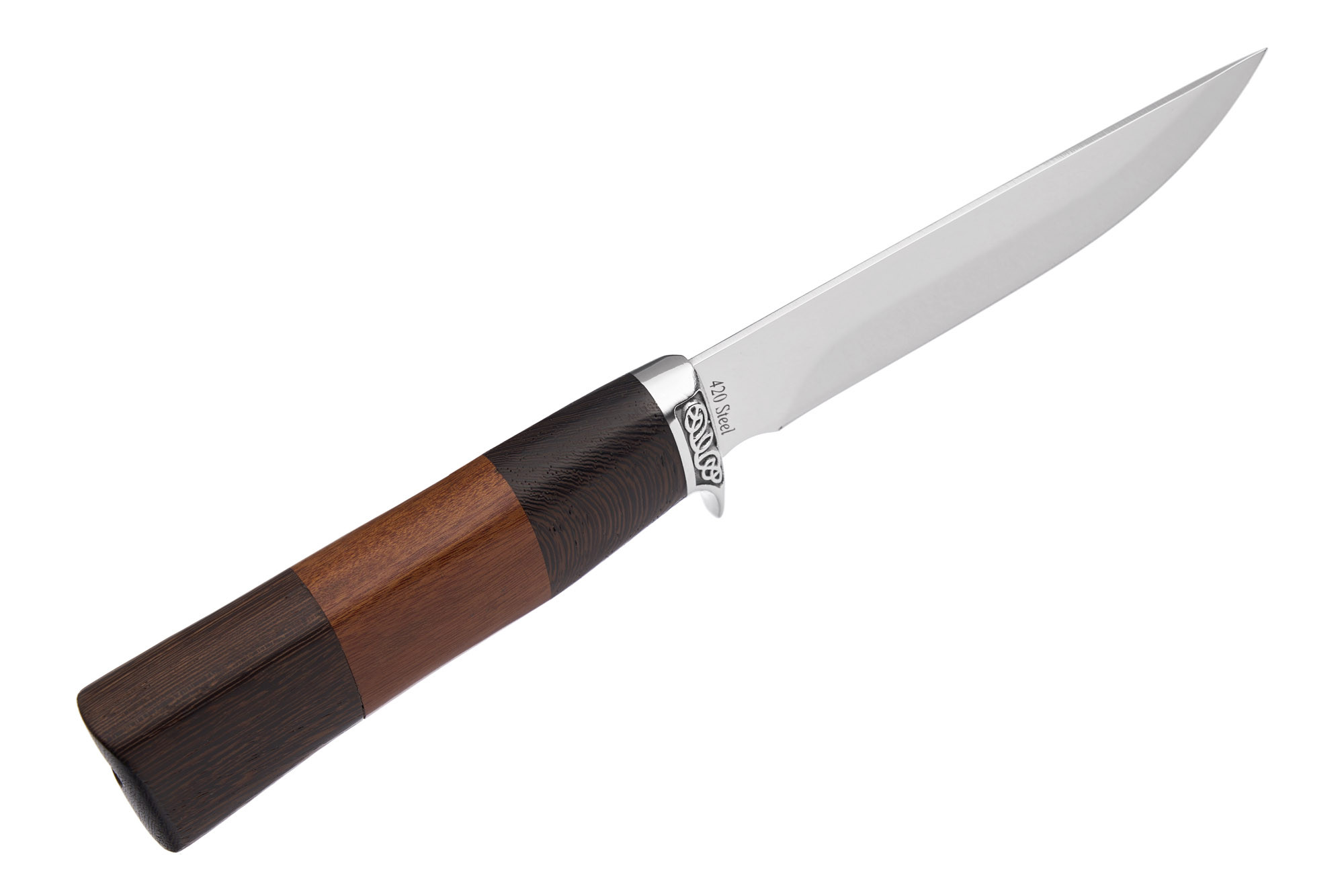 - Ергономічне руків'я із якісних порід деревини з металевими больстером та навершям, гарантує безпеку та зручність використання ножа;