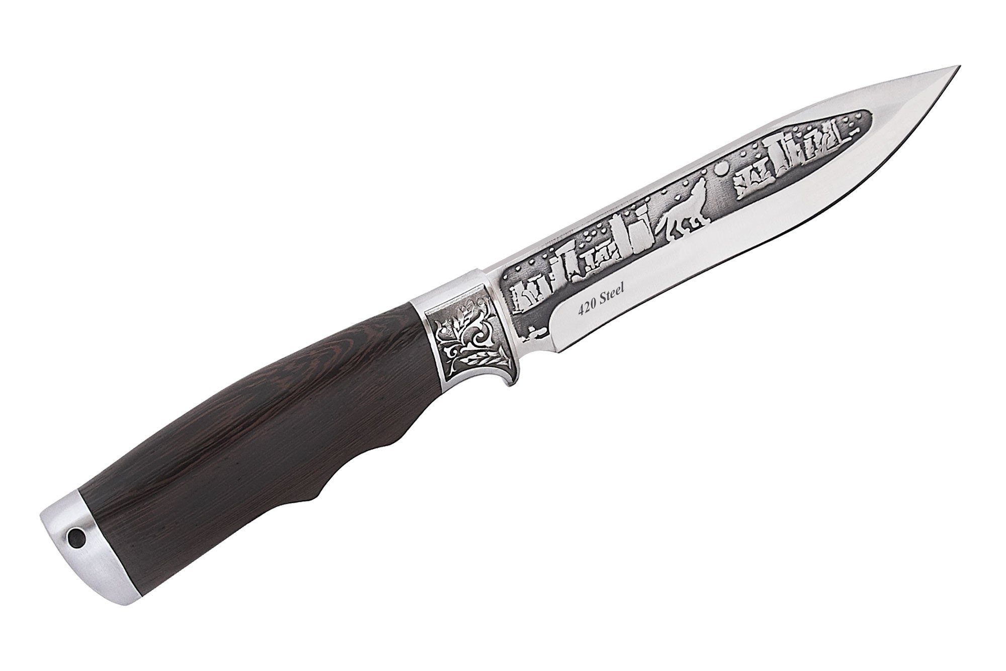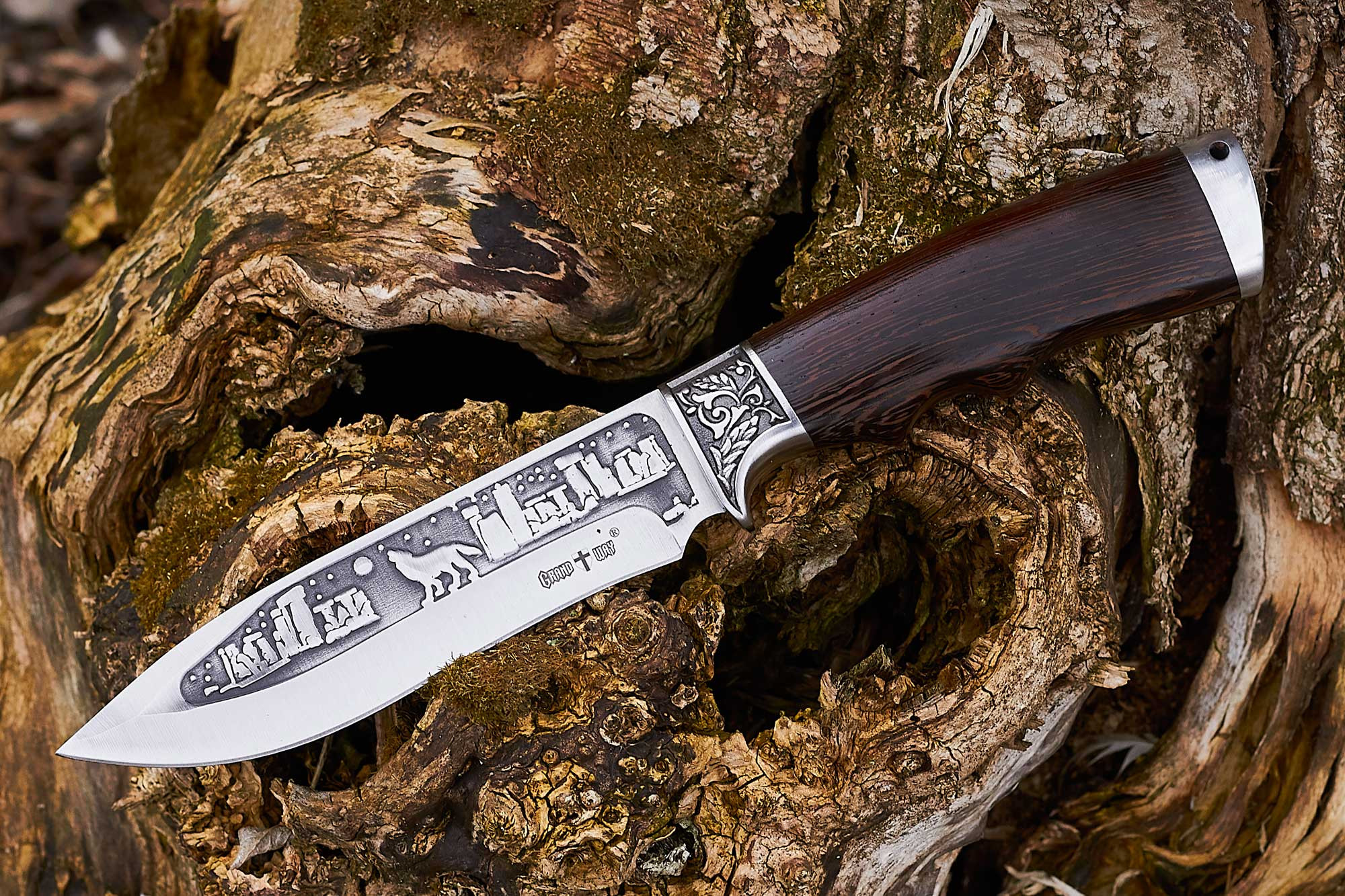 Яскравою та добре помітною прикрасою ножа є красивий декор клинка із зображеннями у мисливському стилі. Малюнок чіткий, симетричний та виконаний дуже красиво.