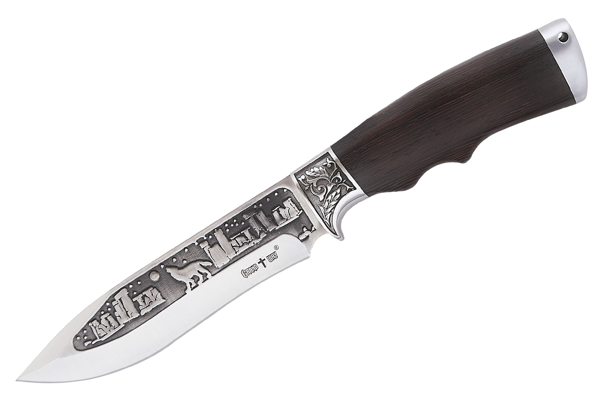 Яскравою та добре помітною прикрасою ножа є красивий декор клинка із зображеннями у мисливському стилі. Малюнок чіткий, симетричний та виконаний дуже красиво.
