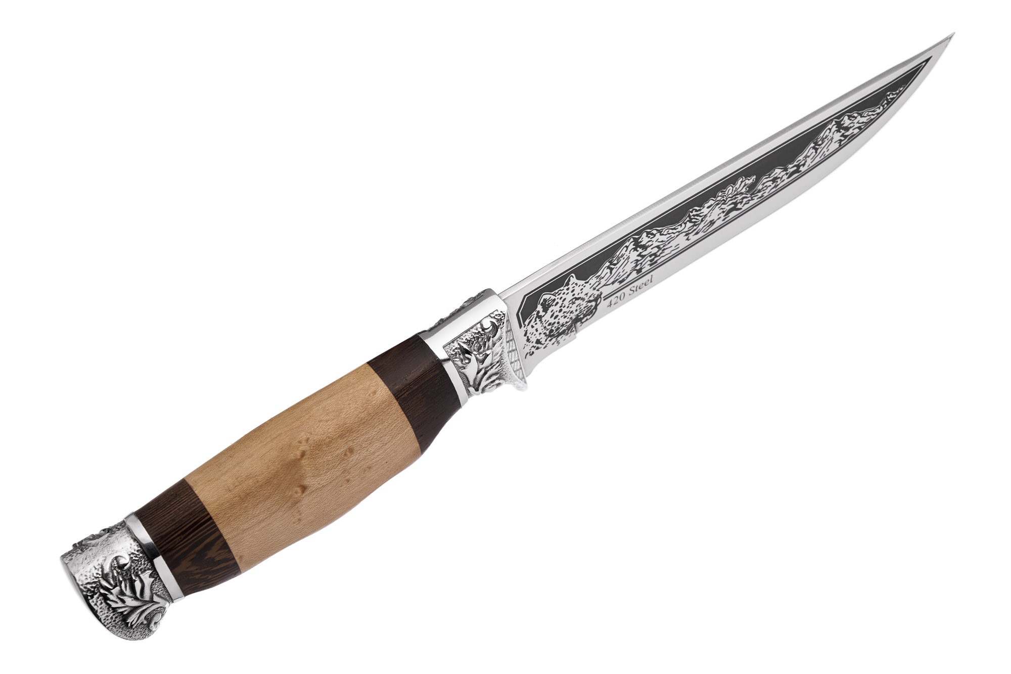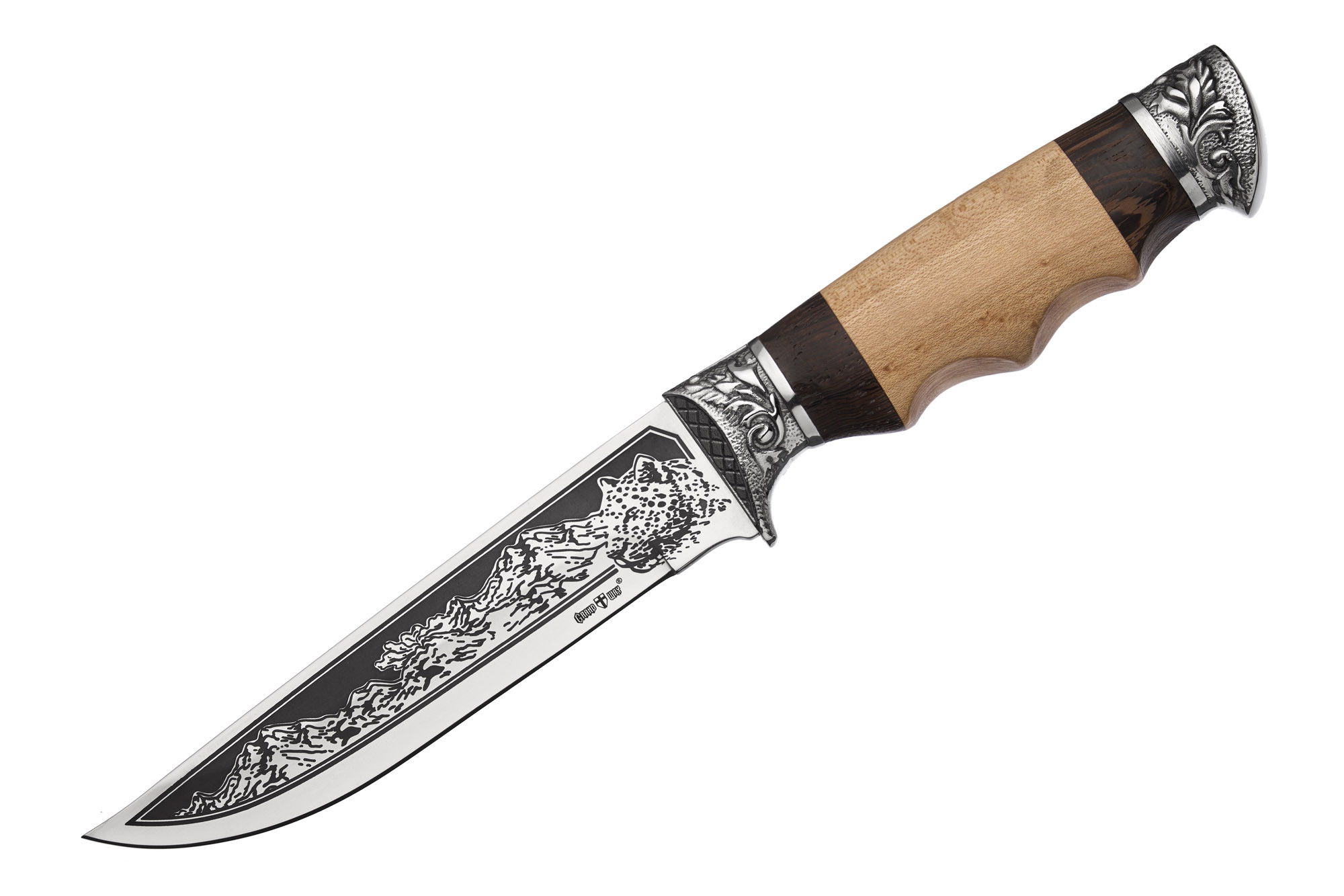 - Ергономічне руків'я із якісних порід деревини з металевими больстером та навершям, гарантує безпеку та зручність використання ножа;
