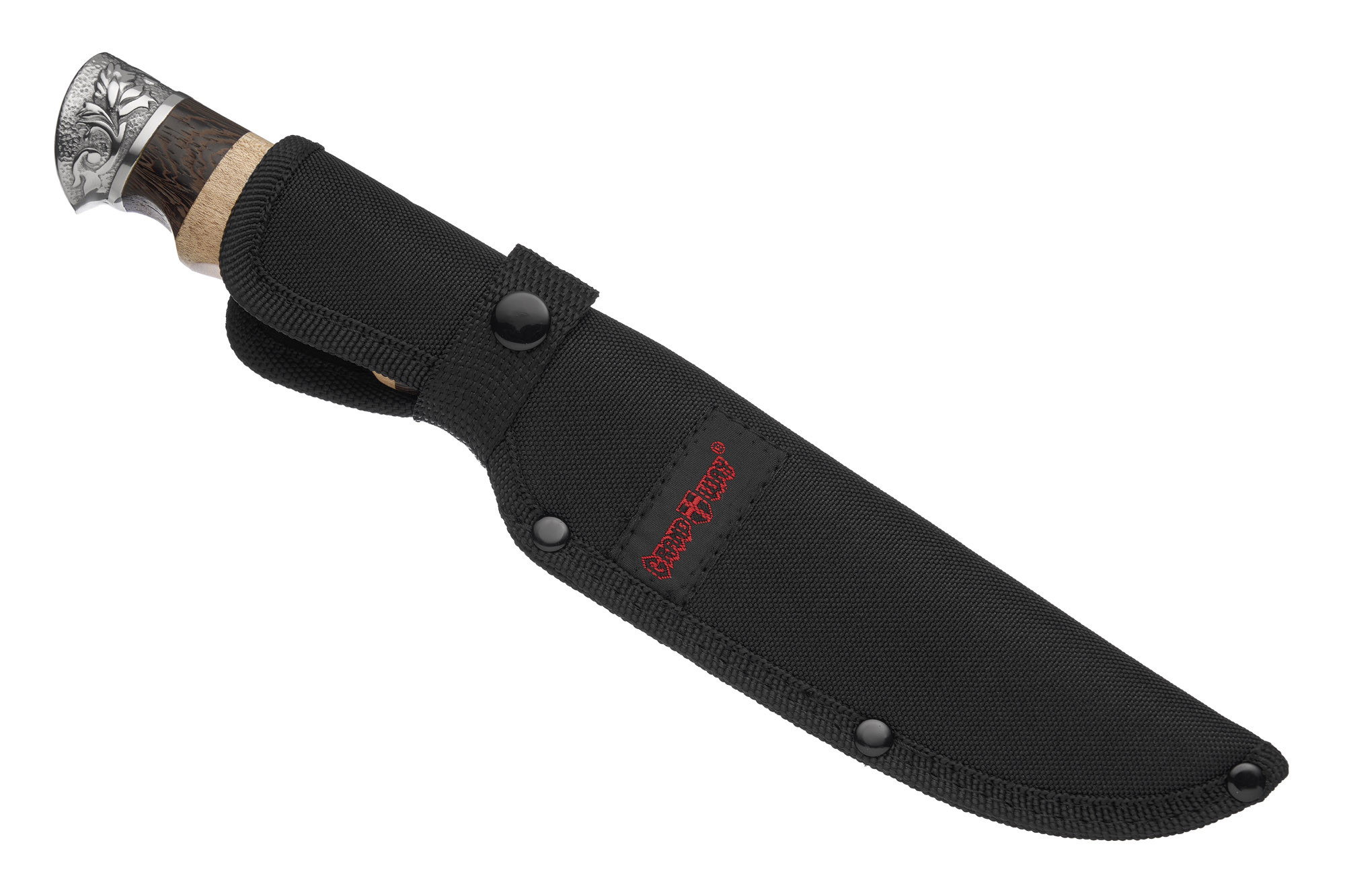 У комплекті з ножем ідуть міцні піхви з кордури. Широка шльовка дозволяє підвісити їх навіть на дуже широкий ремінь брюк.
