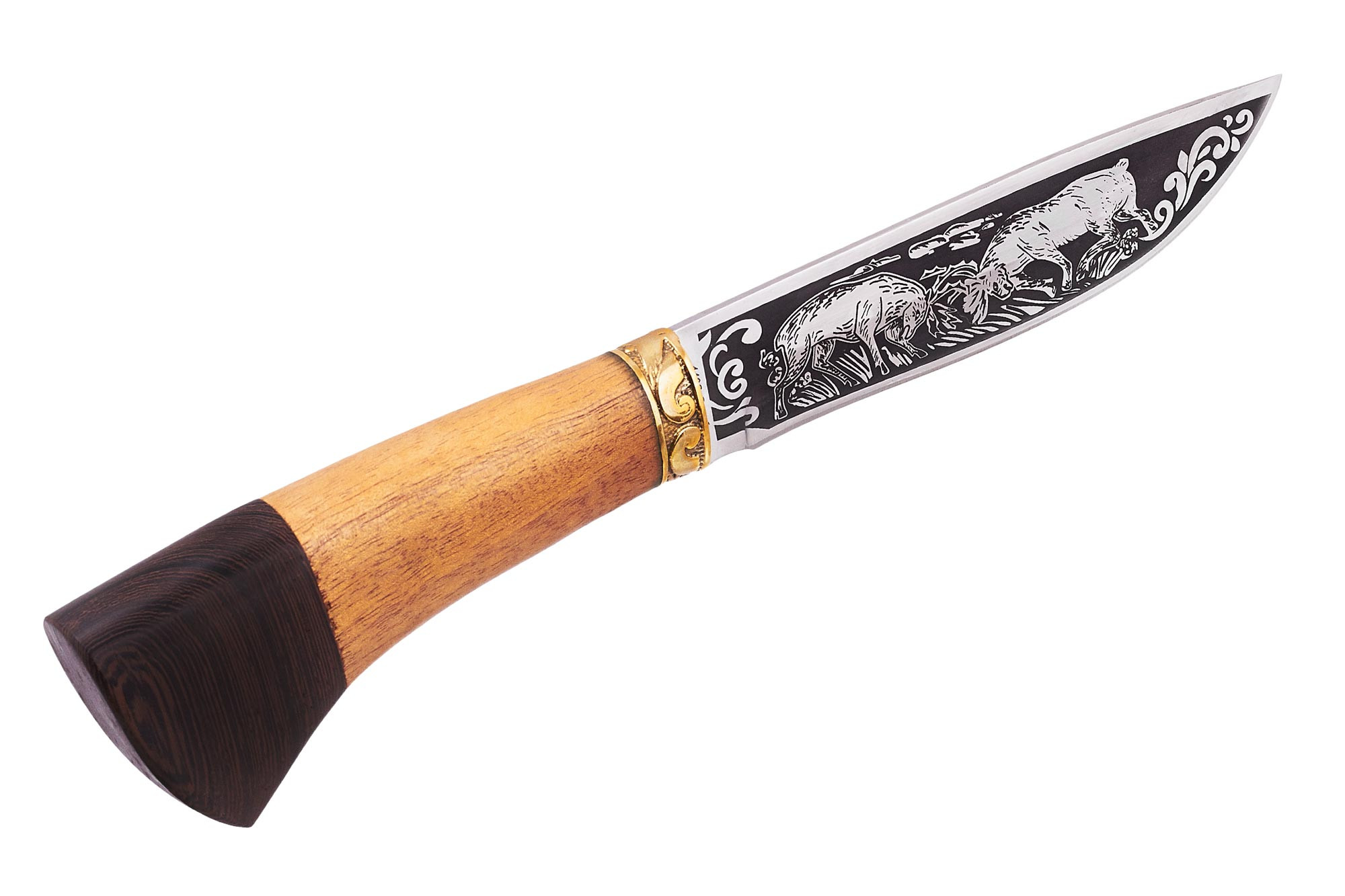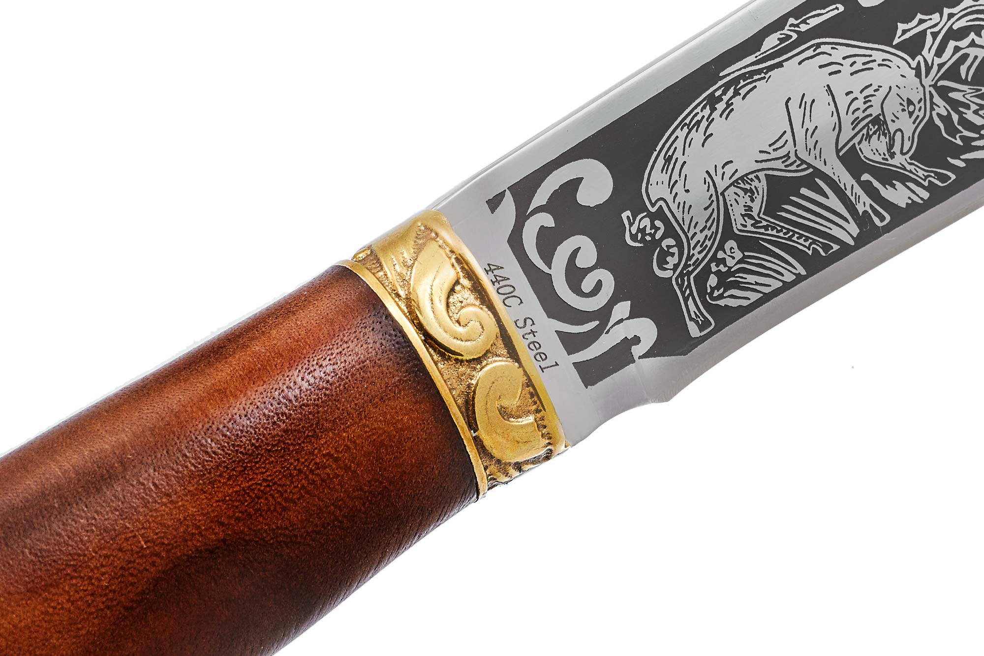 Клинок виготовлений із нержавіючої сталі 440 С, з твердістю в діапазоні 57-58 одиниць за Роквеллом. Він легко заточується в домашніх та польових умовах, серед інших його властивостей – стійкість до зносу, корозії та тривале збереження гостроти ріжучої кромки. На обох плоских поверхнях клинка виконані зображення на мисливську тематику та рослинні орнаменти.