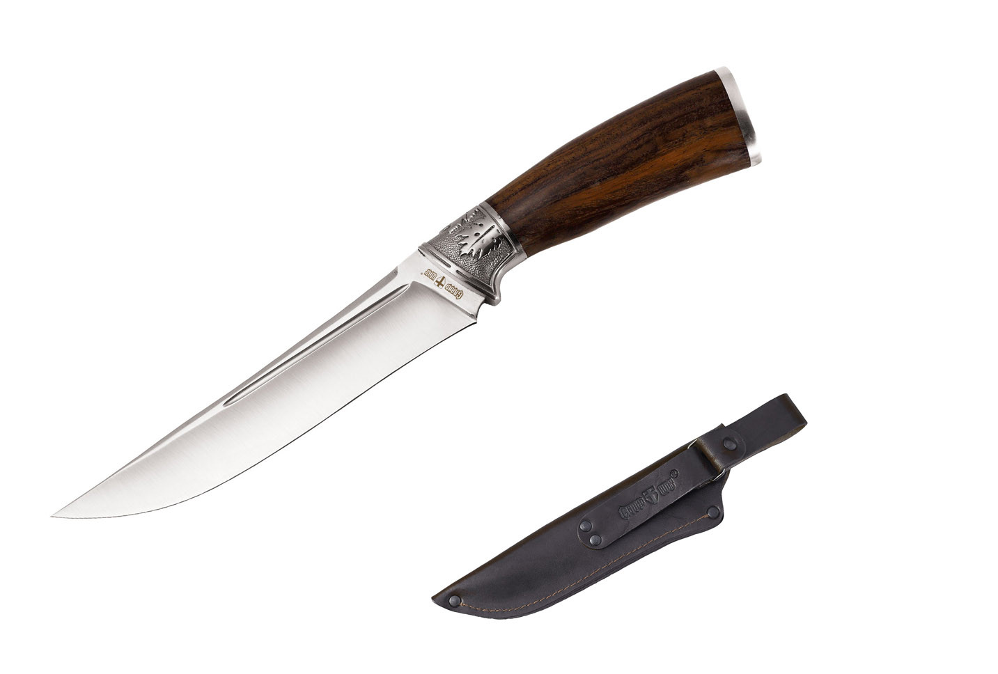Руків’я ножа виконане з металу та полірованого стабілізованого дерева. Воно зручно лежить у руці. Больстер дуже вдало оздоблений рослинним орнаментом.