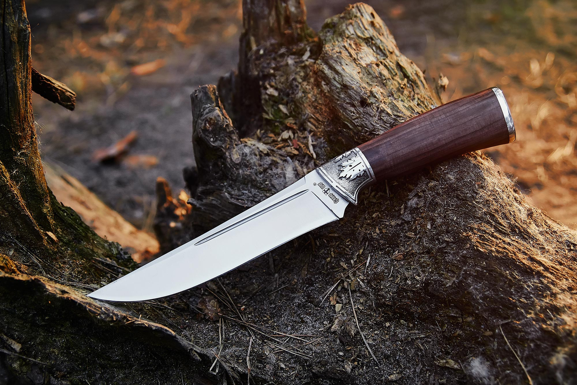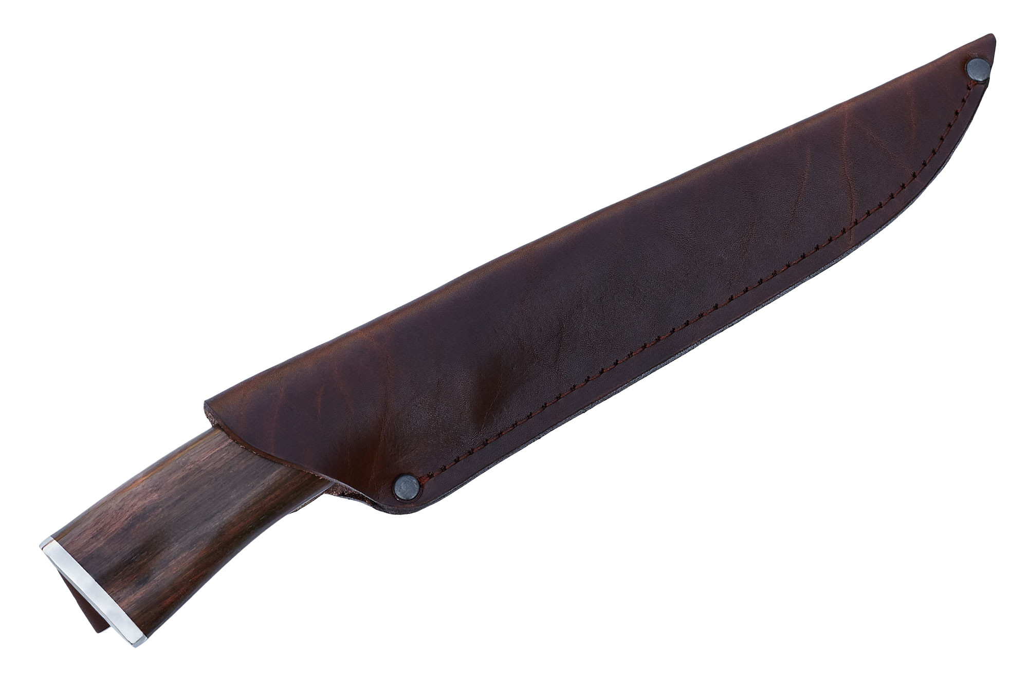 Рукоять ножа имеет идеальное сечение и прекрасно ложится в руку. Древесина используемая при изготовлении рукояти прошла предварительную обработку и устойчива к воздействию влаги, гниению и вредителей. Для комфортной работы ножом зимой, рукоять не имеет лакового покрытия , а для наибольшей сохранности, с обеих сторон защищена стальными больстерами.