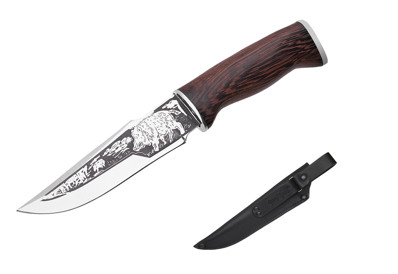 З лицьового боку, поверхня клинка прикрашає зображення кабана та інші малюнки на мисливську тематику, нанесені туди методом травлення. Дерев'яне руків'я, що зручно лежить у руці. Деревина пройшла обробку, що забезпечує вологостійкість.