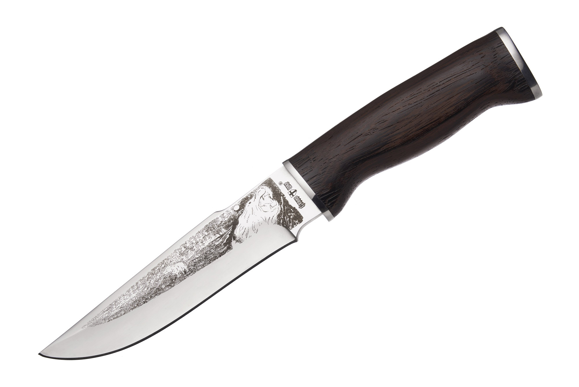 З лицьового боку, поверхня клинка прикрашає зображення кабана та інші малюнки на мисливську тематику, нанесені туди методом травлення. Дерев'яне руків'я, що зручно лежить у руці. Деревина пройшла обробку, що забезпечує вологостійкість.
