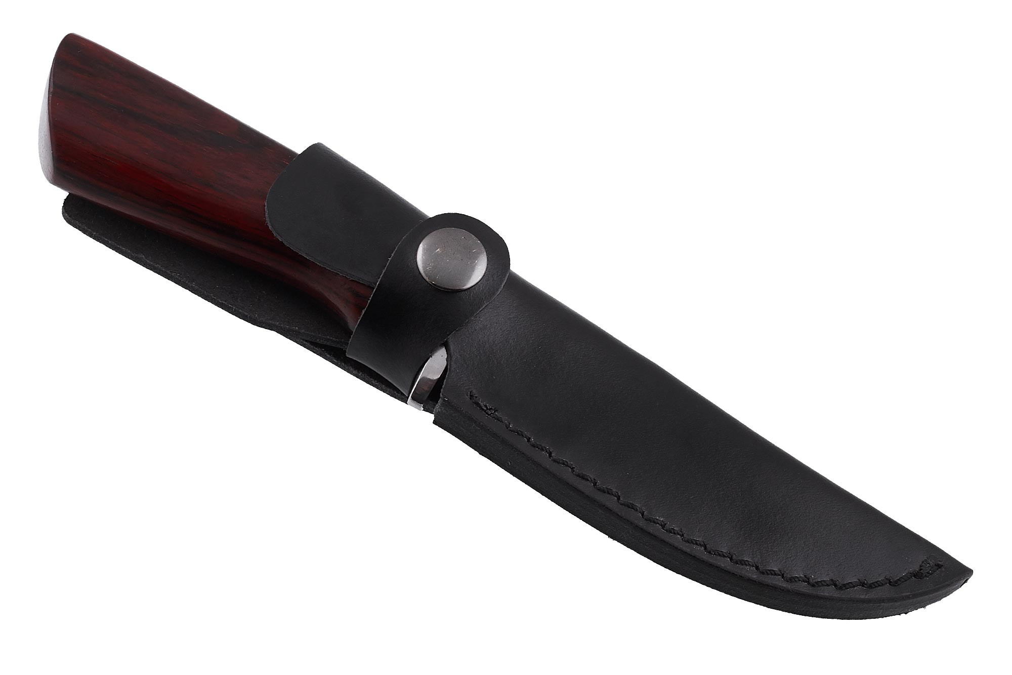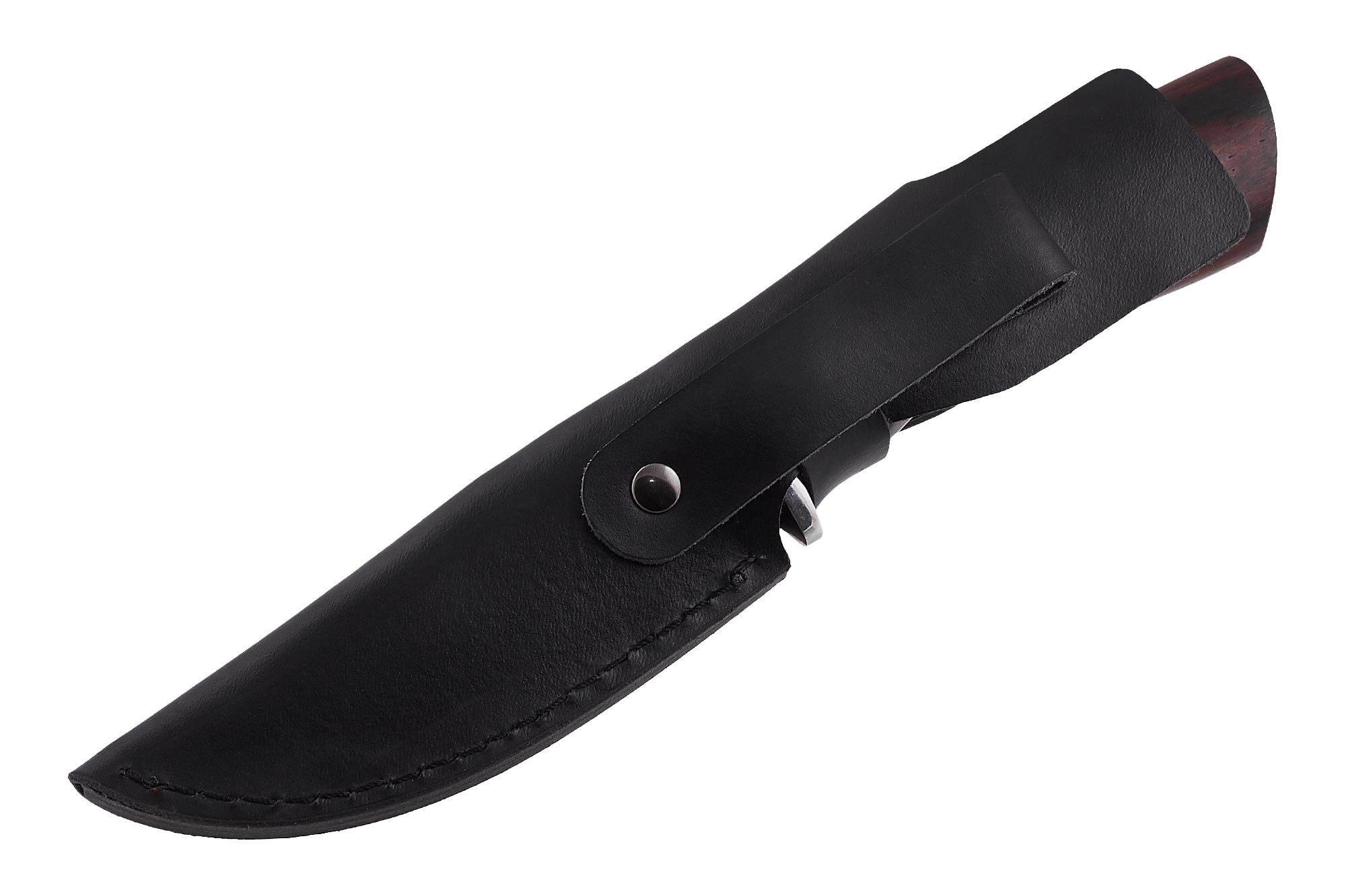 Нож охотничий 004 укомплектован практичными ножнами из натуральной кожи, которые удобно носятся и легко размещается на ремне.
