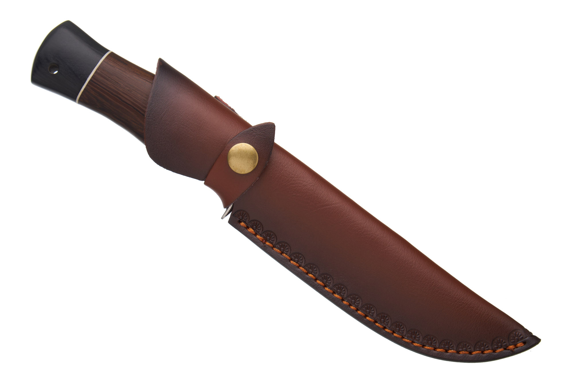 У комплекті з ножем ідуть міцні шкіряні піхви. Широка шльовка дозволяє підвісити їх навіть на дуже широкий ремінь брюк. Ніж у піхвах додатково фіксується застібкою на кнопці.
