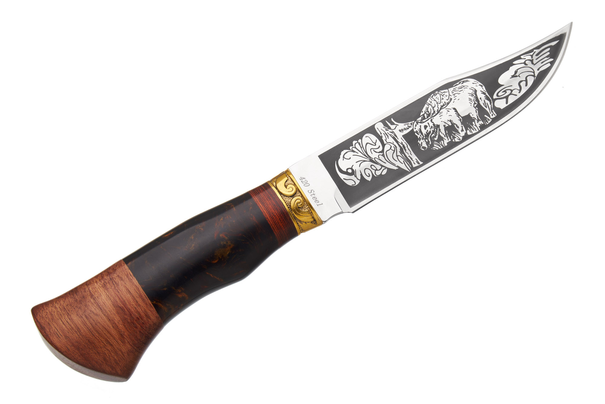 Клинок виготовлений із нержавіючої сталі марки 420. Цей сплав має багату історію та є доволі поширеним ножовим матеріалом. Однією з головних переваг цієї сталі є її виключно висока корозійна стійкість. Тому, наприклад, з нержавійки марки 420 часто роблять ножі для дайверів. Для мисливського ножа, що часто перебуває у умовах з підвищеною вологістю та постійно контактує з біологічними рідинами, такі якості також дуже корисні.