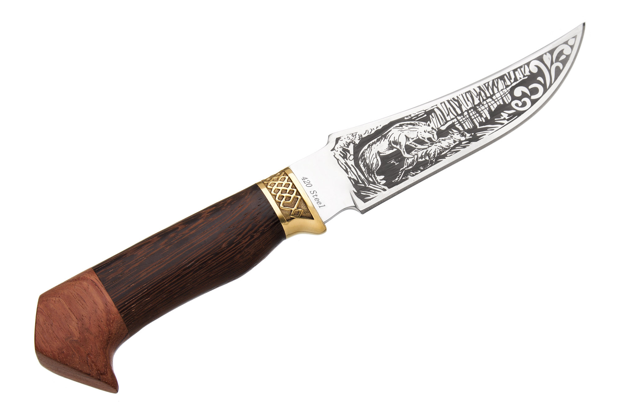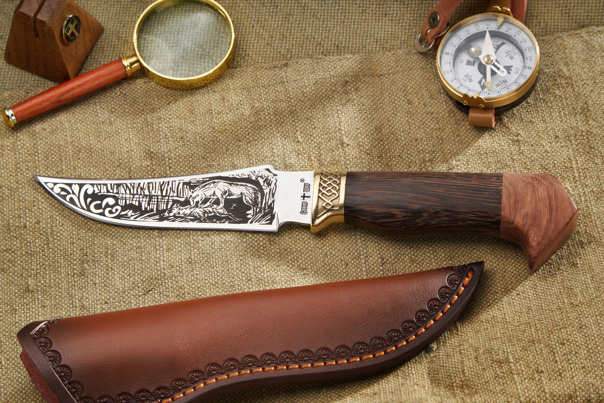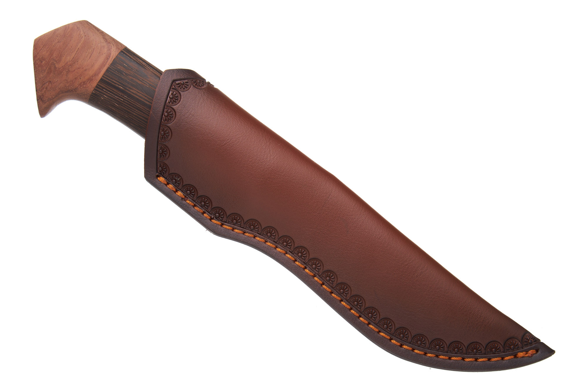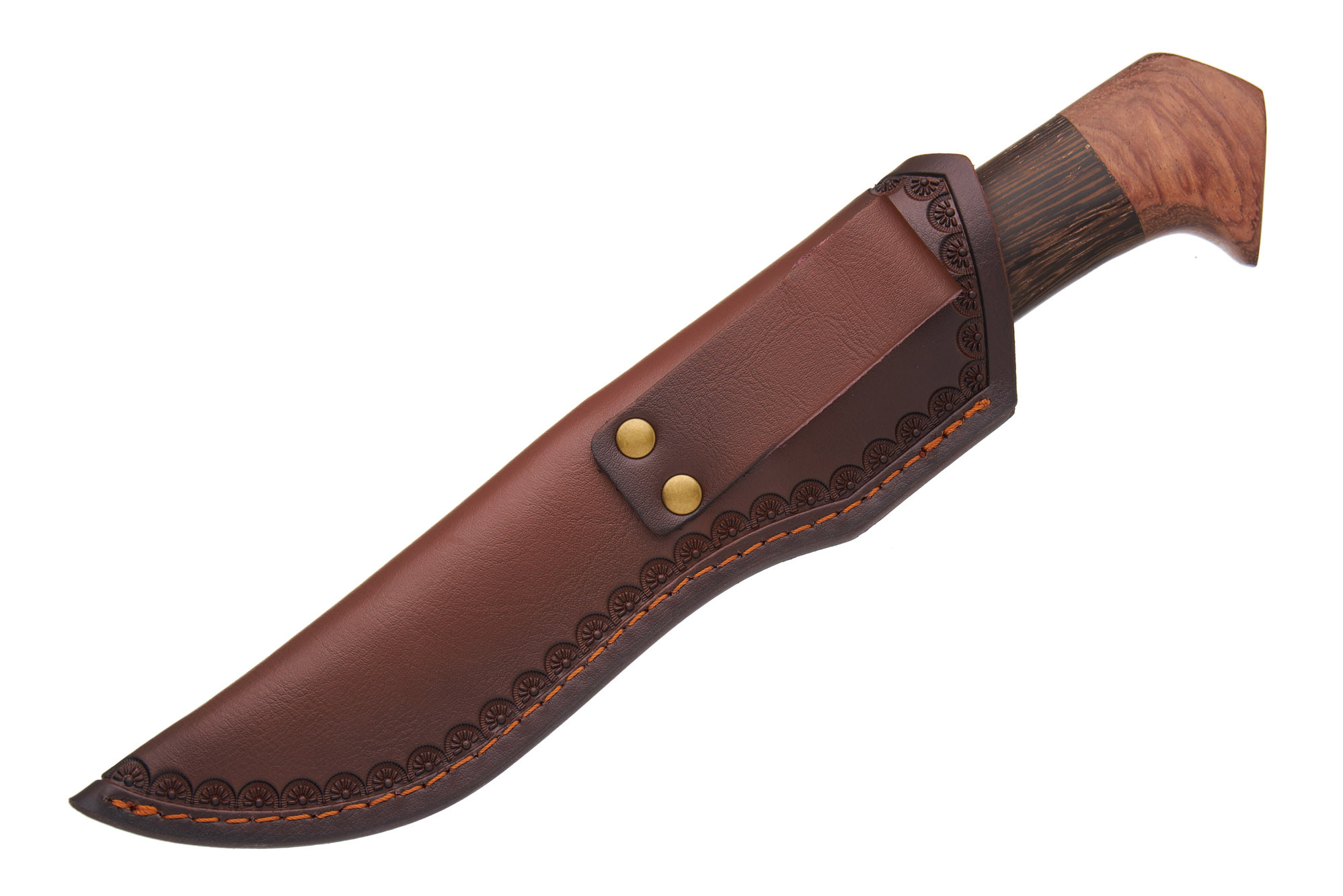 Деревина у якості матеріалу рукояті є не тільки красивим, але й приємним на дотик матеріалом. Воно не остигає на морозі, не розжарюється в спеку, має приємний для ока багатий колір та малюнок і чудово гармонує з декорованим прибором ножа. Больстер ножа має виступ-упор для руки, який ще більше підвищує надійність хвата ножа, та робить його зручним та безпечним навіть під час самої складної роботи.