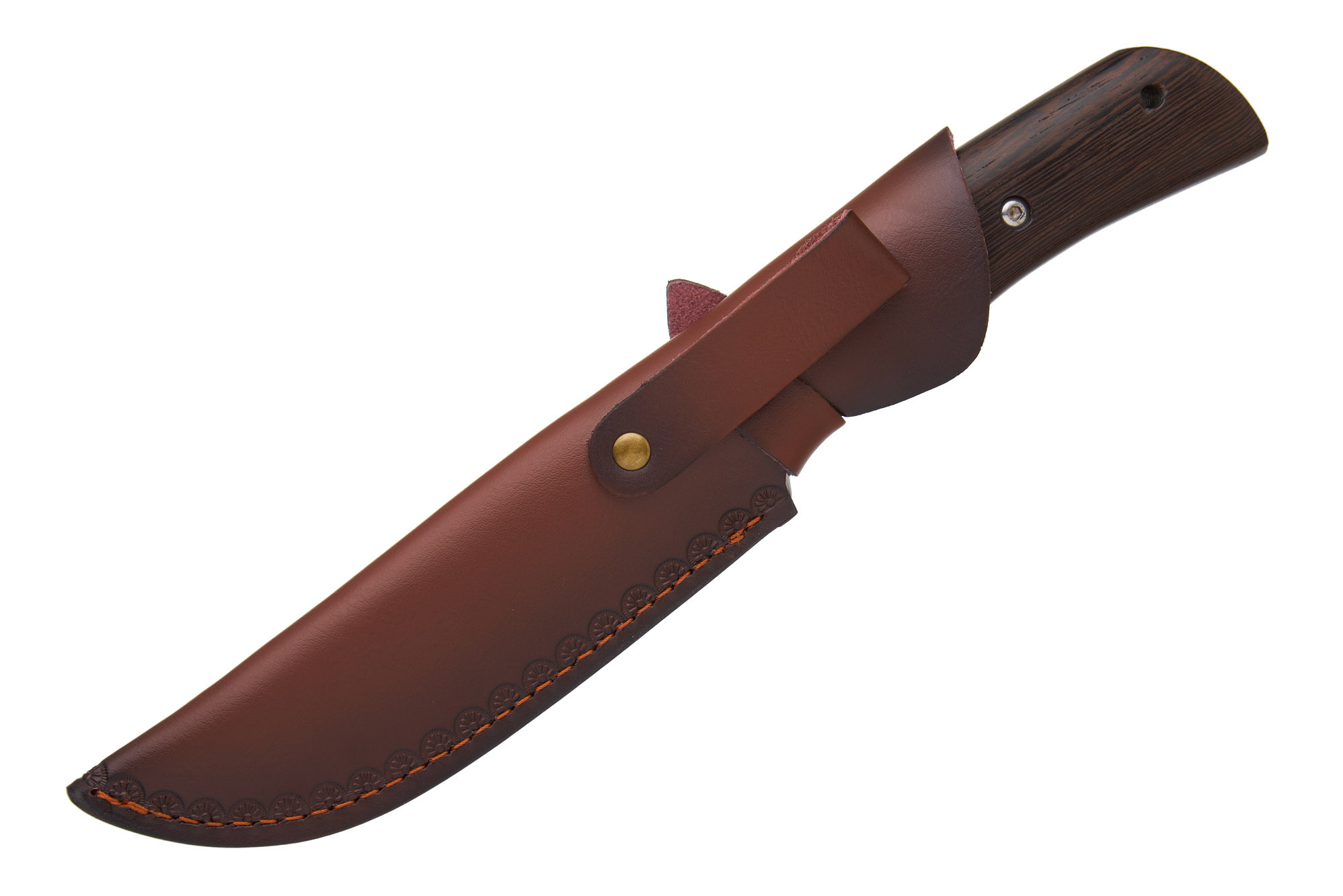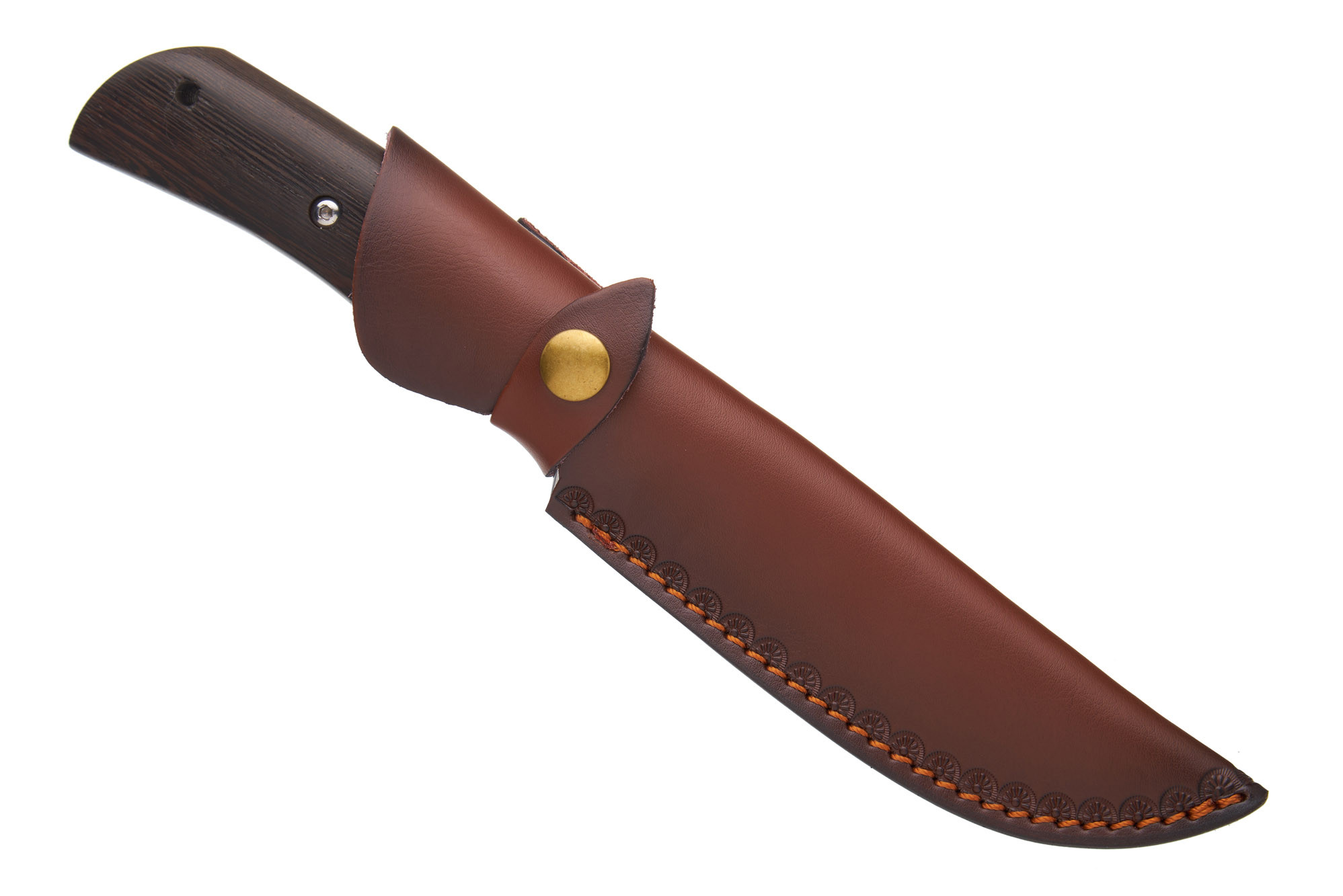 У комплекті з ножем ідуть міцні шкіряні піхви. Широка шльовка дозволяє підвісити їх навіть на дуже широкий ремінь брюк. Ніж у піхвах додатково фіксується застібкою на кнопці.