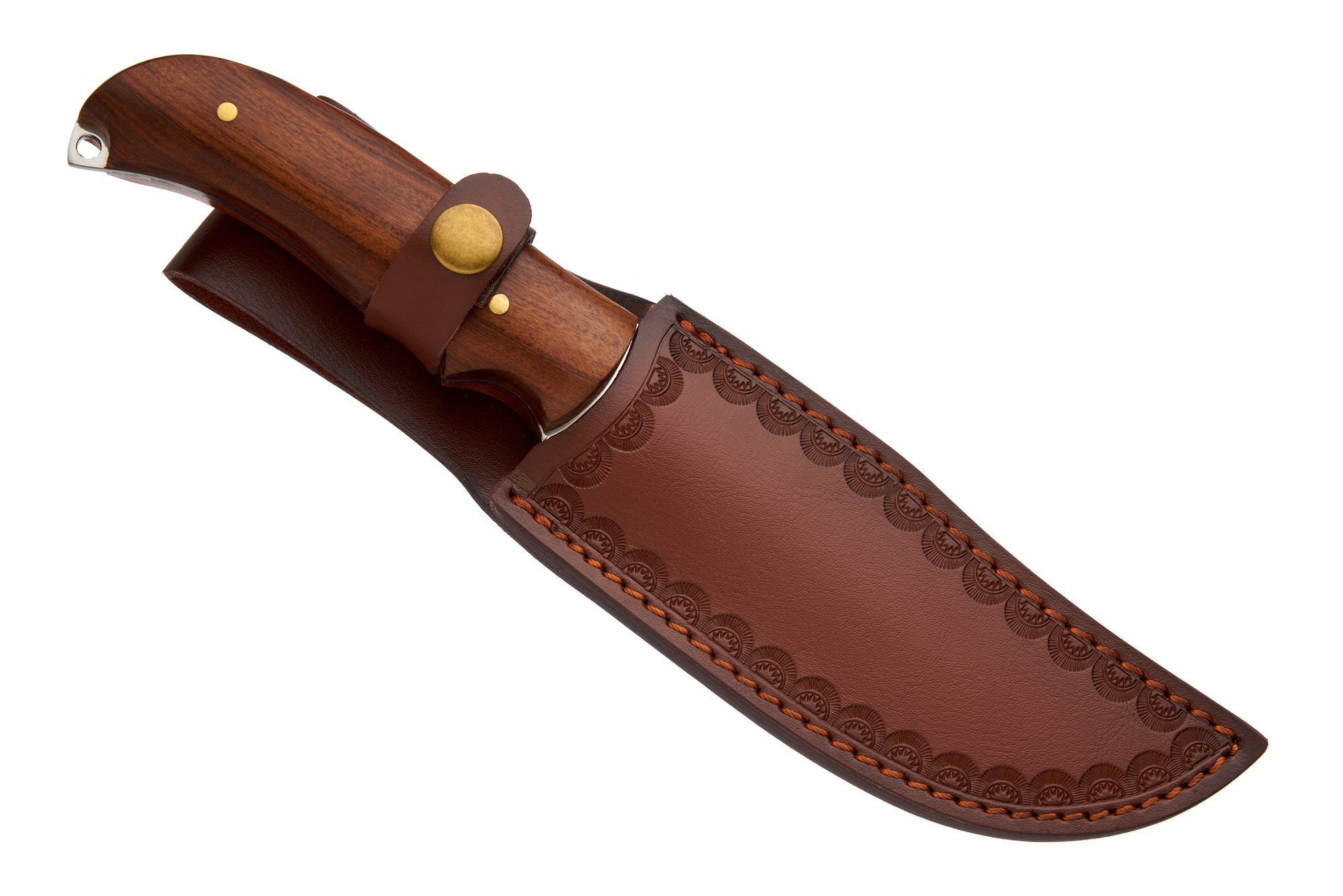 У комплекті з ножем ідуть міцні шкіряні піхви. Широка шльовка дозволяє підвісити їх навіть на дуже широкий ремінь брюк.