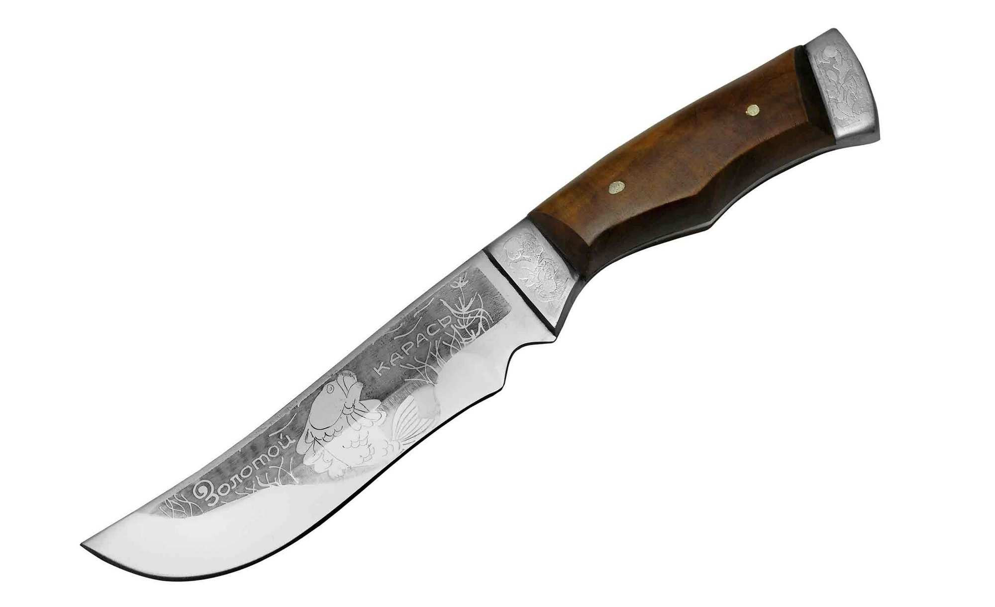 Рукоять ножа «Карась» выполнена из стали и натурального дерева, прошедшего обработку влагозащитной пропиткой, после которой можно не опасаться негативных воздействий воды и влажной окружающей среды.
