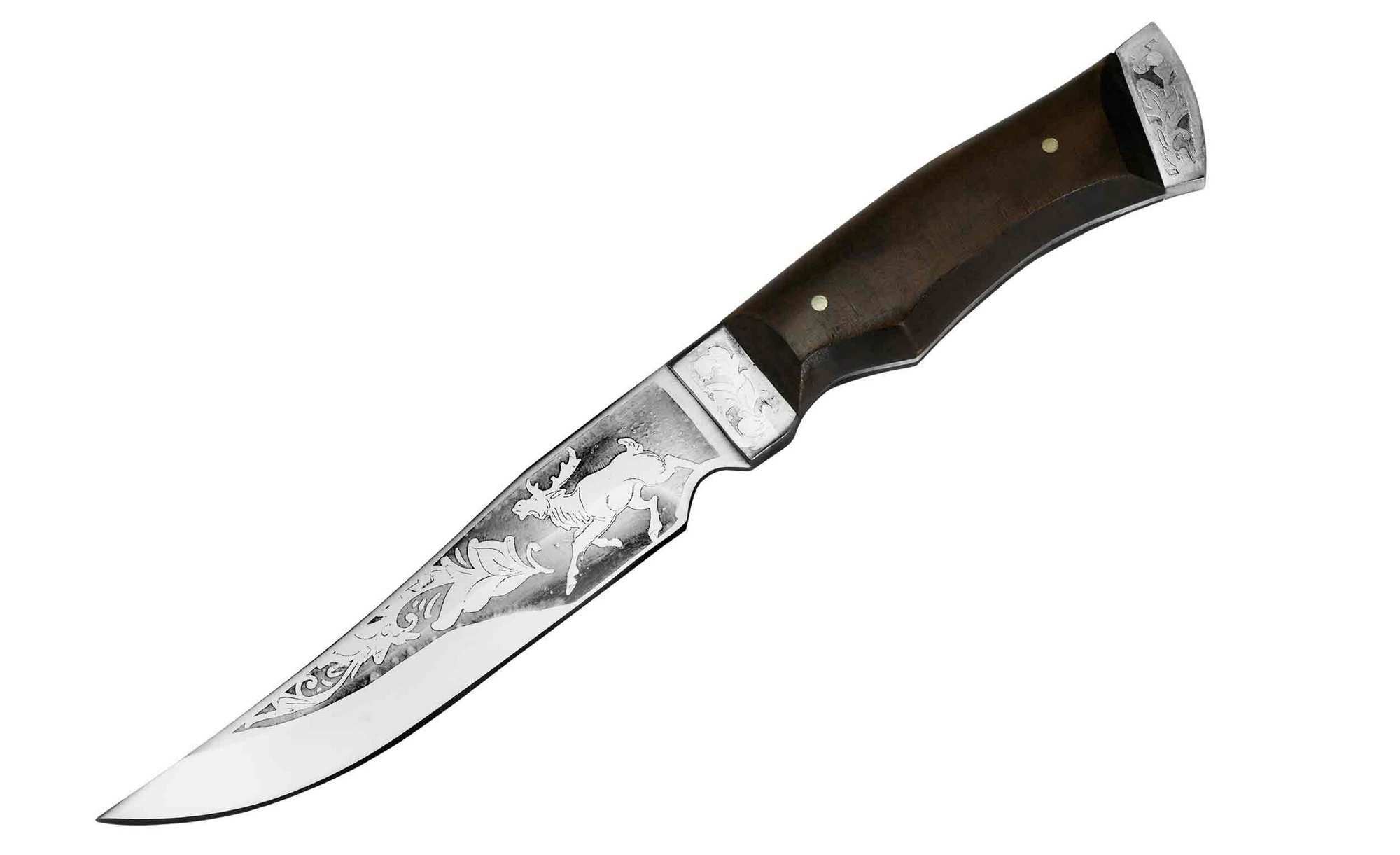 На плоских поверхностях клинка, методом травления, нанесено изображение лося – настоящего короля лесов в наших лесах, а также прочие тематические рисунки.