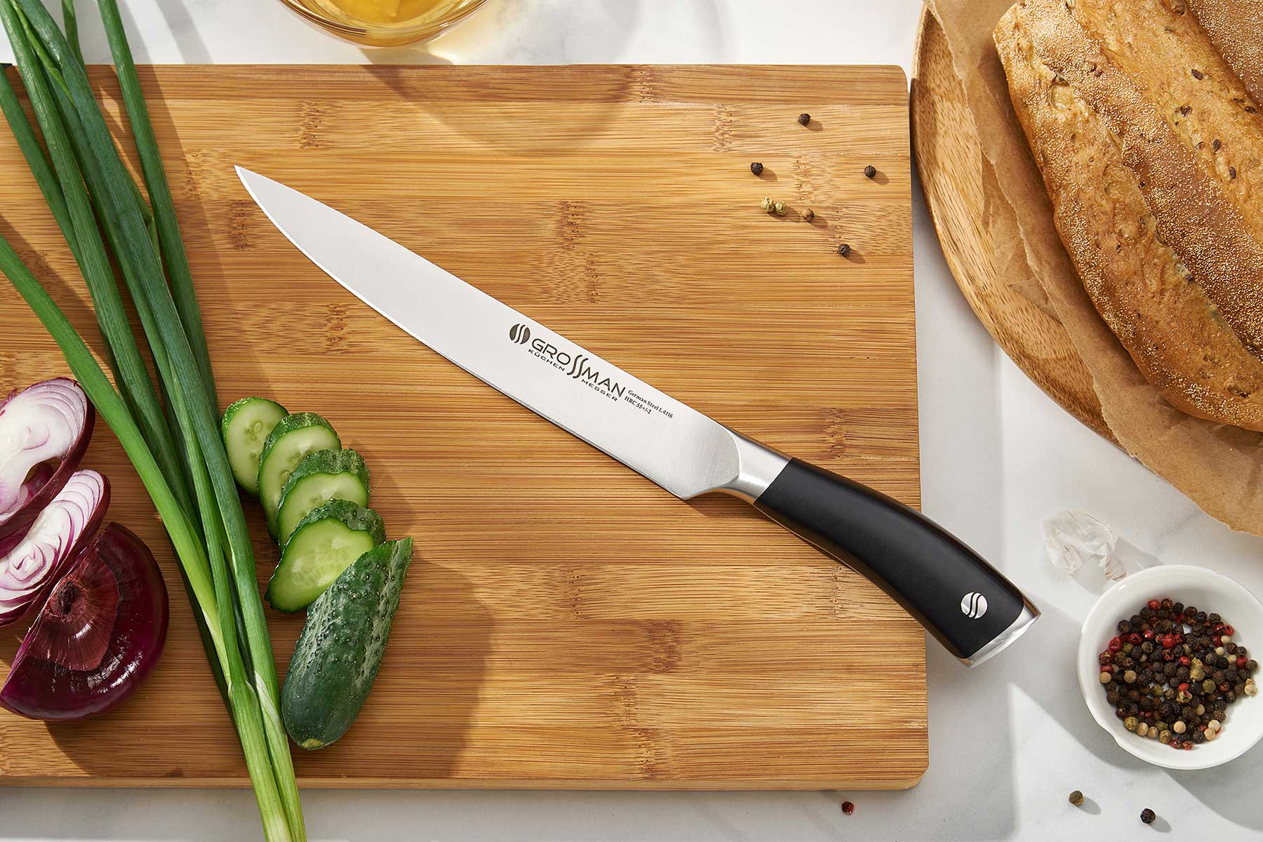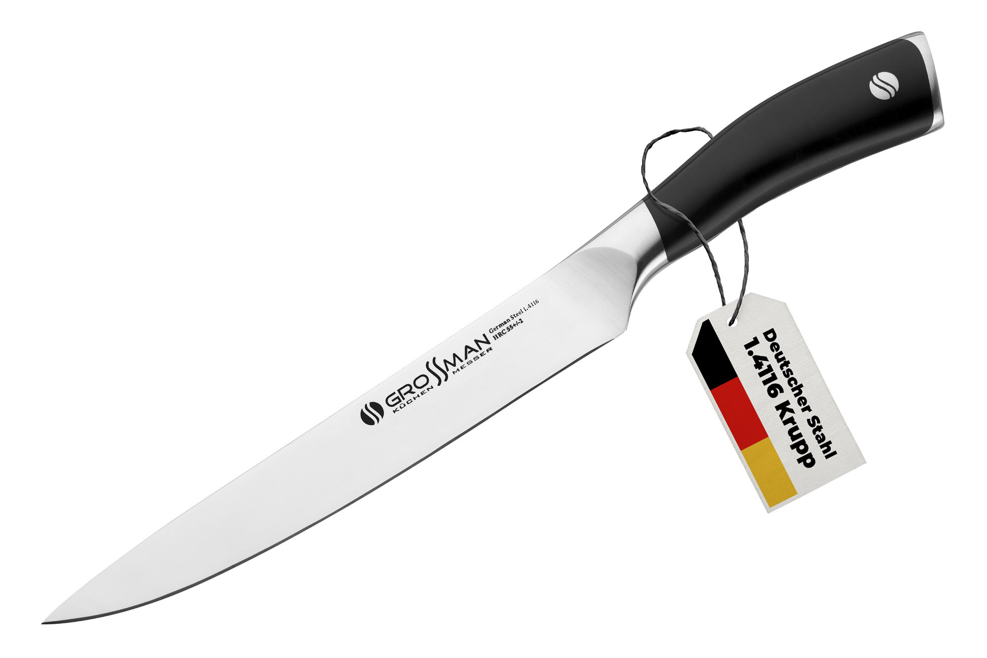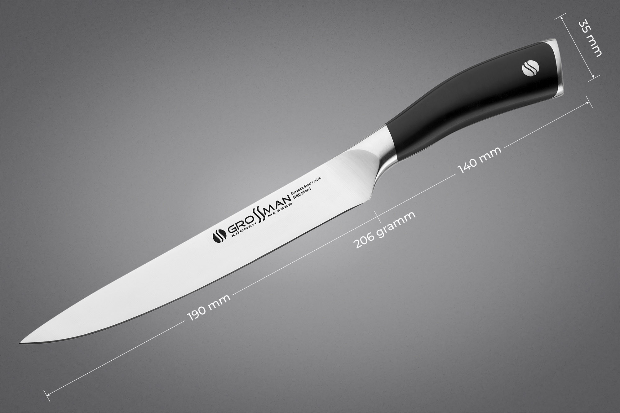 Звичайно, кожен кухар скаже, що кухонний ніж має бути якісним ножем. І нехай, на домашній кухні ковані ексклюзиви для профі найчастіше виглядають деякою надмірністю, все ж таки, розумним буде купити ніж для нарізки м'яса з якісної нержавіючої сталі за розумною ціною. І саме таким оптимальним варіантом, що поєднує розумну ціну та гідне виконання, є кухонні ножі від GROSSMAN.