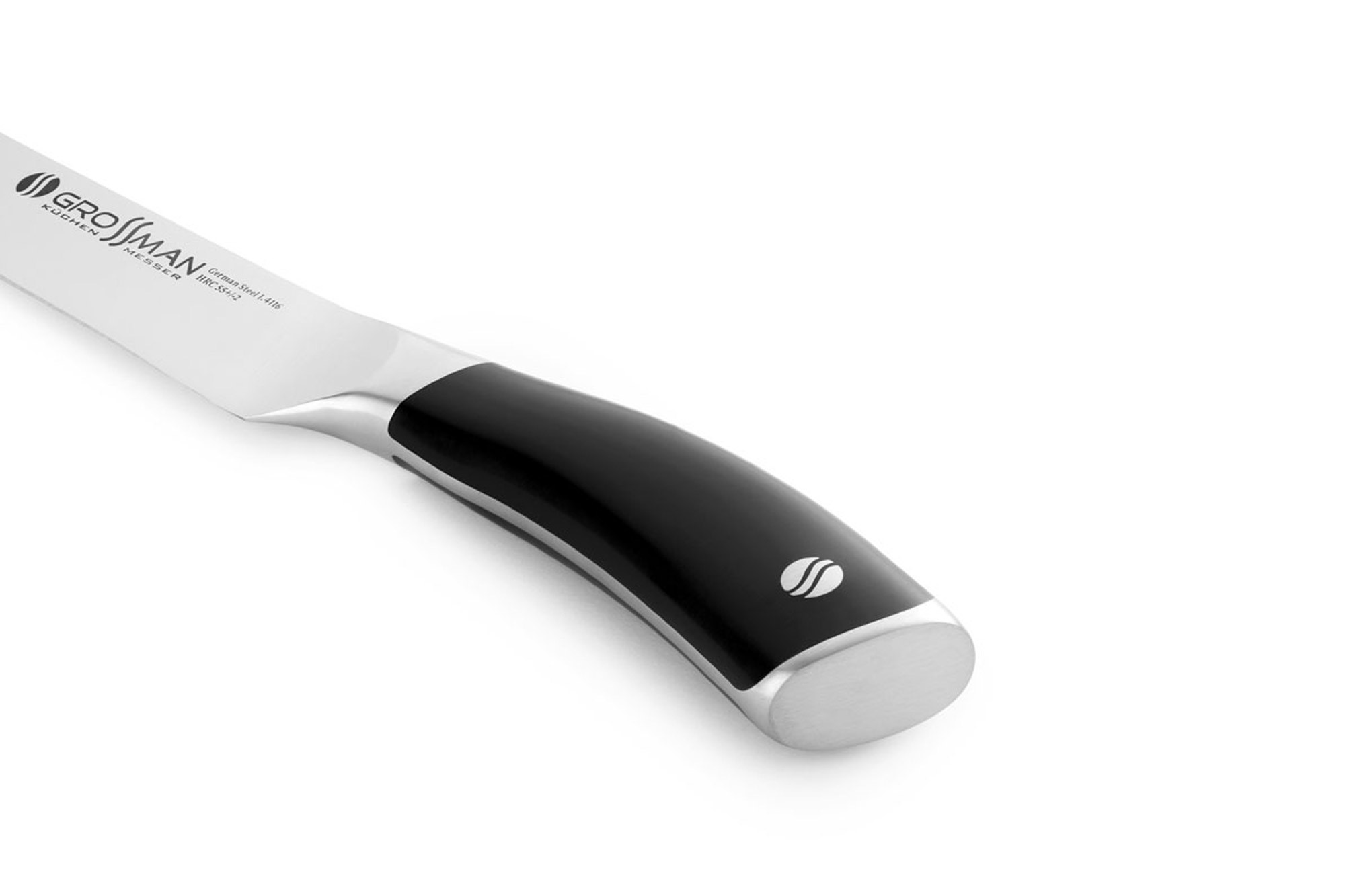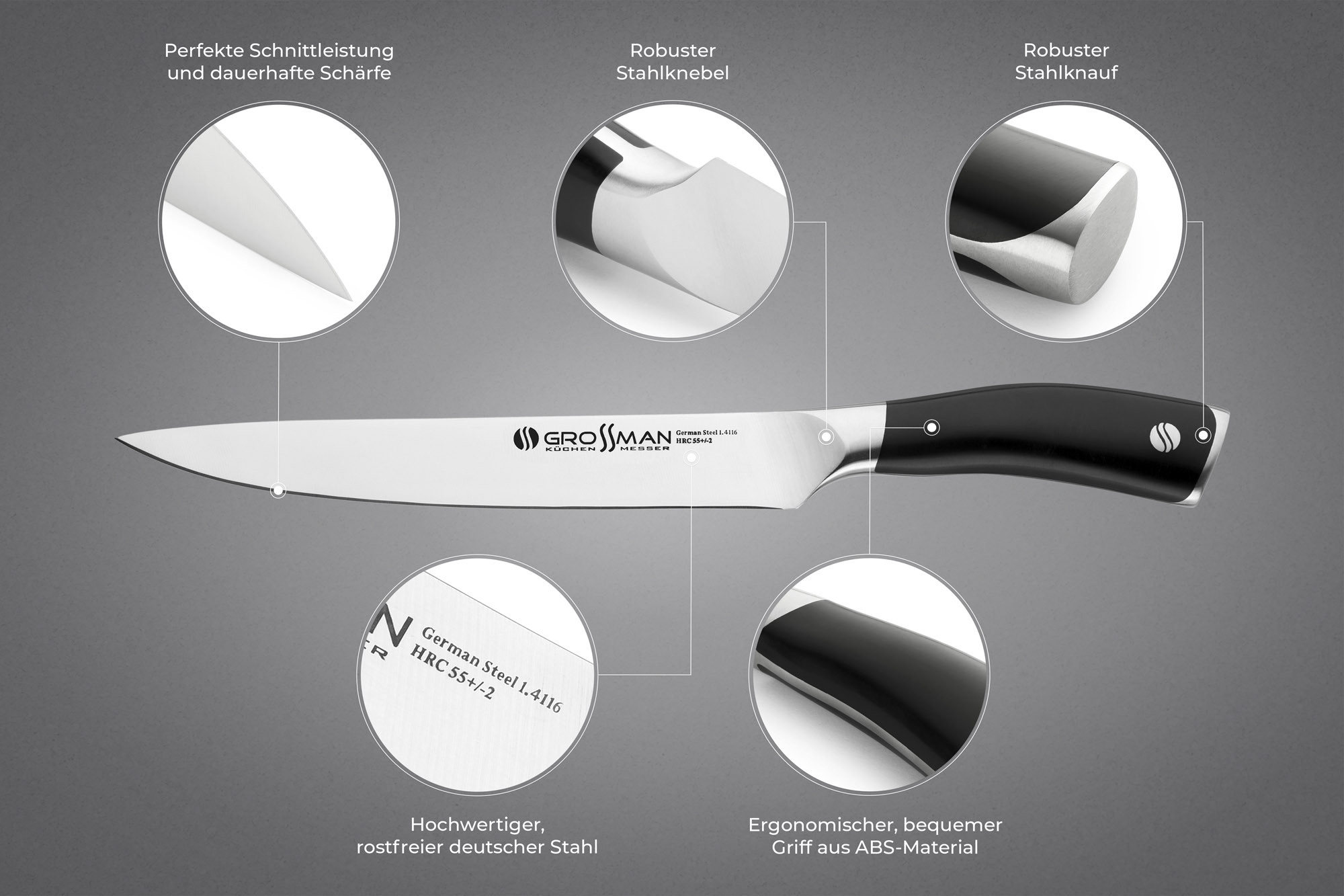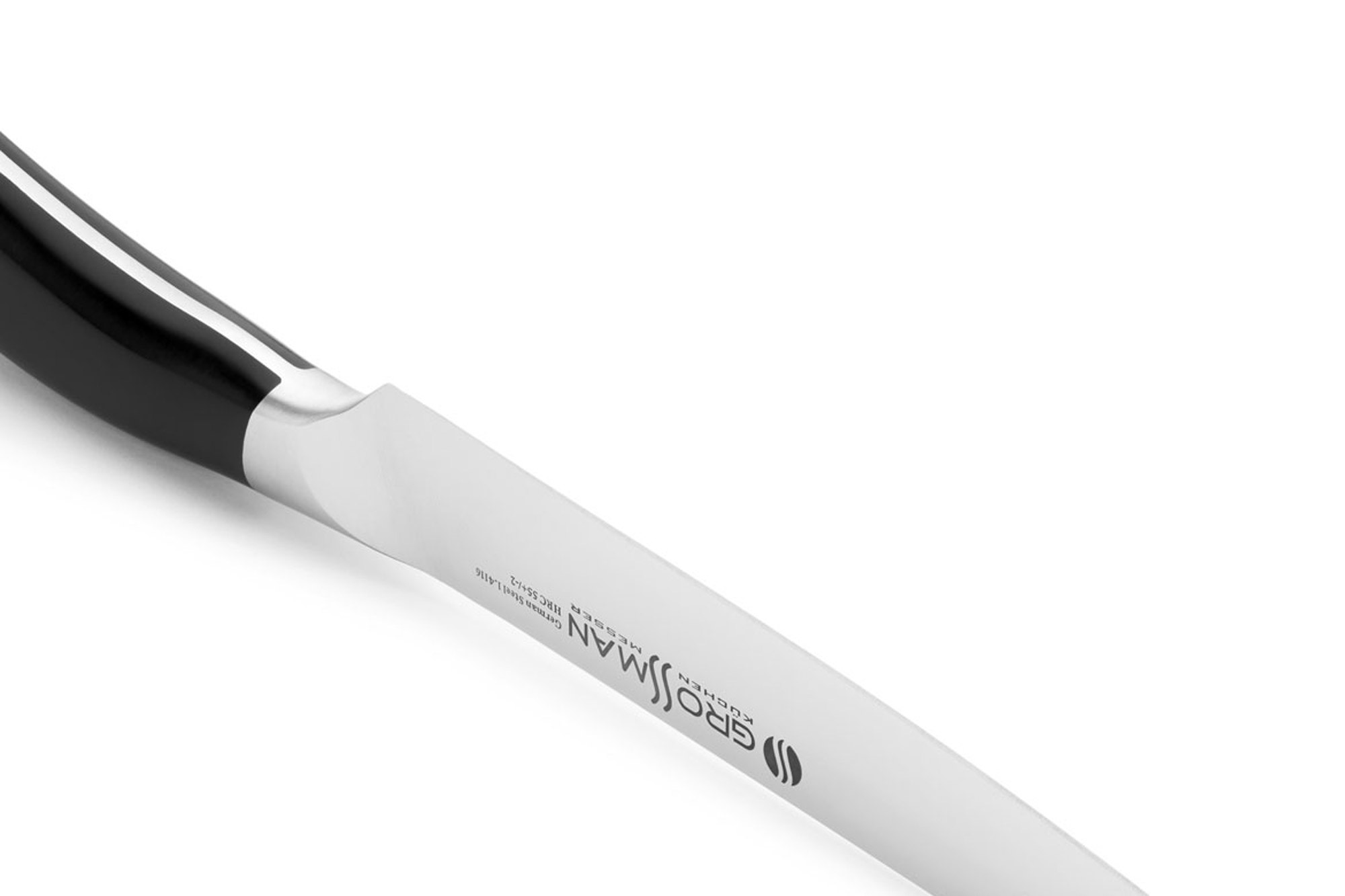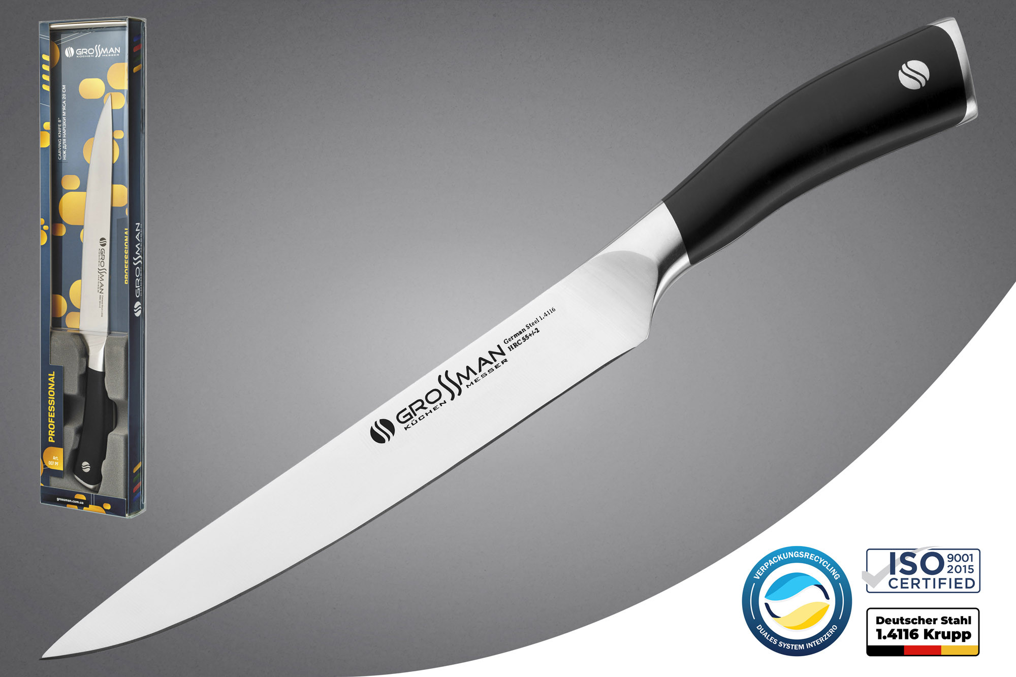 Звичайно, кожен кухар скаже, що кухонний ніж має бути якісним ножем. І нехай, на домашній кухні ковані ексклюзиви для профі найчастіше виглядають деякою надмірністю, все ж таки, розумним буде купити ніж для нарізки м'яса з якісної нержавіючої сталі за розумною ціною. І саме таким оптимальним варіантом, що поєднує розумну ціну та гідне виконання, є кухонні ножі від GROSSMAN.