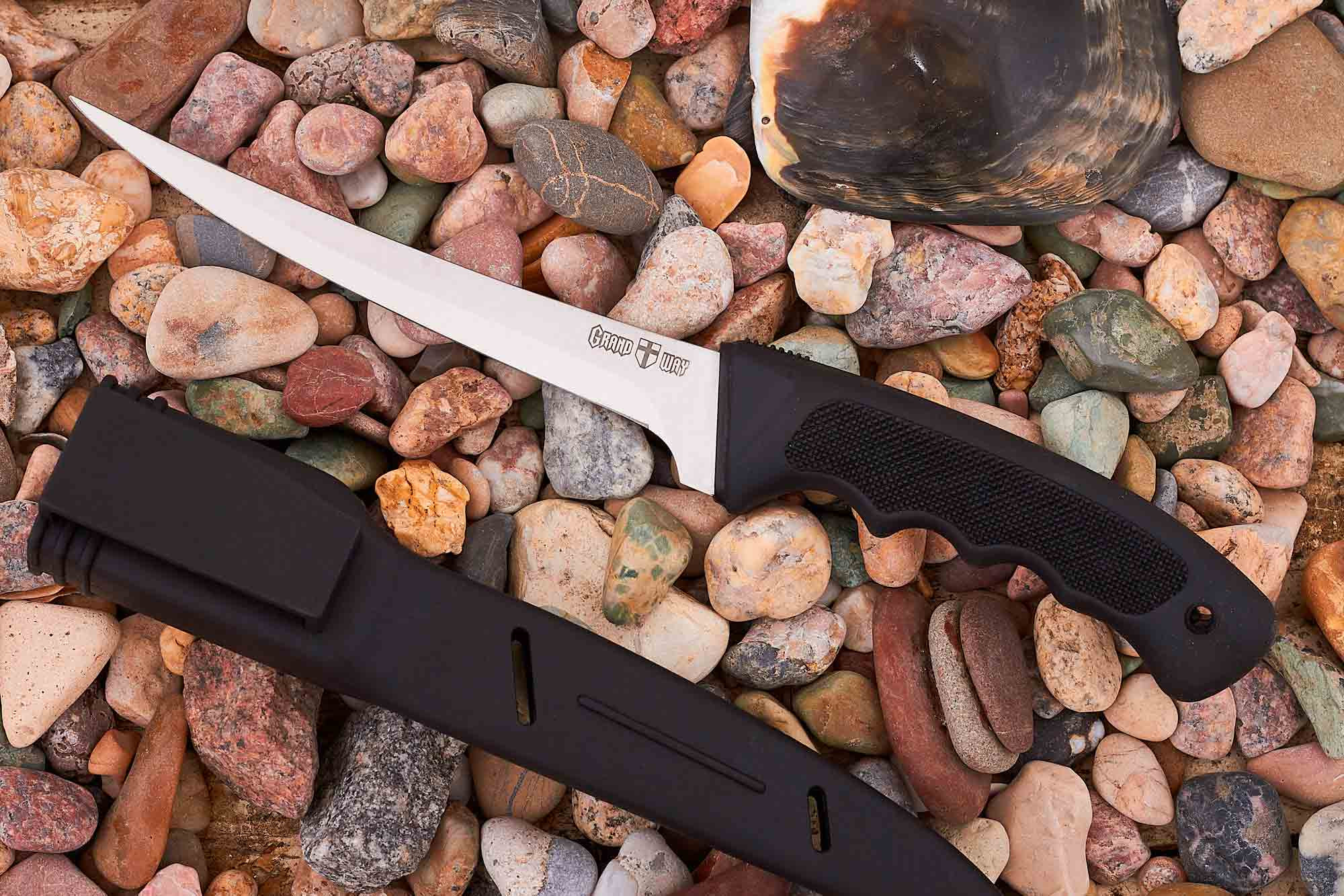 В комплект поставки ножа входят пластиковые ножны с ременной скобой, с помощью которой, ножны возможно закрепить на поясном ремне. Ножны снабжены дренажными и вентиляционными отверстиями, что для рыбацкого ножа, работающего в условиях повышенной влажности - несомненный, большой плюс. Отличный рыбацкий многоцелевой нож. Рукоять из эластрона, удобные ножны – вот те моменты, на которые стоит обратить внимание в модели рыбацкого ножа Grand Way 18208.