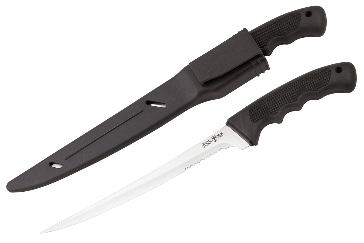 Отличный рыбацкий многоцелевой нож. Рукоять из эластрона, серрейтор, удобные ножны – вот те моменты, на которые стоит обратить внимание в модели Grand Way 18209. В комплект поставки ножа входят пластиковые ножны с ременной скобой, с помощью которой, ножны возможно закрепить на поясном ремне. Ножны снабжены дренажными и вентиляционными отверстиями, что для рыбацкого ножа, работающего в условиях повышенной влажности - несомненный, большой плюс.