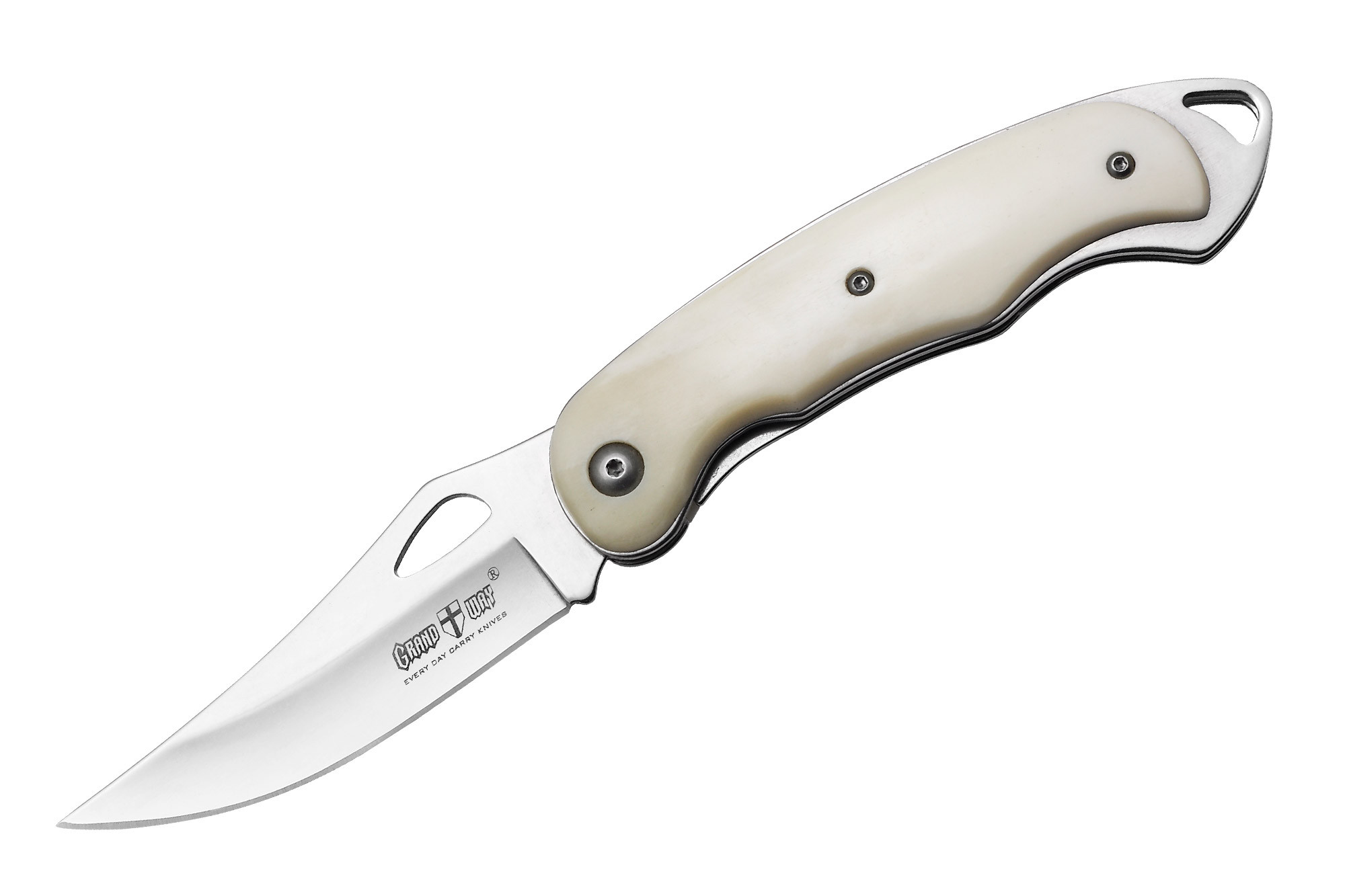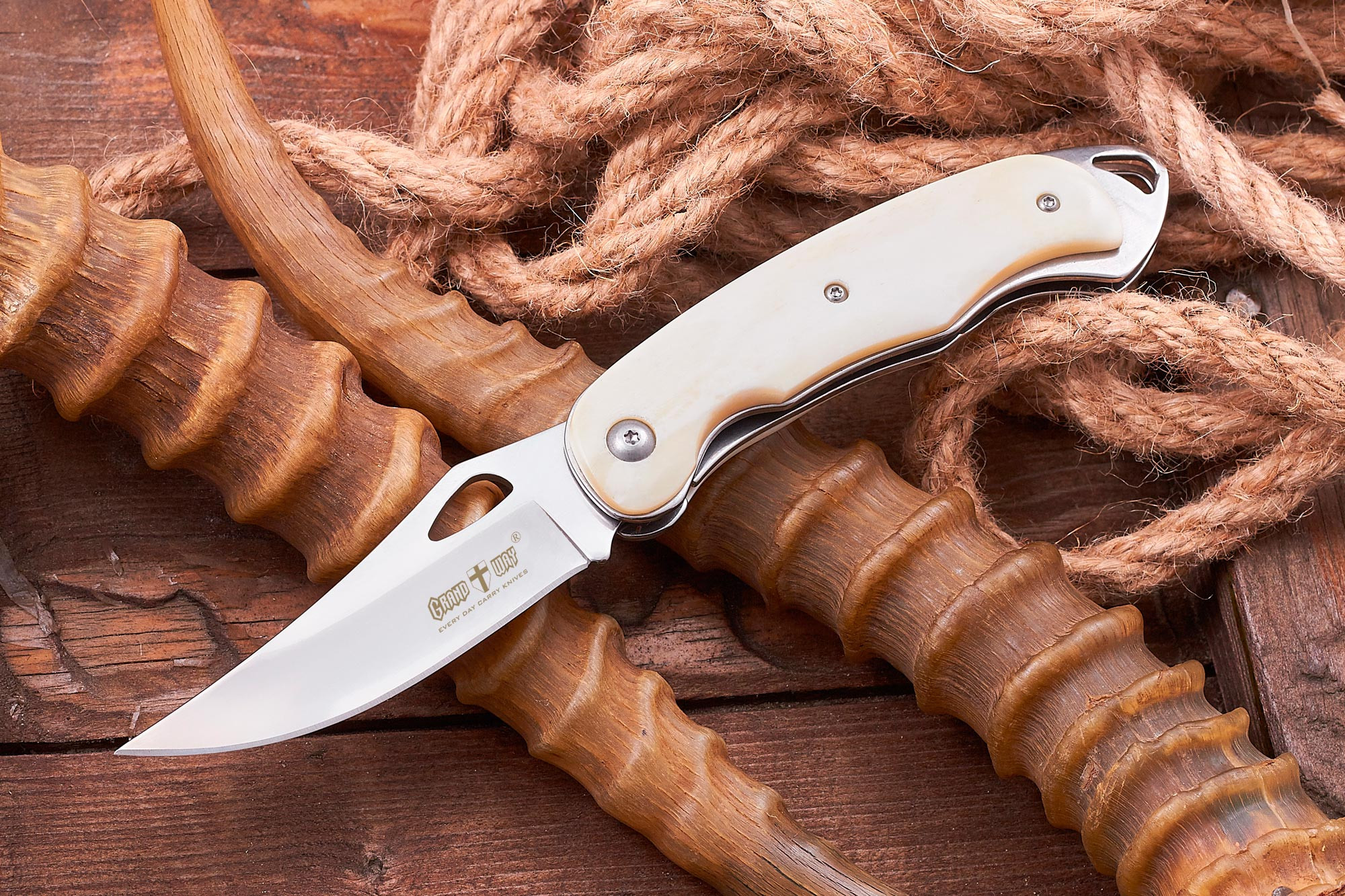 Складной нож с костяной рукояткой с клинком из 420 стали. Сталь марки 420 - это отработанная в производстве нержавеющая сталь бюджетного сегмента. Относительно небольшое содержание углерода делает эту сталь вязкой и исключительно стойкой к ржавчине. Небольшое содержание углерода также положительно влияет и на прочность: такая сталь менее хрупкая. Возможно, лезвия таких ножей тупятся чуть быстрее более дорогих марок, но и точится она тоже очень легко и буквально на всем: мусаты, любые точильные камни и даже V-образные точилки без усилий приведут затупившийся нож в боевую форму без затруднений, а твердости хватит с избытком для бытовых задач.