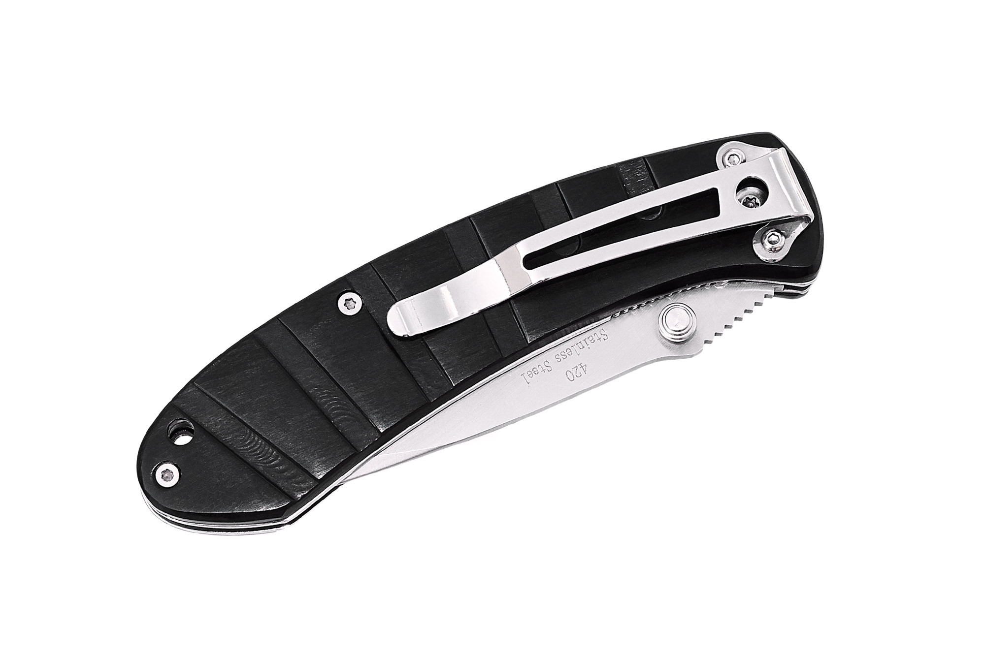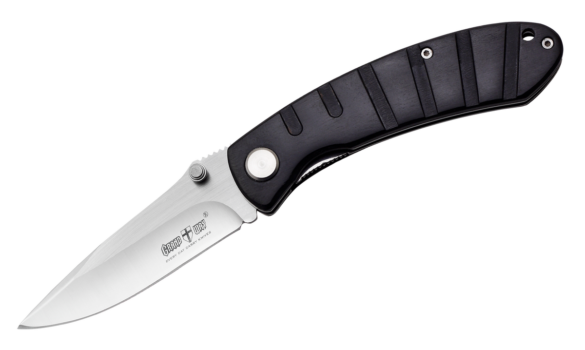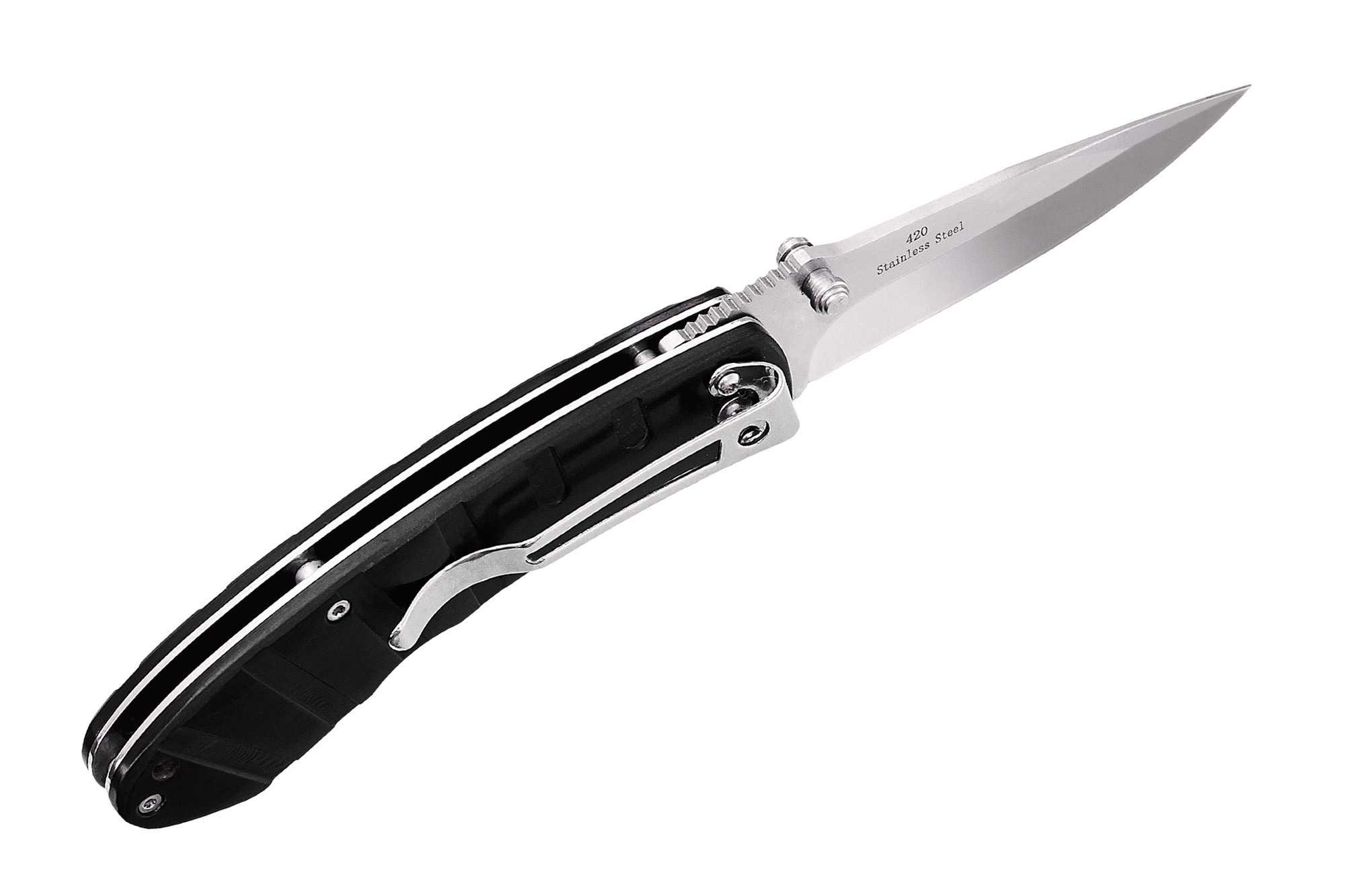 Складной нож с изогнутой рукоятью обтекаемой формы, с клинком из 420 стали. Сталь марки 420 - это отработанная в производстве нержавеющая сталь бюджетного сегмента. Относительно небольшое содержание углерода делает эту сталь вязкой и исключительно стойкой к ржавчине. Небольшое содержание углерода также положительно влияет и на прочность: такая сталь менее хрупкая. Возможно, лезвия таких ножей тупятся чуть быстрее более дорогих марок, но и точится она тоже очень легко и буквально на всем - мусаты, любые точильные камни и даже V-образные точилки без усилий приведут затупившийся нож в боевую форму без затруднений, а твердости хватит с избытком для бытовых задач.