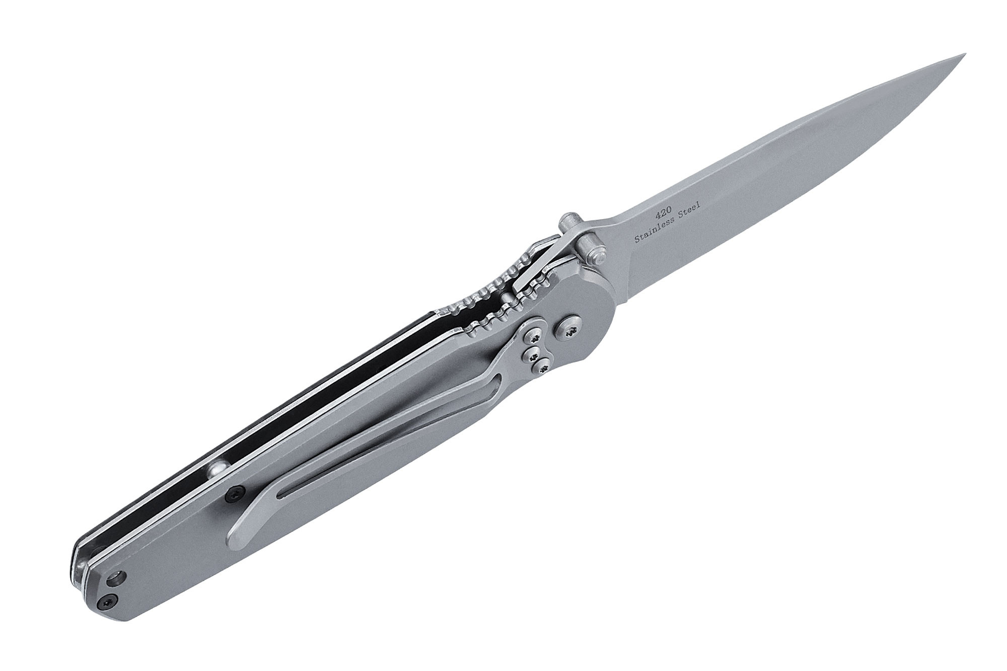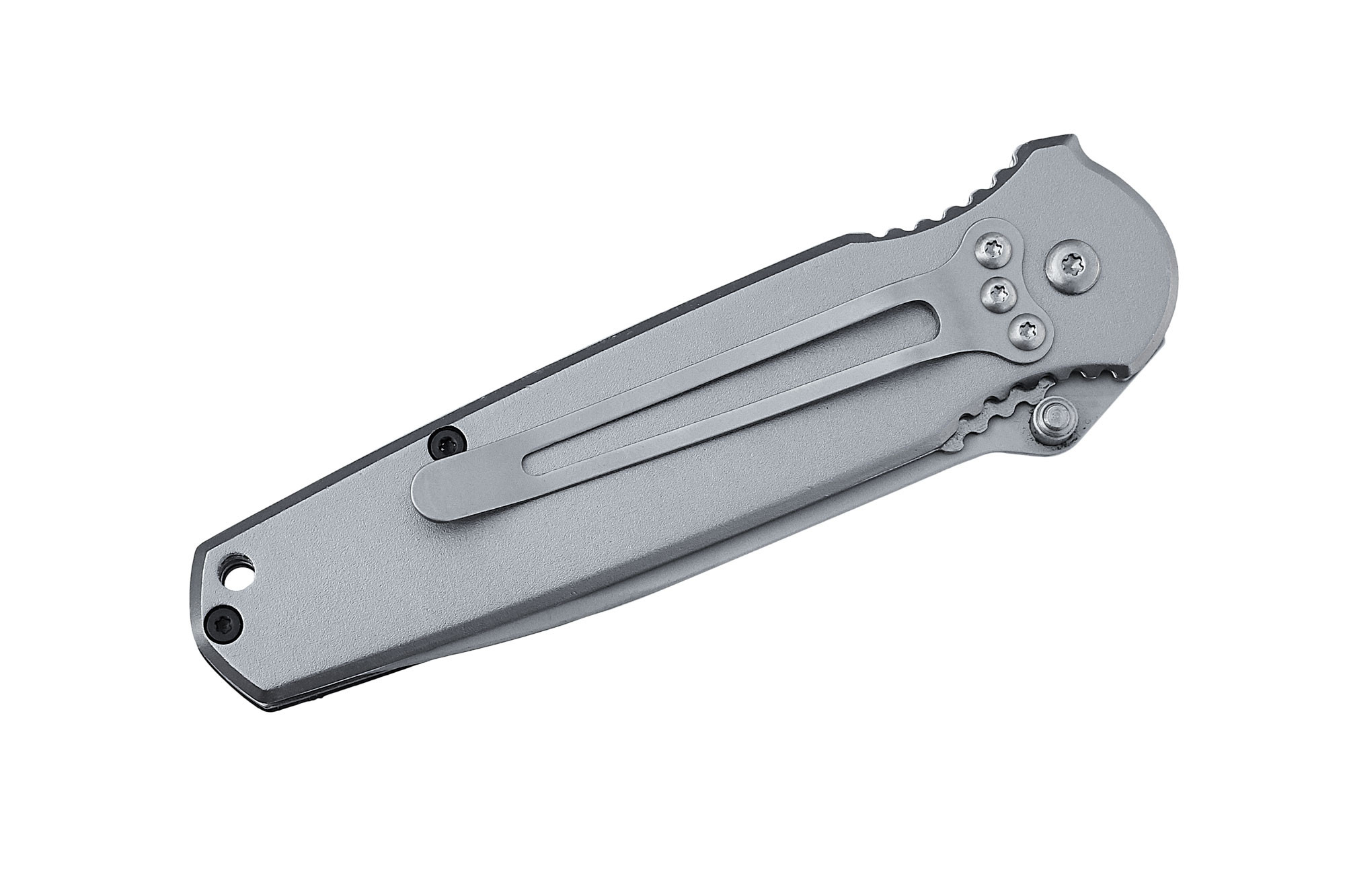 Рукоять ножа представляет собой две стальные пластины из нержавеющей стали с накладками из алюминиевого сплава, что делает нож прочным, плоским и удобным в ношении, для чего он оснащен съемной клипсой. На внешней стороне рукояти размещены дополнительные вставки из шершавого пластика. Внутренняя сторона, с размещенной стальной клипсой, гладкая для удобства,транспортировки и снятия ножа с кармана. Под указательный и большой пальцы сделаны выемки с цепким рифлением.