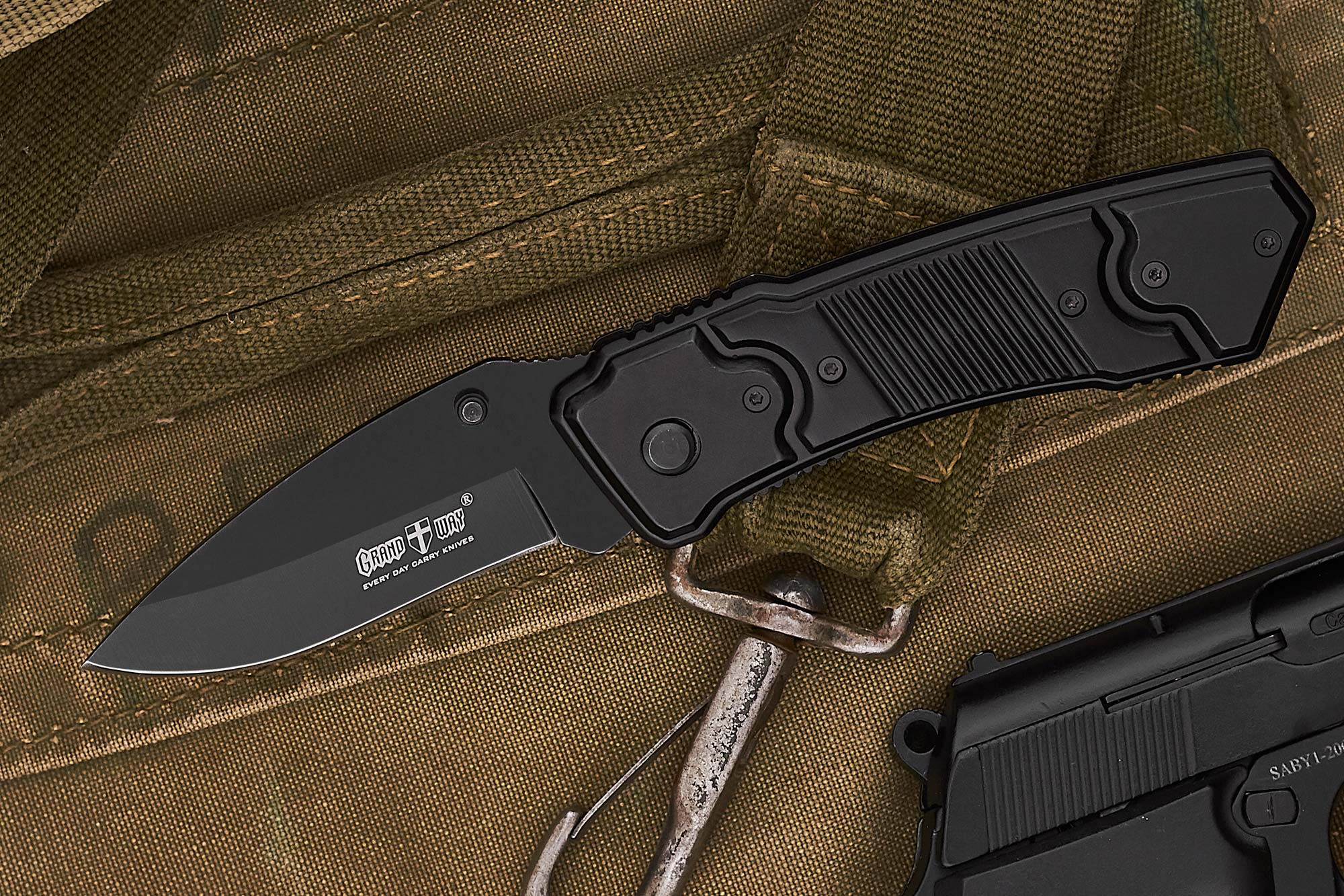 Рукоять ножа изготовлена из мощных стальных пластин с алюминиевыми накладками. Для удобства удержания, на накладках нанесен специальный рельеф. Черное анодирование накладок подобрано под цвет черного покрытия клинка. Рукоять простой формы с развитым рифлением и насечками под пальцы для лучшего удержания- надежна и безопасна в работе. Мощная фурнитура в сочетании с толстыми лайнерами и металлическими накладками делает рукоять приятно увесистой и максимально прочной.