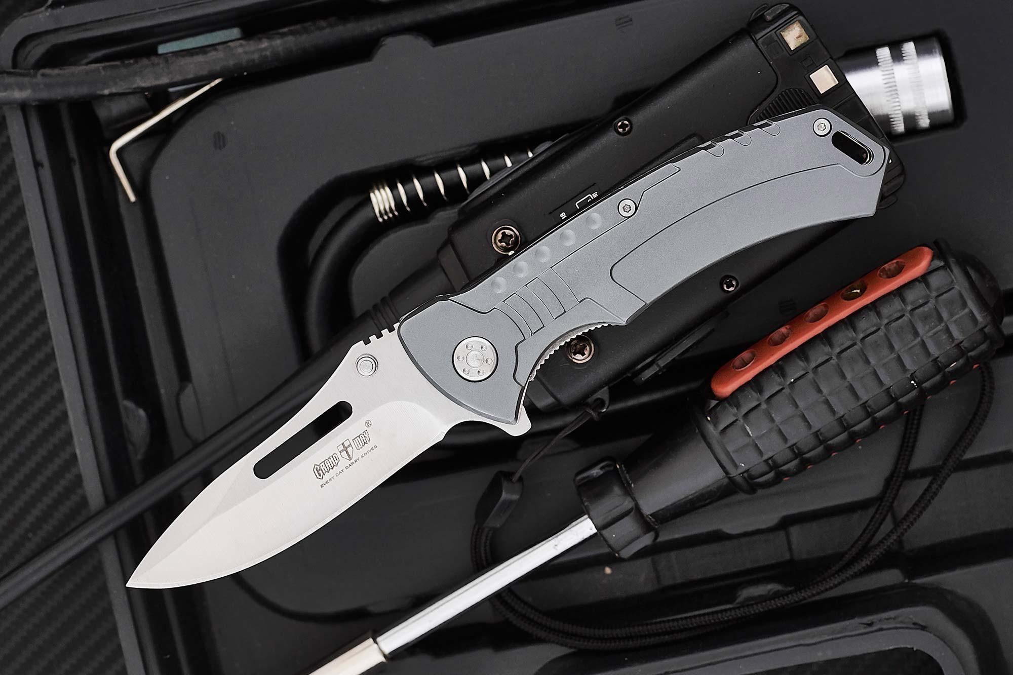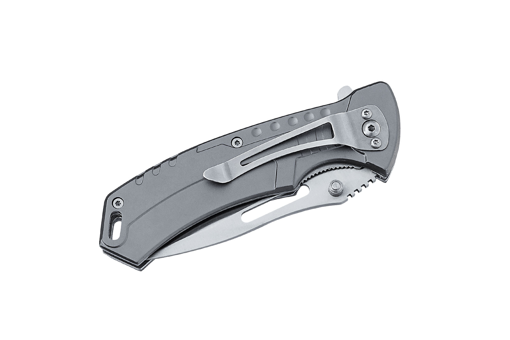 Рукоять ножа изготовлена из стальных пластин с алюминиевыми накладками. Для удобства удержания, на накладках нанесен специальный рельеф. Светлое анодирование накладок прекрасно гармонирует с элегантным клинком. В открытом положении клинок фиксируется надежным и отработанным в производстве замком Liner Lock, который замечательно себя зарекомендовал как простое, надежное и неприхотливое устройство фиксации клинка. Он устойчив к загрязнению и позволяет легко складывать нож одной рукой.