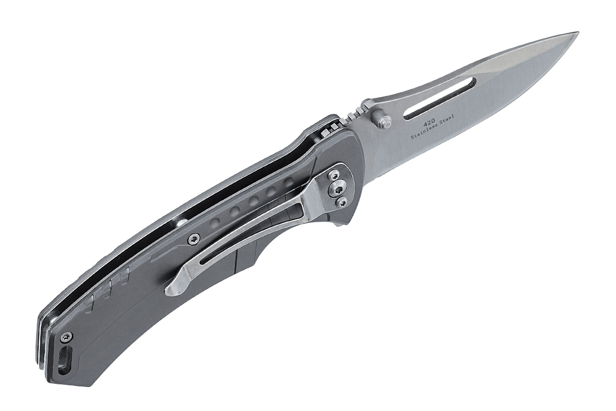 Сам клинок, с узкими отверстиями имеет ярковыраженный упор, двойные штифты для однорукого открывания и рельефную насечку на обухе под большой палец. Упор на клинке, кроме безопасности, может обеспечивать также ускоренное открывание ножа, когда достаточно надавить на выступающий упор и «вытряхнуть» клинок. Для удобства постоянного ношения нож оснащается стальной клипсой. Яркий, компактный, стильный нож передового дизайна. Он не должен быть незаметным, он будет притягивать к себе взгляд.