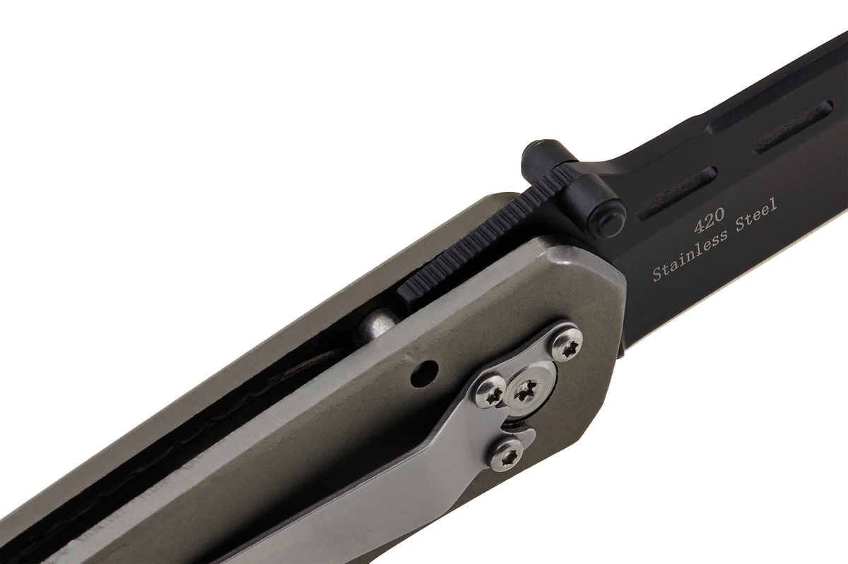 Складной нож с черным антибликовым покрытием на клинке из 420 стали. Сталь марки 420 - это отработанная в производстве нержавеющая сталь бюджетного сегмента. Относительно небольшое содержание углерода делает эту сталь вязкой и исключительно стойкой к ржавчине. Небольшое содержание углерода также положительно влияет и на прочность: такая сталь менее хрупкая. Возможно, лезвия таких ножей тупятся чуть быстрее более дорогих марок, но и точится она тоже очень легко и буквально на всем - мусаты, любые точильные камни и даже V-образные точилки без усилий приведут затупившийся нож в боевую форму, а твердости хватит с избытком для бытовых задач.