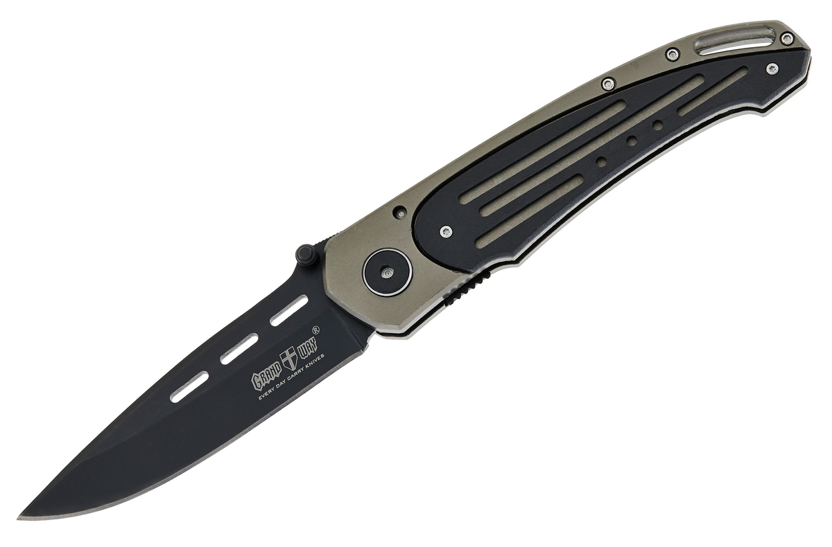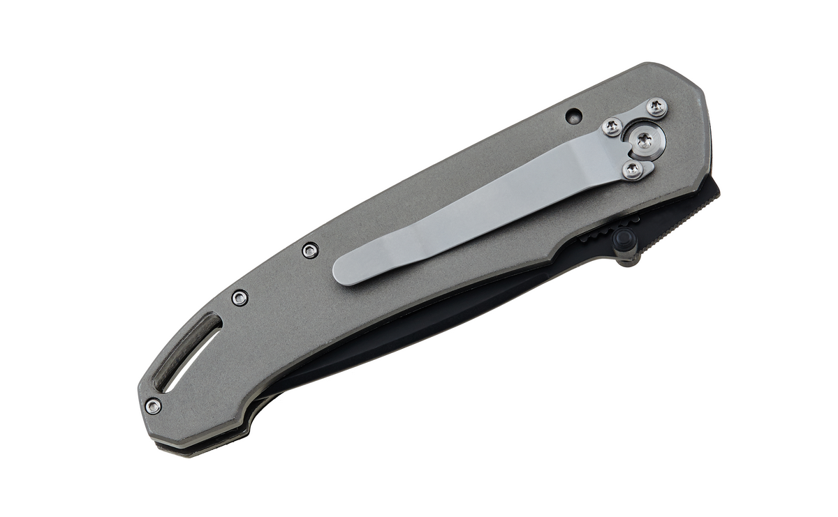 Прекрасная, удивительно легкая, компактная модель с полнофункциональным клинком. Небывалую легкость этому ножу придает его рукоять. Она изготовлена из алюминиевых плашек без применения стали. На накладках, для улучшения хвата, имеется вставка из шершавого пластика с прорезями. Также улучшению хвата служит рифление под большой палец на обухе клинка. Рукоять замечательного дизайна, как влитая сидит в руке, безопасна в работе, благодаря продуманной форме и материалам. Для быстрого открывания ножа одной рукой на клинке предусмотрены специальные двусторонние штифты, а чтобы нож было удобно постоянно носить с собой, он оборудован съемной стальной клипсой.