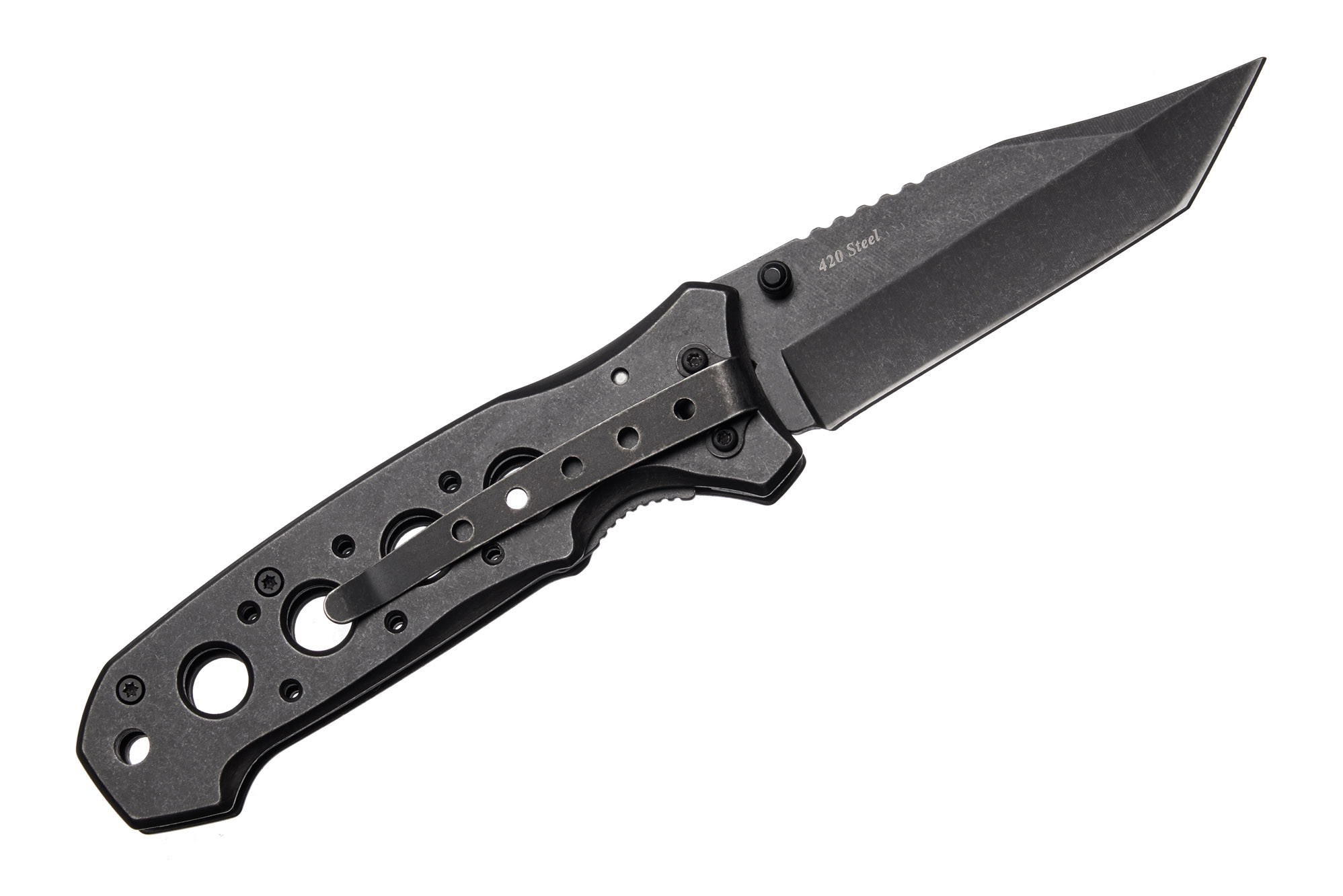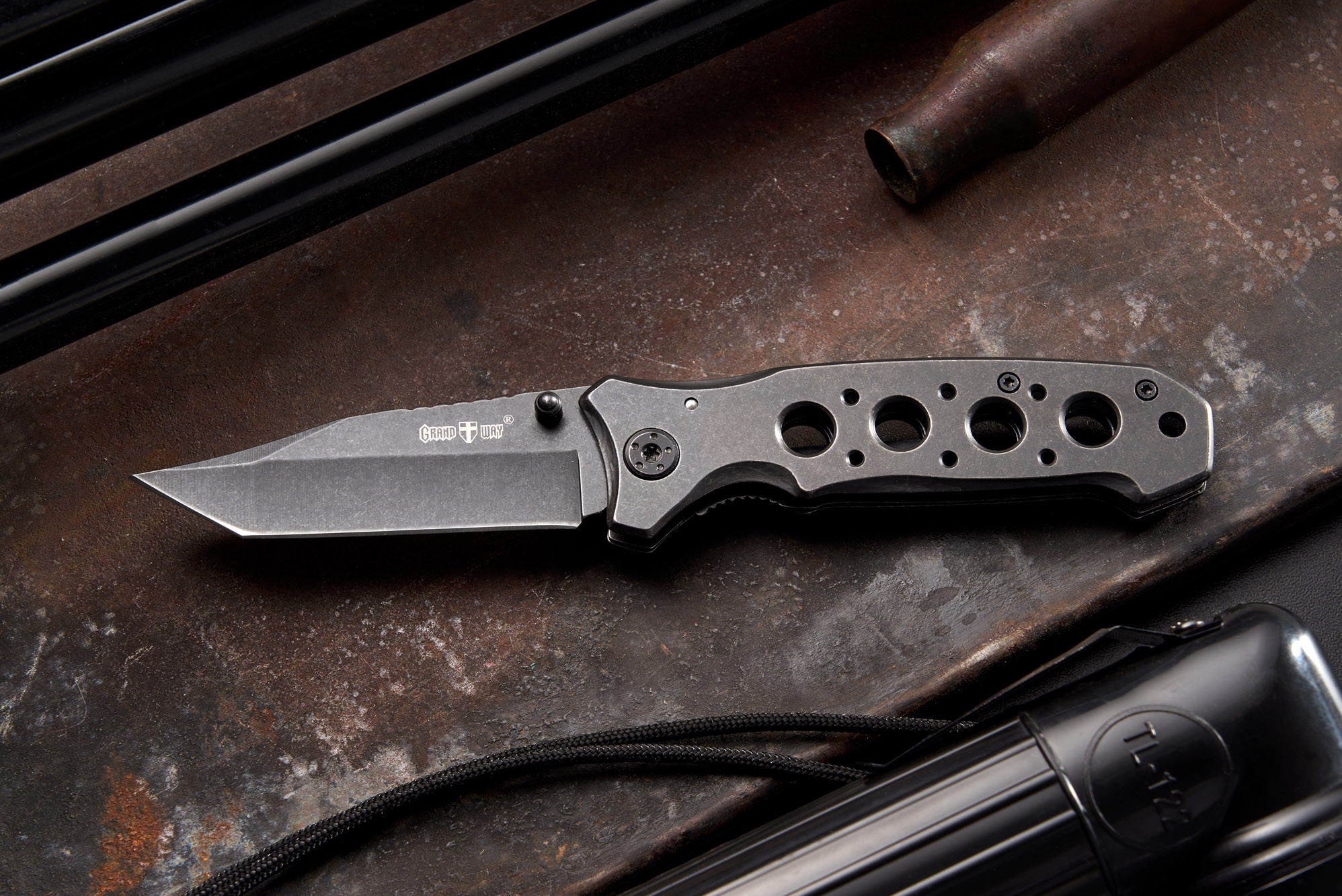 - Легкость. Складной нож 10517 является полностью цельнометаллическим. Для облегчения в рукояти высверлено четыре крупных сквозных отверстия.