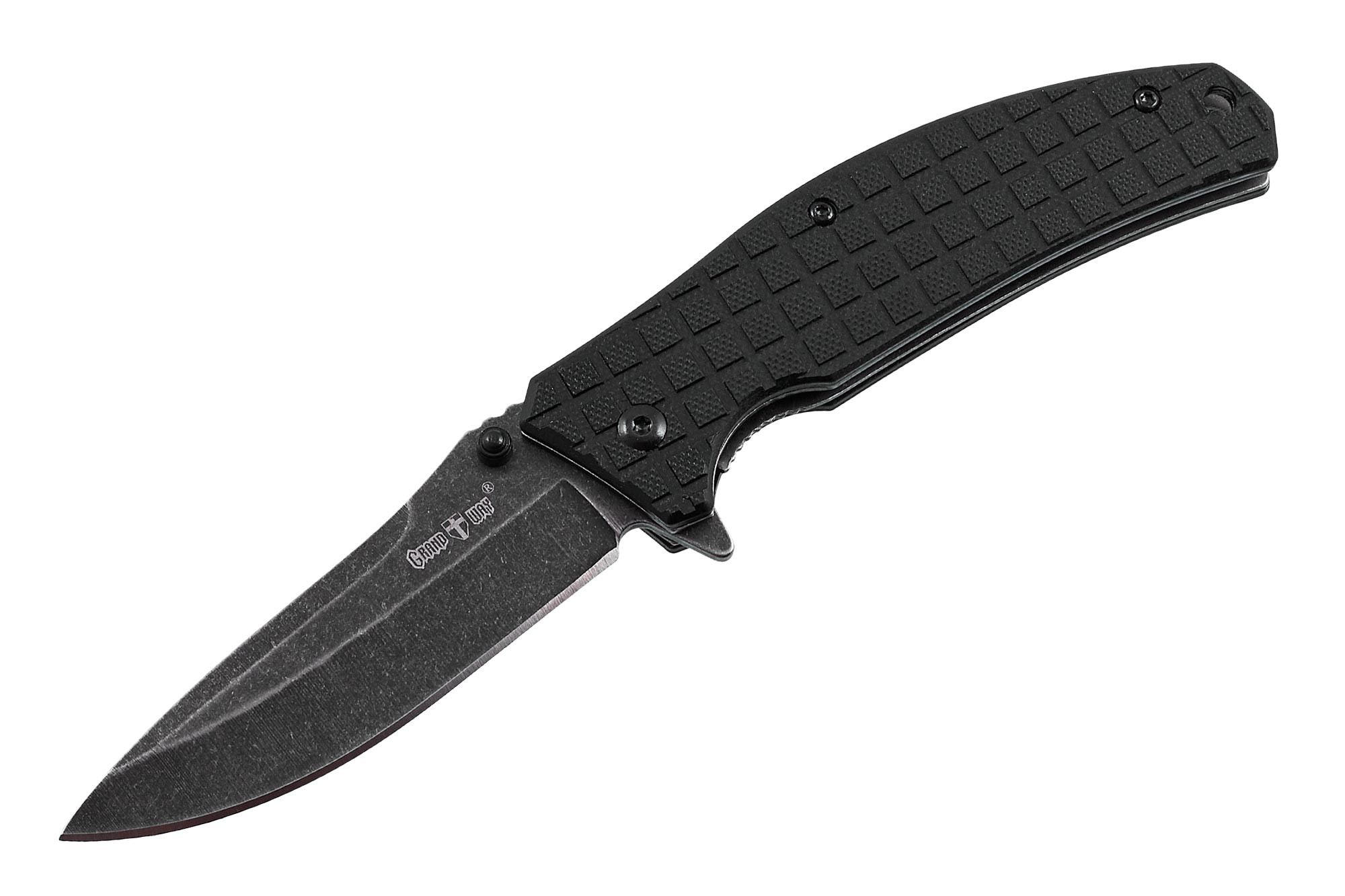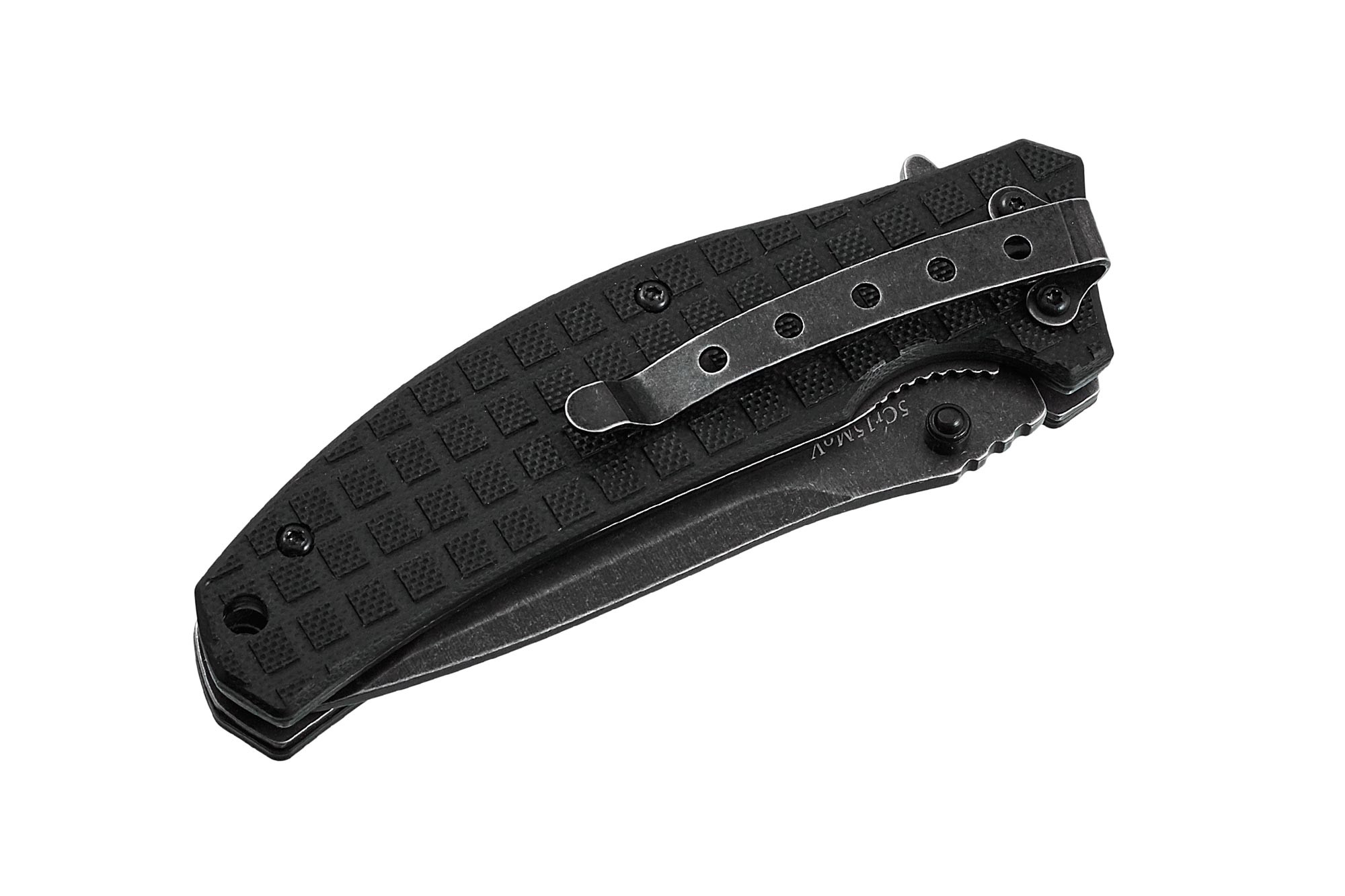 В основном, складной нож 10618 является цельнометаллическим, однако рукоять снабжена пластиковыми накладками черного цвета. Насечка рукоятки имеет крупное сечении на квадратики, каждый из которых имеет свою собственную мелкую насечку, и в целом, такое решение работает на удобство хвата и интересный внешний вид ножа.