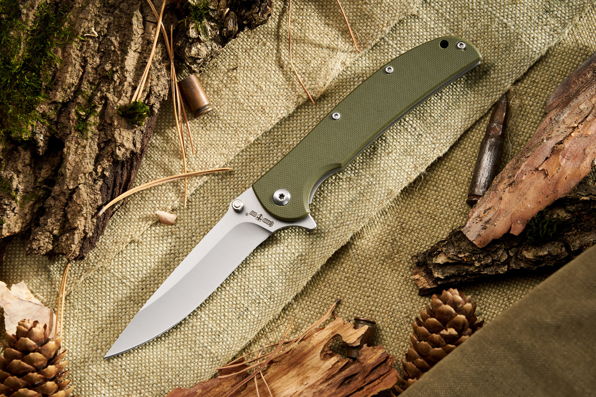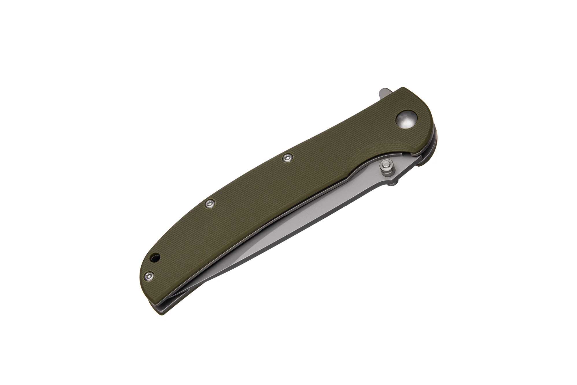 - накладки руків'я із стійкого композиту G10 зеленого кольору не тільки виглядають привабливо та надають ножу элементи тактичного дизайну, але й помітно збільшують зчеплення рукояті з долонею,