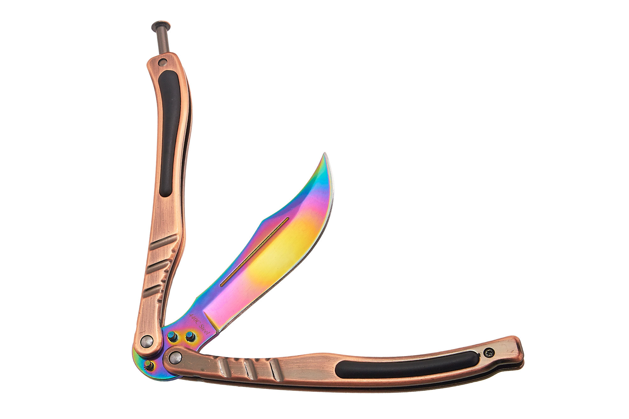 Нож-бабочка 12-A – отличный вариант для уже увлекающихся флиппингом или для только недавно решивших заняться изучением приемов обращения с балисонгом. В целом, 12-A – приятная по дизайну и запоминающаяся модель: клинок в цветах побежалости, рукоять металлическая - медных цветов, с черными антискользящими вставками. Балисонг 12-A прекрасно выглядит во время вращения и при этом удобно ложится в руку.