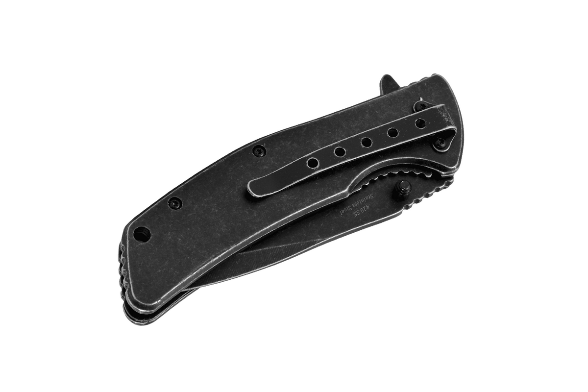 Клинок типа дроп пойнт изготовлен из недорогой 420й стали. Для бытовых задач прочностных свойств такого материала хватает за глаза. Да, эта сталь не может соперничать с дорогими марками, тем не менее и в ее арсенале есть положительные свойства. Среди которых прекрасная коррозионная стойкость, отсутствие склонности к выкрашиванию и отличная способность принимать заточку. Черный стоунвош придает ножу некую винтажность, словно нож находится в пользовании владельца не первый год . Режущая кромка ножа образована слабовогнутыми спусками от середины клинка. Фальшлезвие без заточки, расположенное на обухе, упрочняет острие и облегчает клинку проникновение в разрезаемый материал при колющем действии ножом.