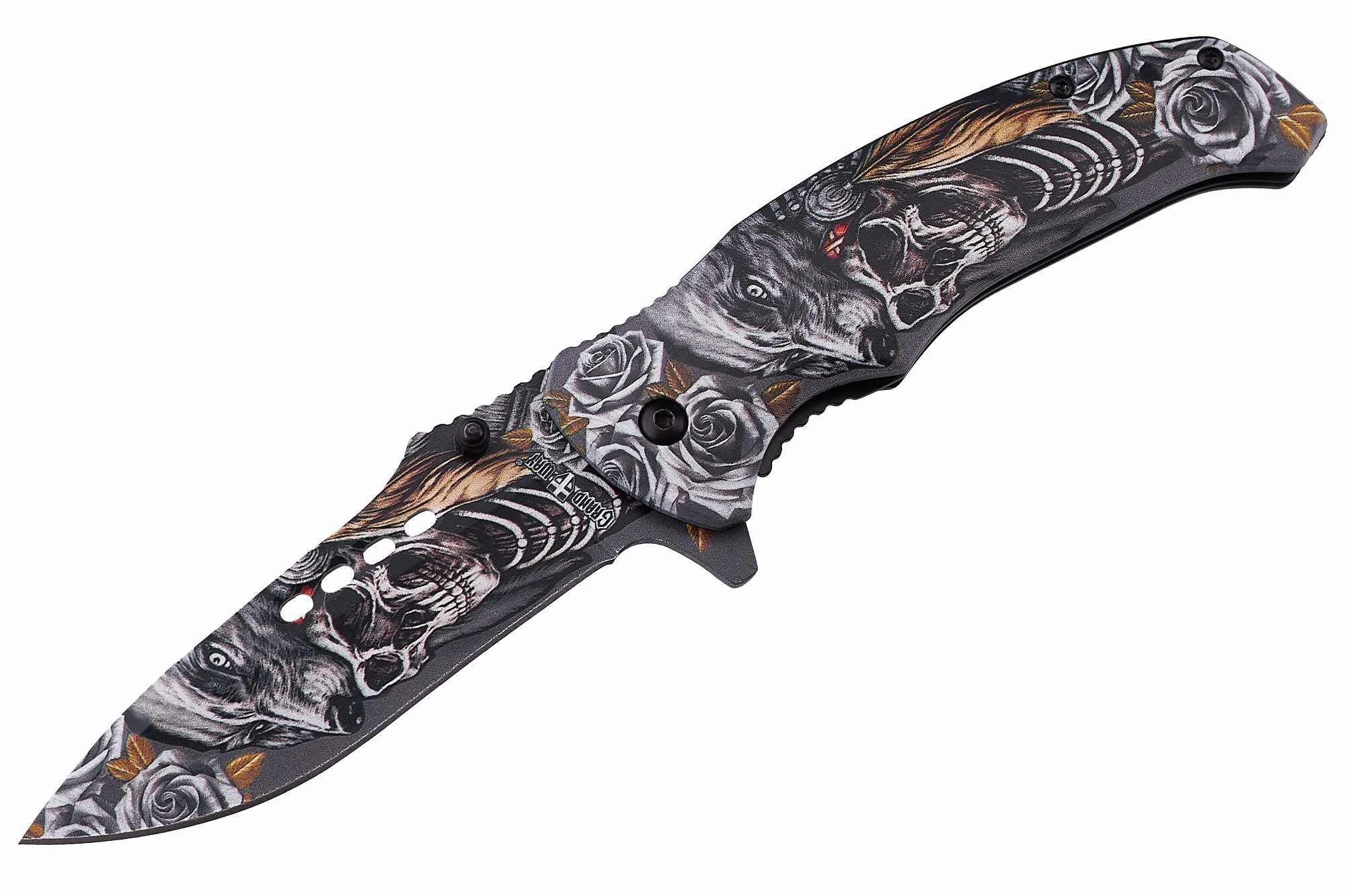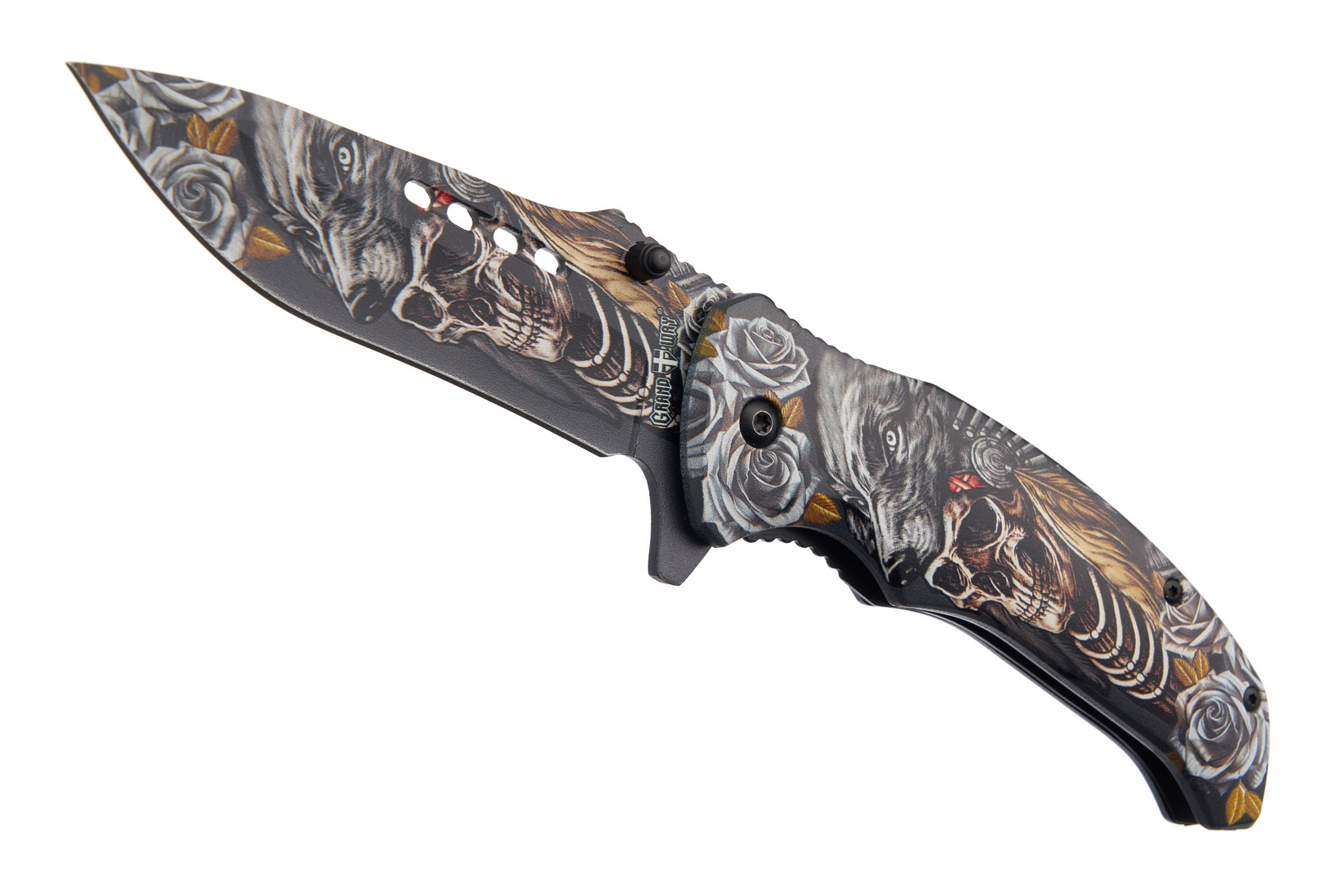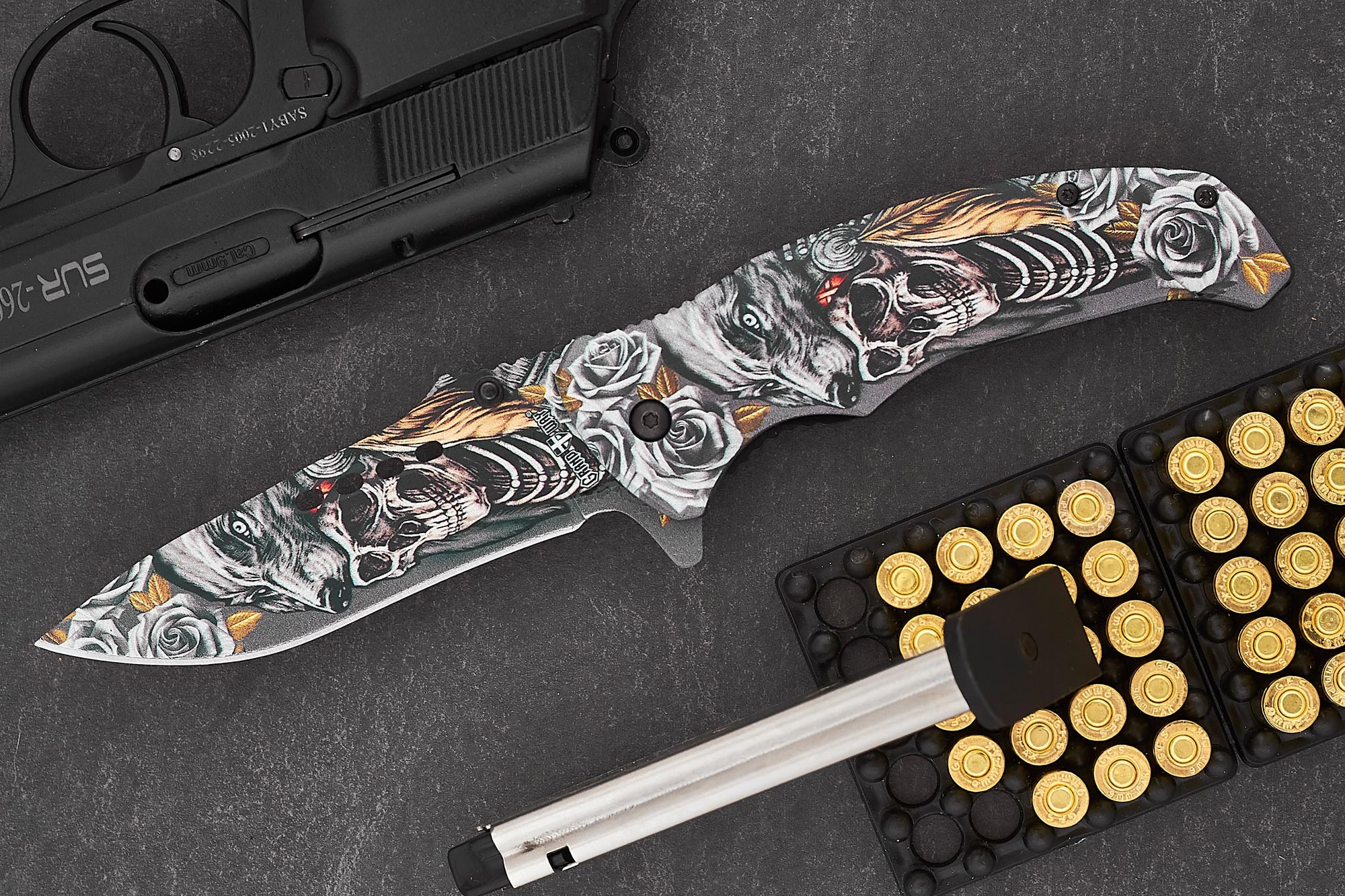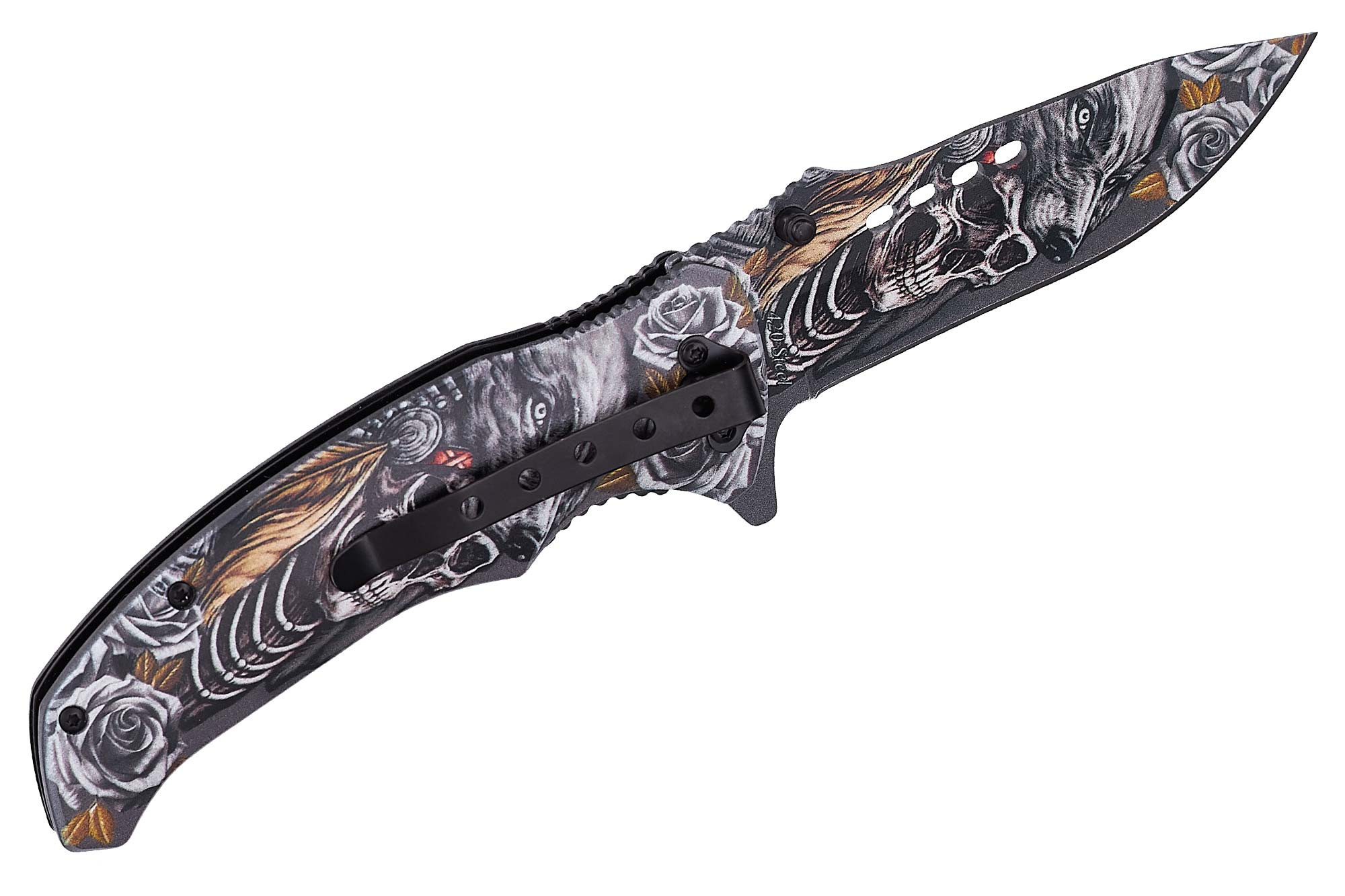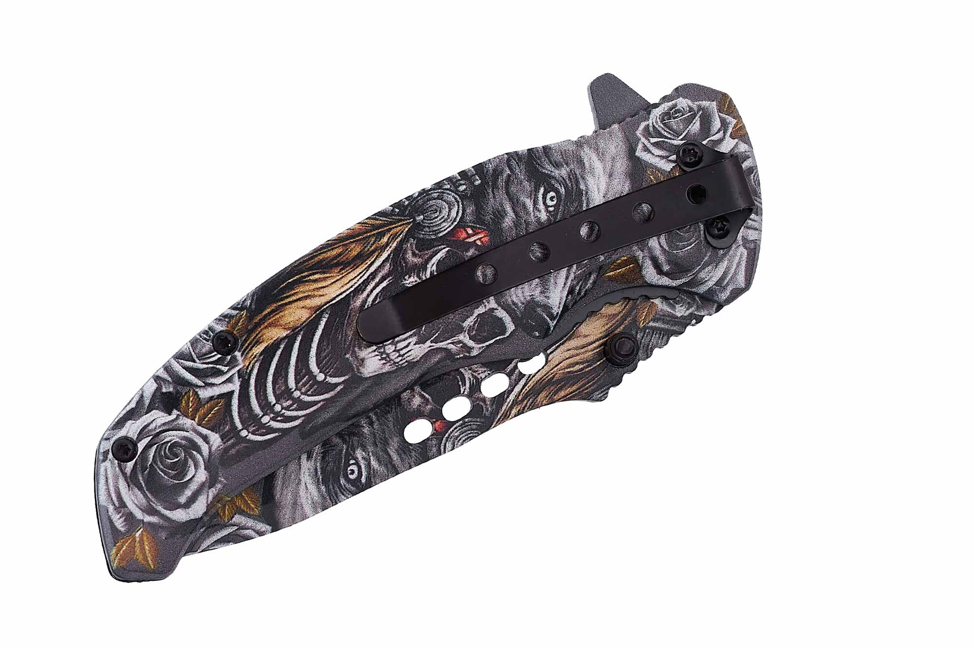 - Поверхня ножа повністю покрита якісним зображенням Aquaprint із деталізованим малюнком. Тематика — темно-готична, що надає моделі впізнаваного, трохи агресивного стилю. Вдалий вибір для тих, хто цінує оригінальний вигляд.