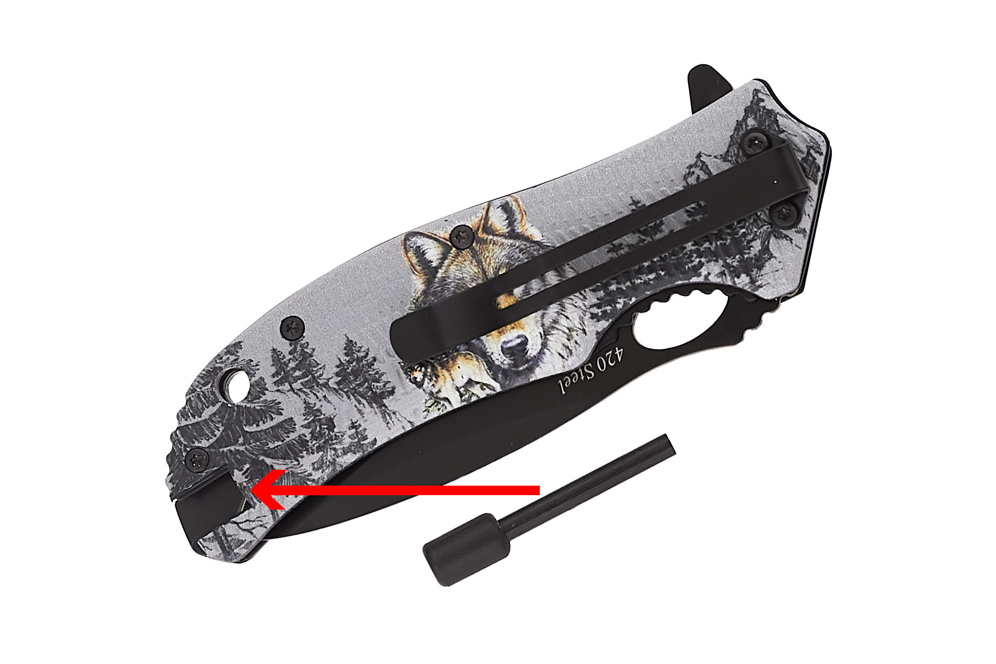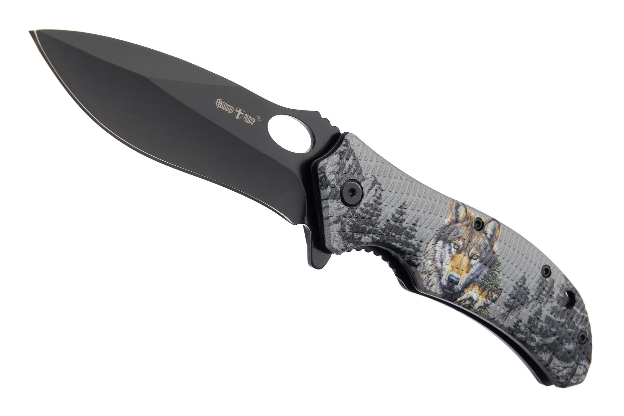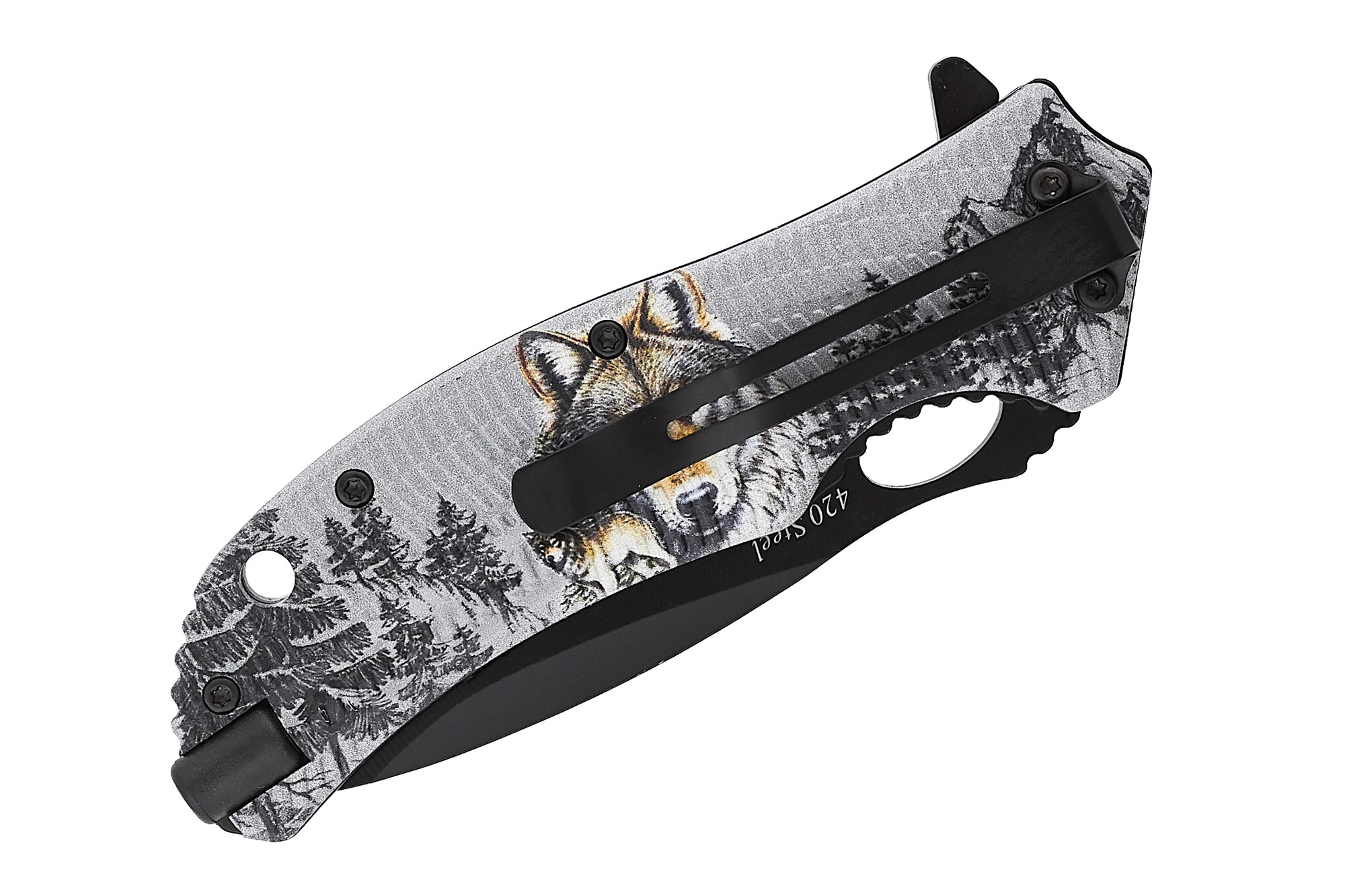 Рукоять выполнена из пары стальных лайнеров, покрытых пластиковыми плашками. На плашки нанесён красивый риунок – aquaprint. Волки, тайга – суровая, мужская романтика.