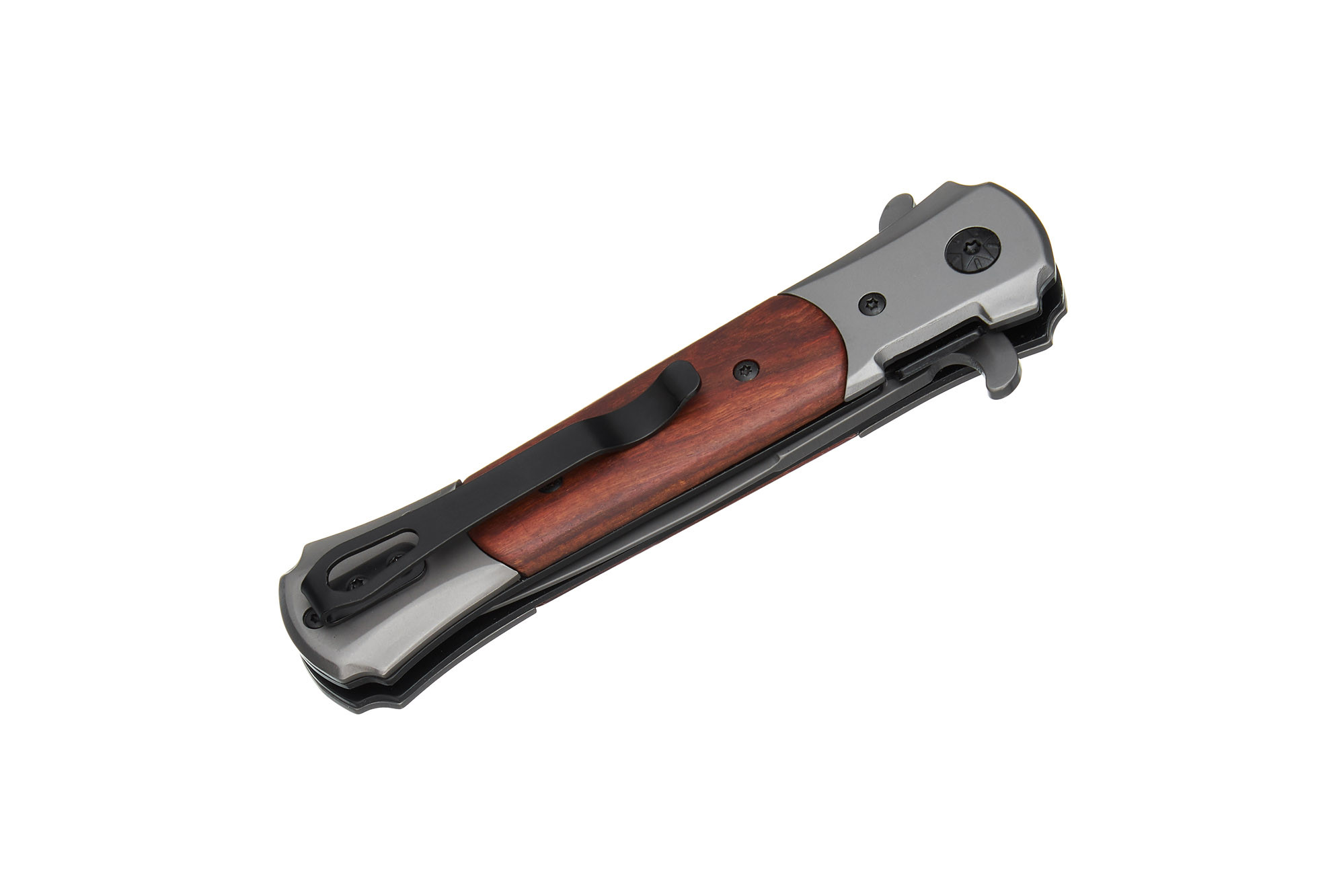 На відміну від традиційних італійських стілетів, ніж Grand Way 220115 не є автоматичним. Але пружина асситу в ньому таки є. Вам треба просто штовхнути чи підчепити виступ-плавець, та зрушити клинок з місця. Пружина підхопить ваш рух і остаточно розкриє ніж. Ніж все одно можна швидко розкрити однією рукою. але він виходить простішим за будовою, а тому значно практичнішим.