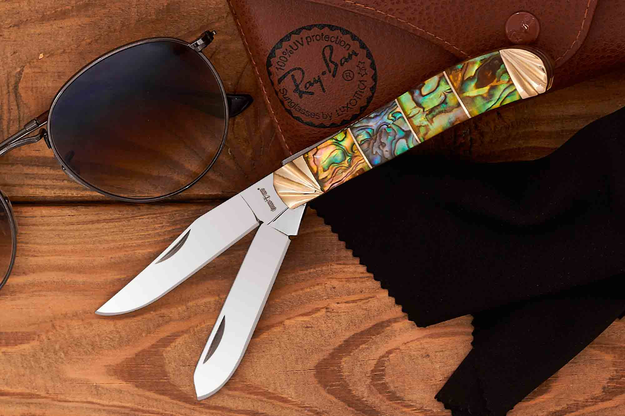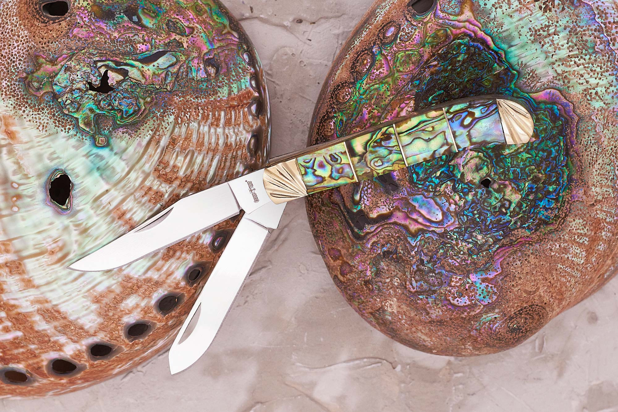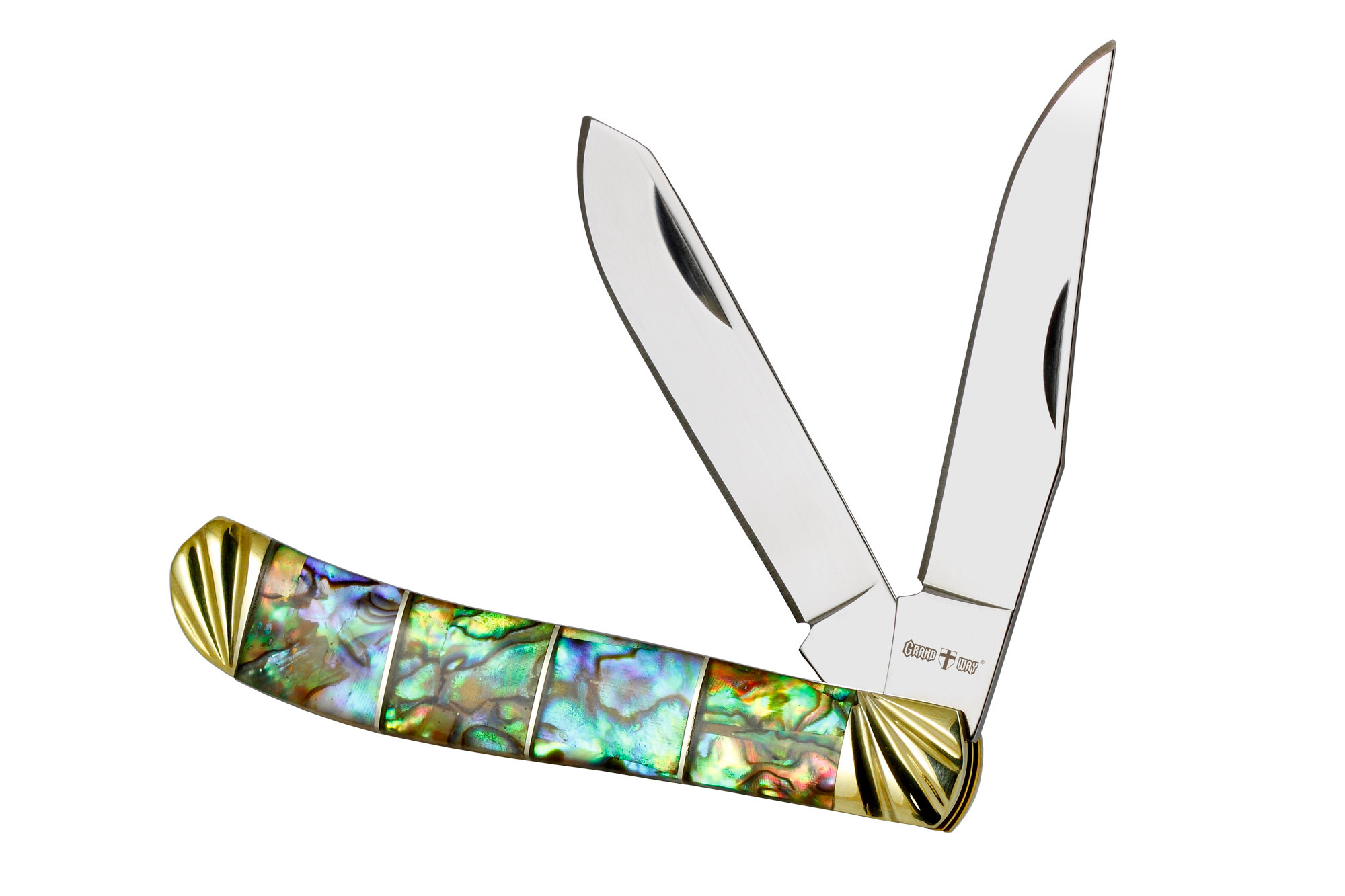 Фиксируются клинки с помощью классической схемы слип джоинт, простой и безотказной. Рукоять украшена накладками из натуральной перламутровой ракушки и латунью, которые отлично сочетаются с зеркальной полировкой клинков. Комбинация красивых, натуральных материалов рукояти и полированной нержавеющей стали клинков, создает стильную классическую модель складного ножа.