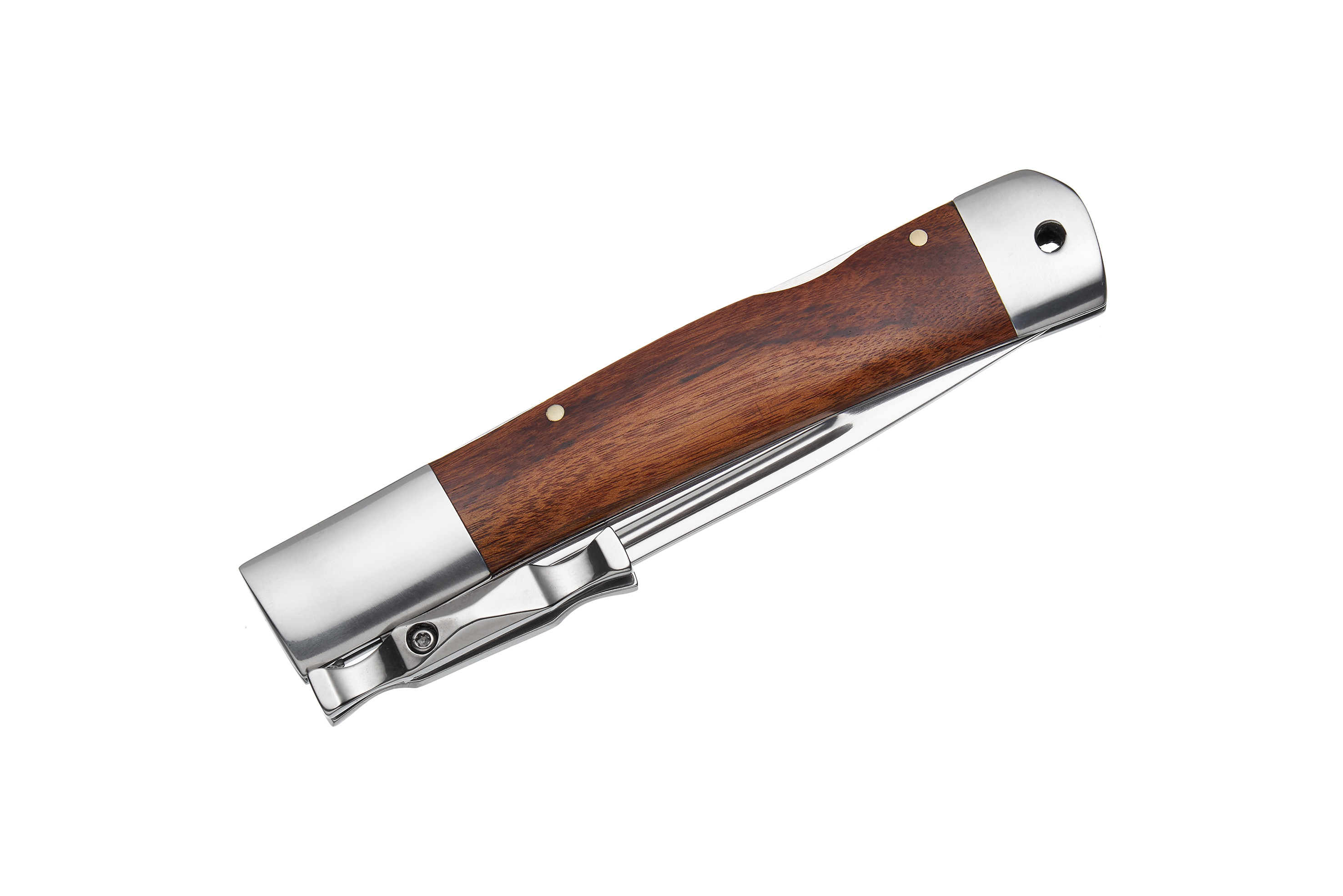 Дуже цікавоим елементом конструкції ножа є його складана гарда. Коли клинок знаходиться у складеному стані, гарда теж займає транспортне положення. Так вона не чіплятиметься за тканину кишені та не буде заважати швидко дістати ніж за потреби.
