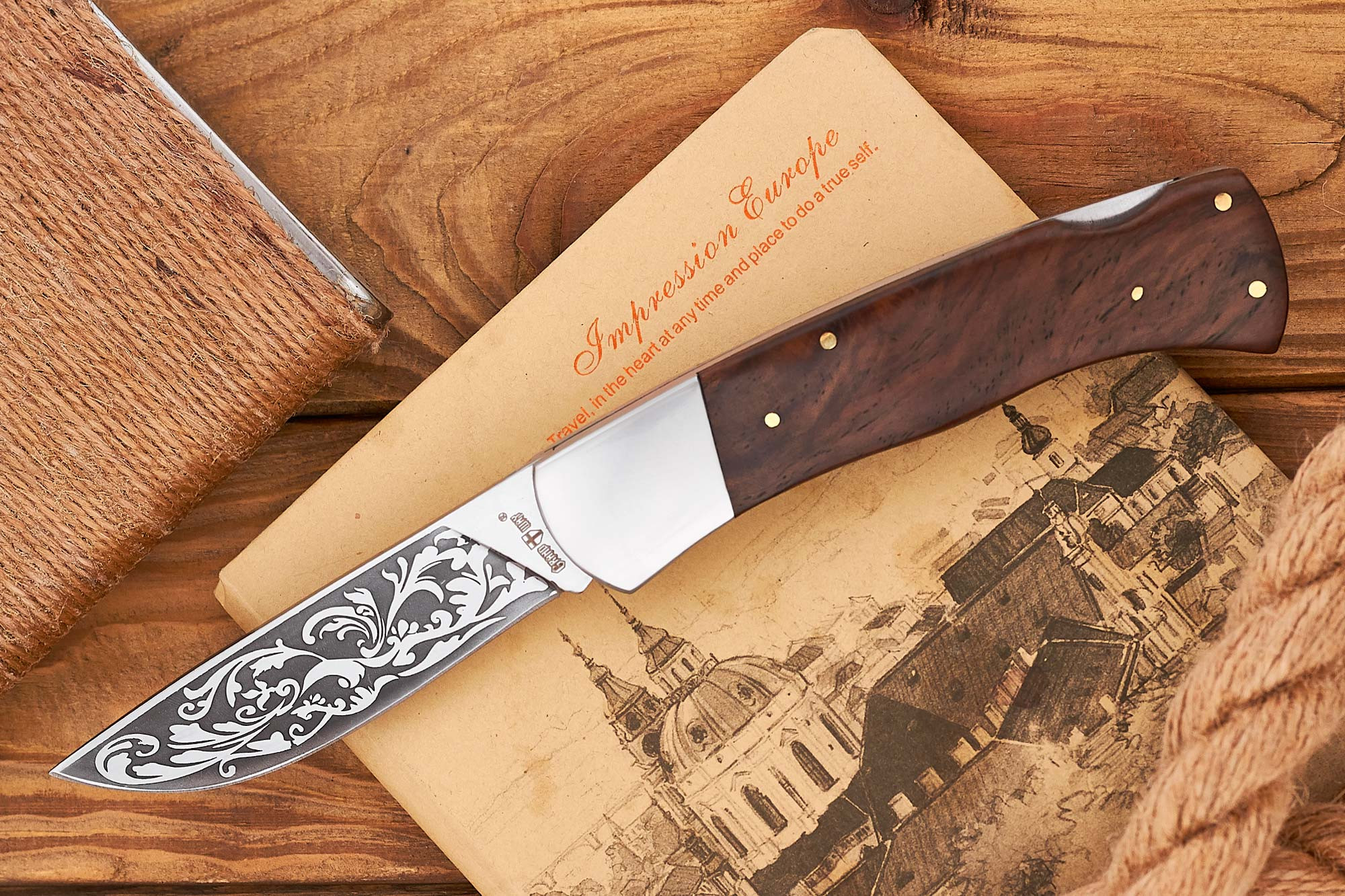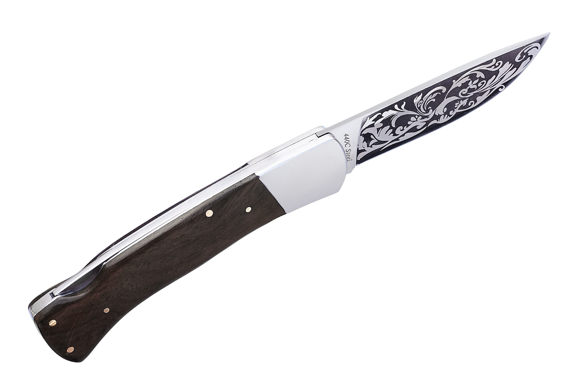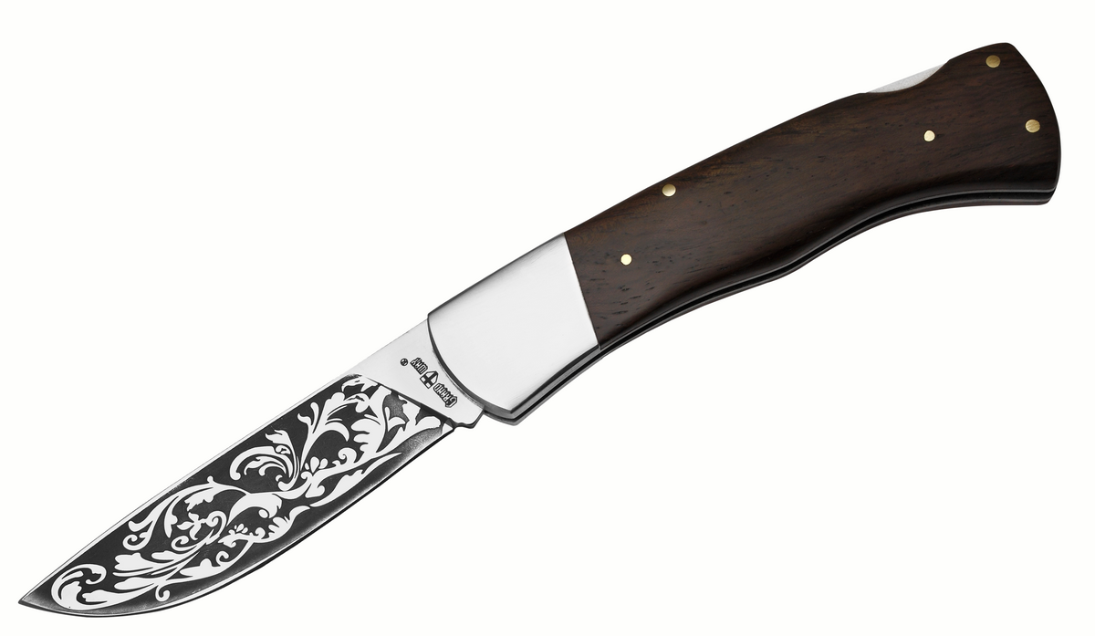 5812 WKP – это классическая модель туристического ножа, дизайн которой выдержан в спокойном, традиционном ключе. Никаких новомодных композитных пластиков и порошковых сталей, никаких клипс и приспособлений для однорукого открывания. Только проверенные временем материалы: нержавеющая сталь 440С, палисандр, неразборная конструкция и замок бэклок.