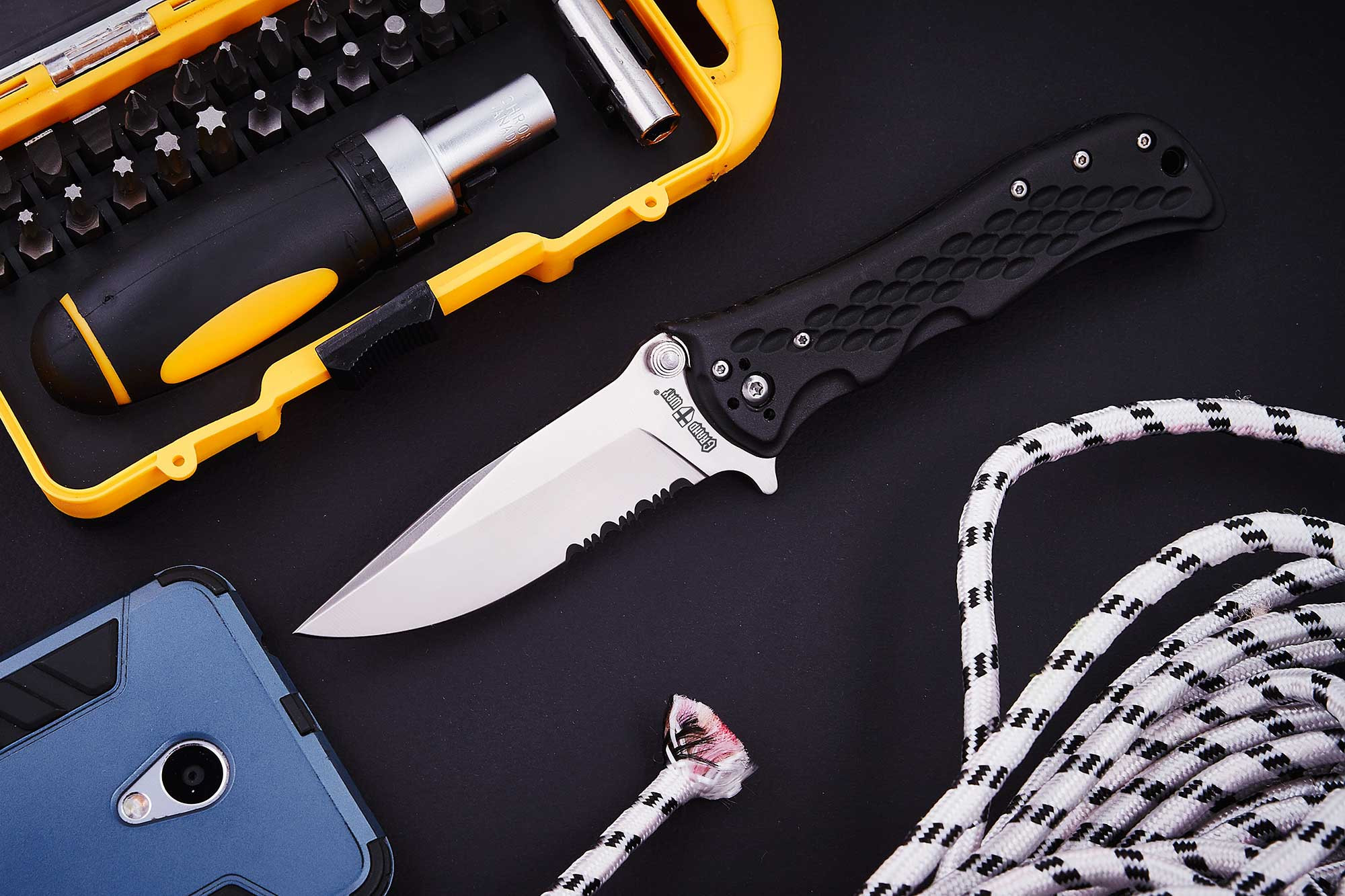 Клинок этого ножа изготовлен из стали марки 440С. Сталь 440С является современной высокоуглеродистой нержавеющей сталью. Чтобы повысить режущие свойства клинка по вязким и волокнистым материалам, в корневой части клинка на лезвии сделана серрейтерная заточка, которой по силам самый мягкий хлеб и помидоры, даже если основное лезвие затупилось.
