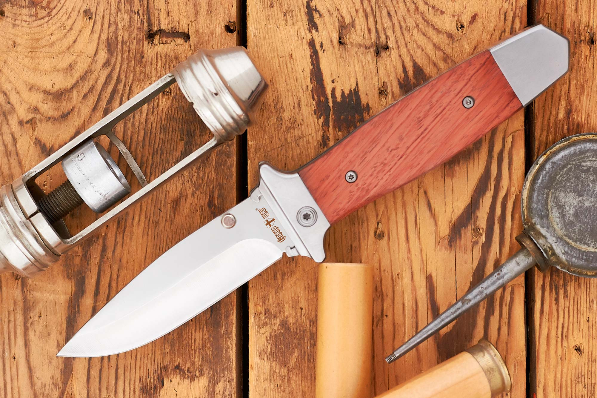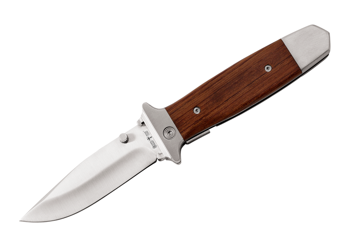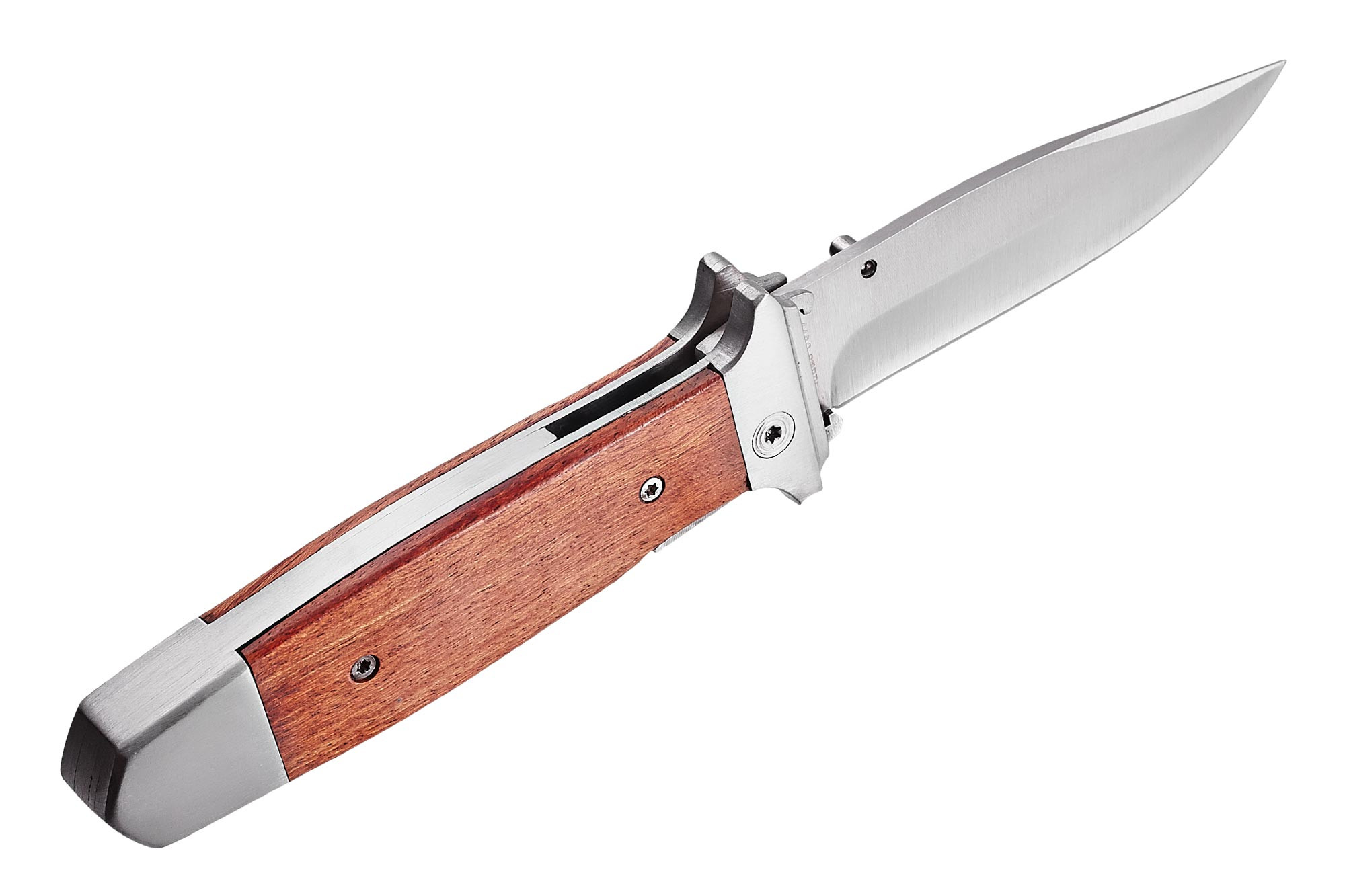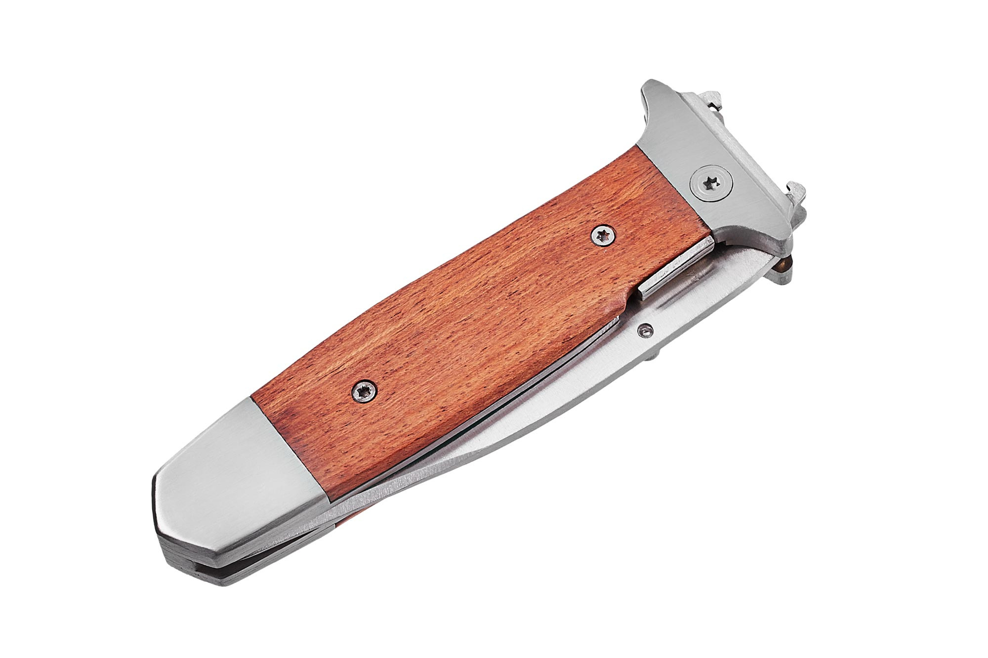 Замок ножа, уже ставший классикой, неприхотливый и отработанный в производстве Liner Lock. Замок очень надежный, позволяет складывать нож одной рукой и не боится грязи. Для большей надежности и удобства, на лайнере замка сделана специальная выштамповка. Рукоять ножа собрана из стальных лайнеров на заклепках, с накладками из дерева с красивой текстурой. Древесина, используемая для изготовления накладок, прошла специальную обработку, устойчива к влаге, гниению и вредителям. Теплые на морозе и приятные на ощупь накладки отлично гармонируют с полированным клинком и фурнитурой. Нож прекрасно приспособлен для открытия одной рукой за специальный выступ.