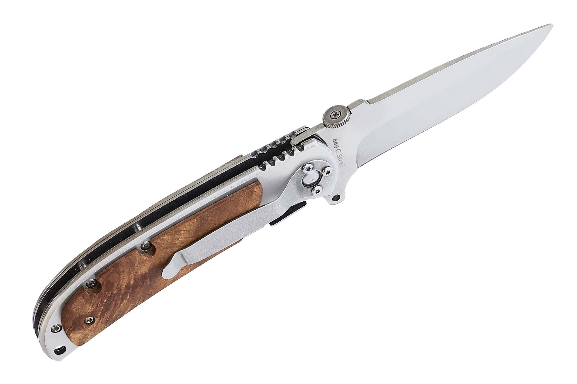 Мощный и прочный складной нож. Клинок этого ножа изготовлен из стали марки 440С. Сталь 440с является современной высокоуглеродистой нержавеющей сталью. Визитная карточка 440С высокая износостойкость и твердость, которая обеспечивается высоким содержанием углерода и легированием молибденом и ванадием. Химическую стойкость стали придает высокое содержание хрома, придающего дополнительную износостойкость. Эта сталь несколько сложна в заточке, такие ножи плохо правятся мусатом, и придется потратить немало сил, чтобы переточить такой клинок, но благодаря ее износостойкости делать это придется намного реже, чем в случае использования более дешевых сталей.