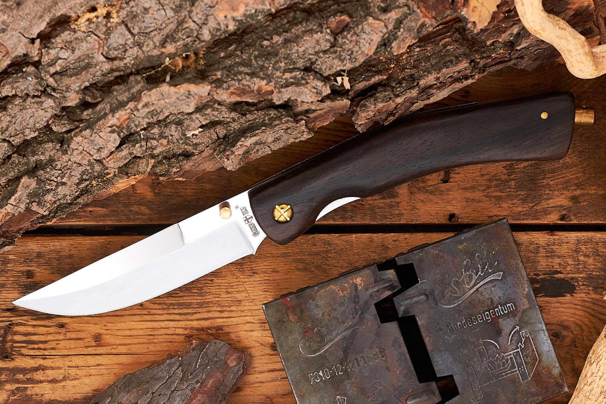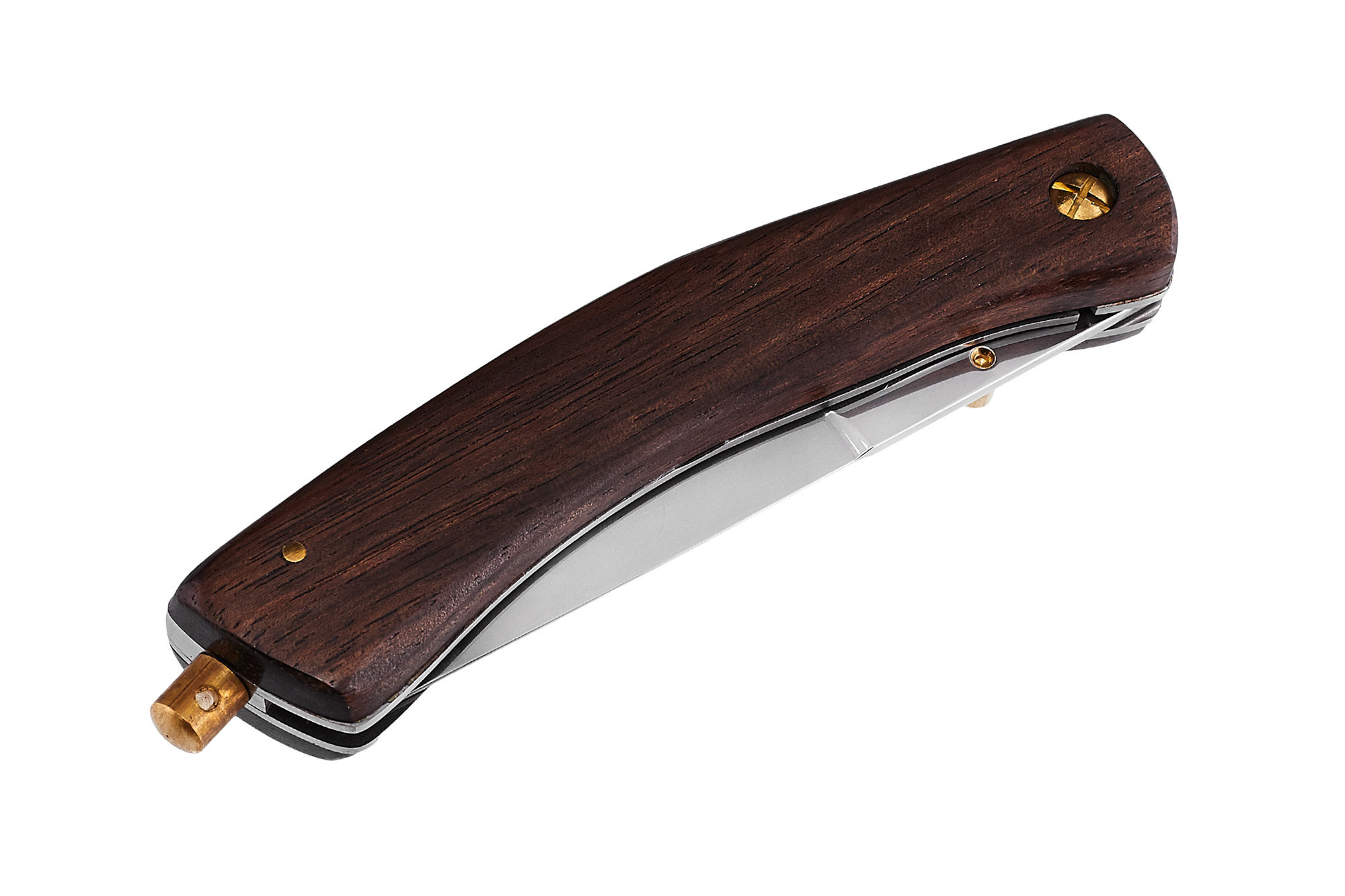 Замок ножа, уже ставший классикой, неприхотливый и отработанный в производстве Liner Lock. Замок очень надежный, позволяет складывать нож одной рукой и не боится грязи. Крупная рукоять ножа изогнутой формы, подойдет и крупной и мелкой руке и прекрасно подходит для разделки и снятия шкуры. Также будет удобна и на пикнике. Сама рукоять образована стальными лайнерами на винтах и имеет красивые деревянные накладки. Древесина, используемая для изготовления накладок, прошла специальную обработку, устойчива к влаге, гниению и вредителям. Теплые на морозе и приятные на ощупь накладки отлично гармонируют с темным клинком и латунной фурнитурой.Длинный клинок справится с любой работой, будь это нарезка бутербродов на пикнике или разделка форели на рыбалке. Крупный, красивый рабочий нож.