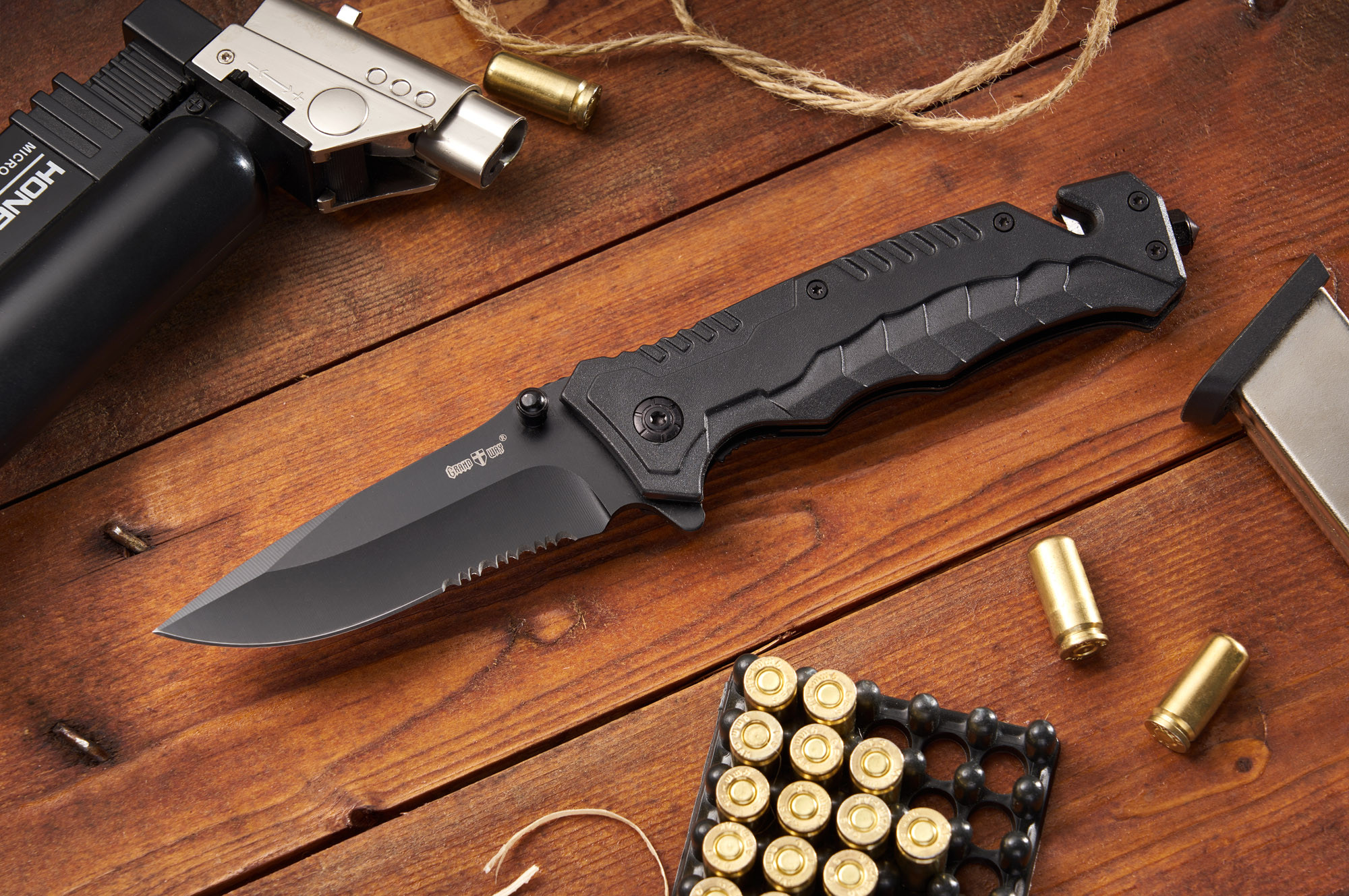 Grand Way 6759 AN – недорогий і практичний полуавтоматичний складаний ніж зі стропорізом та склобоєм .