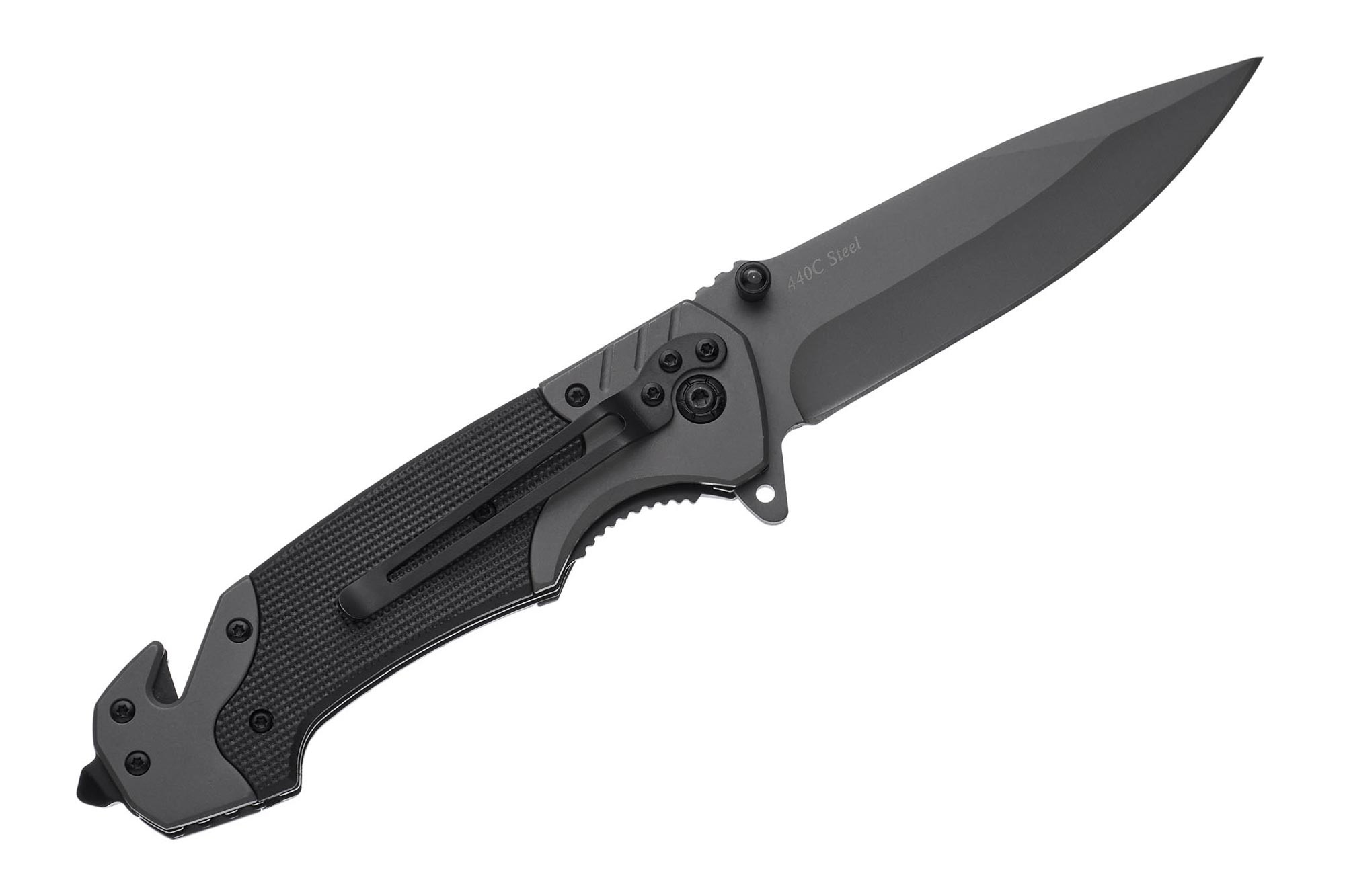 - клинок із стійкої до корозії, невибагливої нержавіючої сталі 440 С (чорне покриття надає йому додаткової краси та стійкості до дрібних пошкоджень типу подряпин);