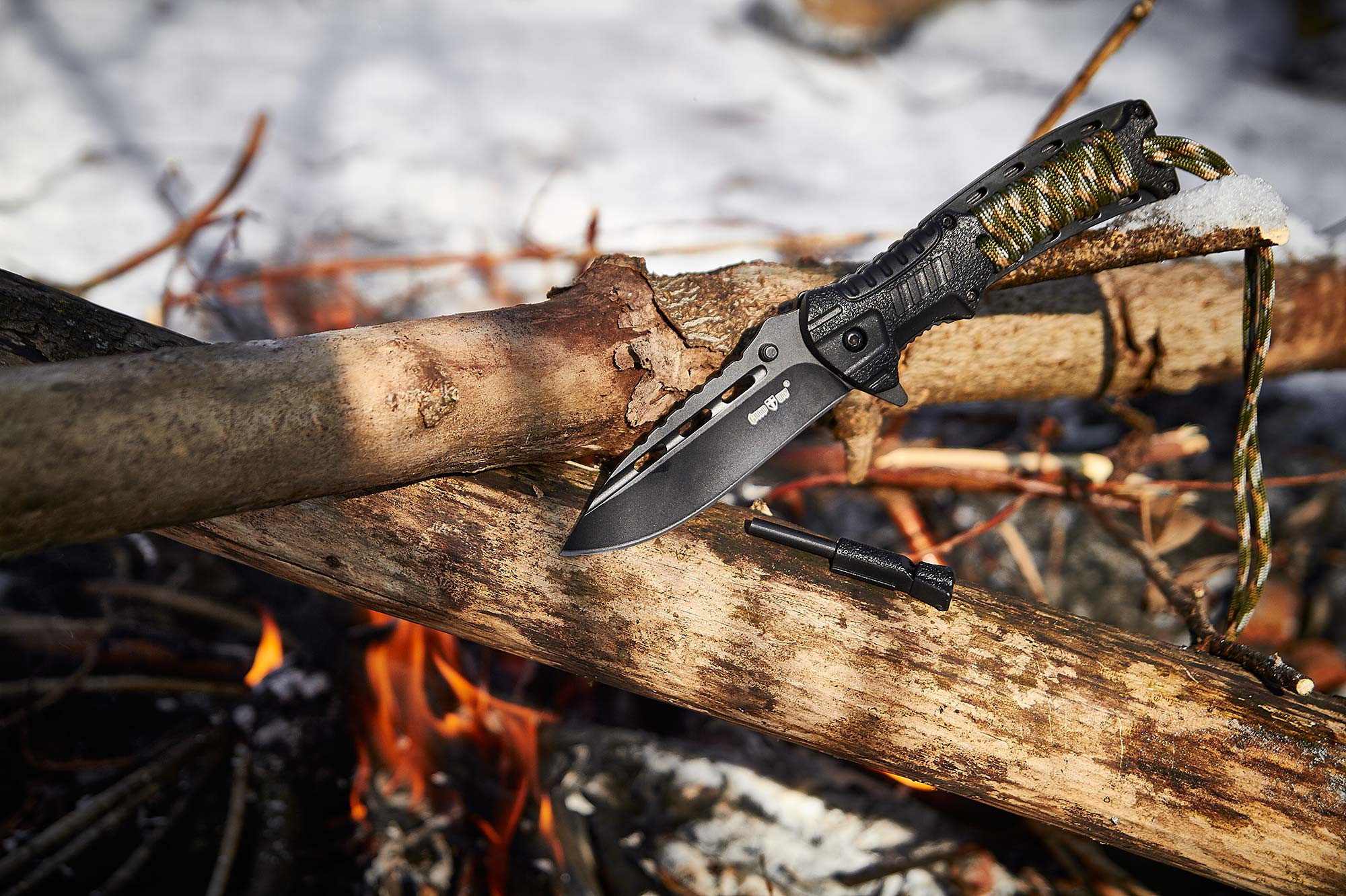 Главной же особенностью этого складного ножа является то, что в комплект с ним входит небольшое огниво для получения открытого огня. Это приспособление современного типа, изготовленное из мишметалла – ферроцерия. С его помощью вы без труда организуете себе костер, не опасаясь, что вам повредят сырость и намокание.