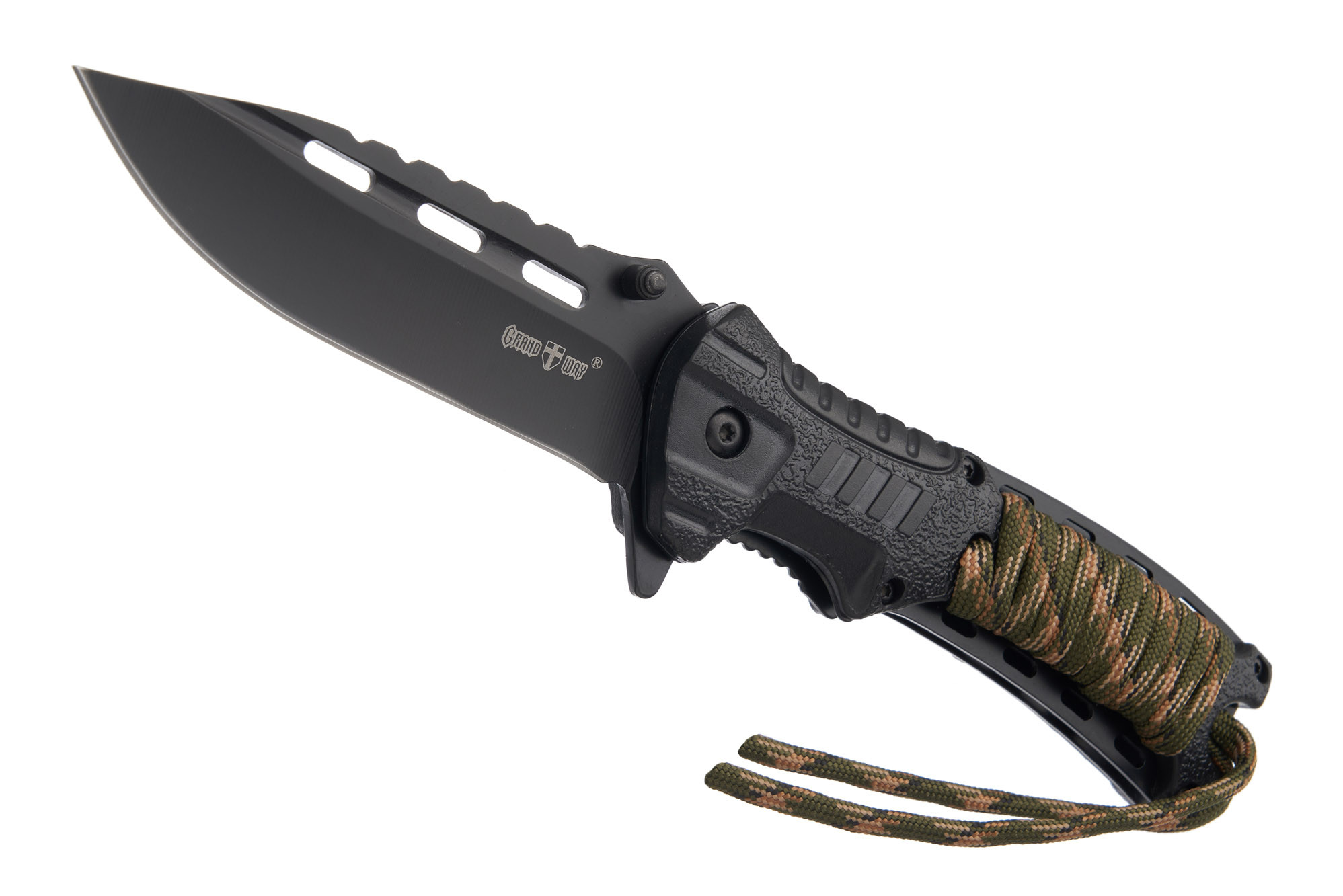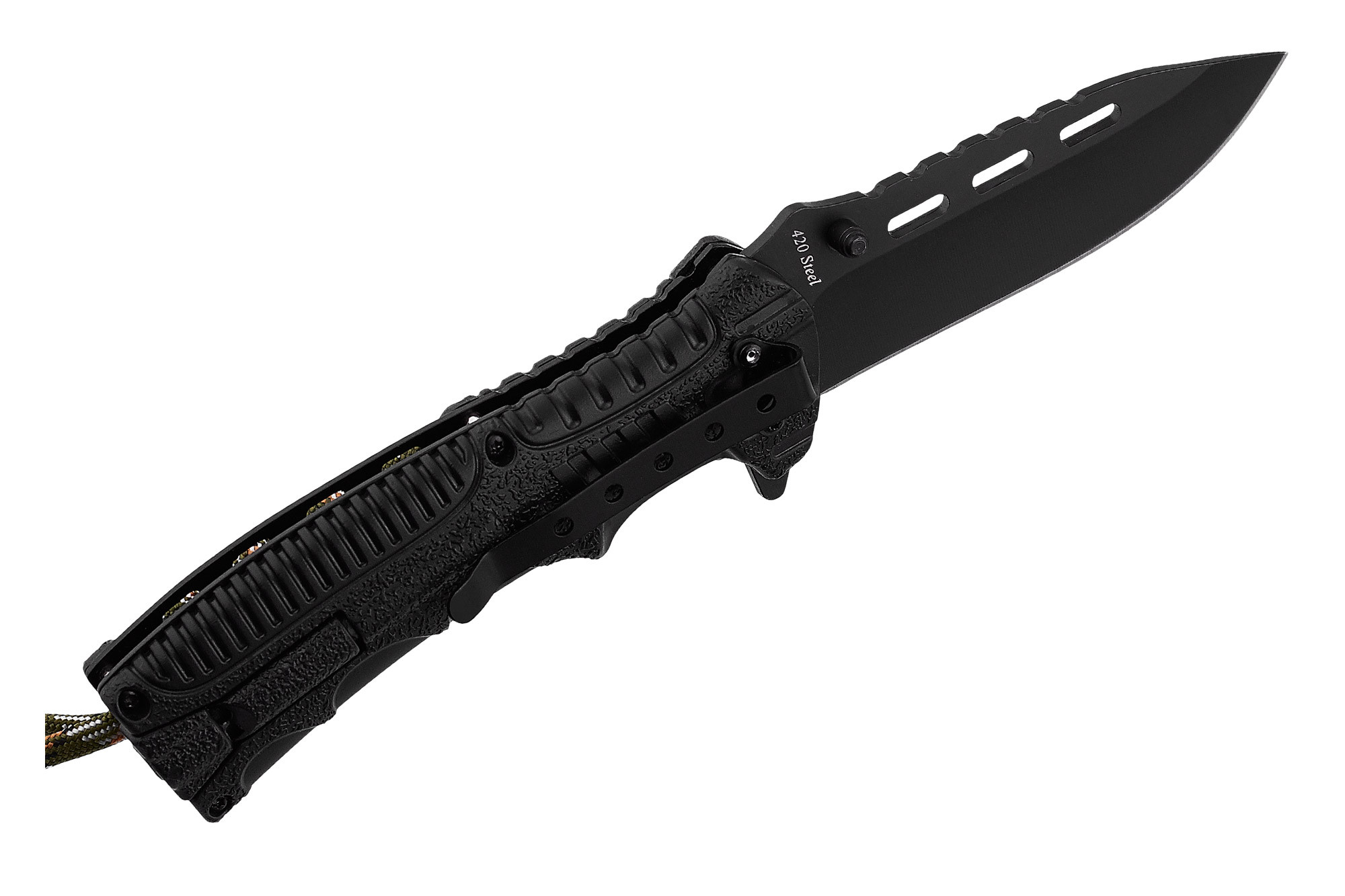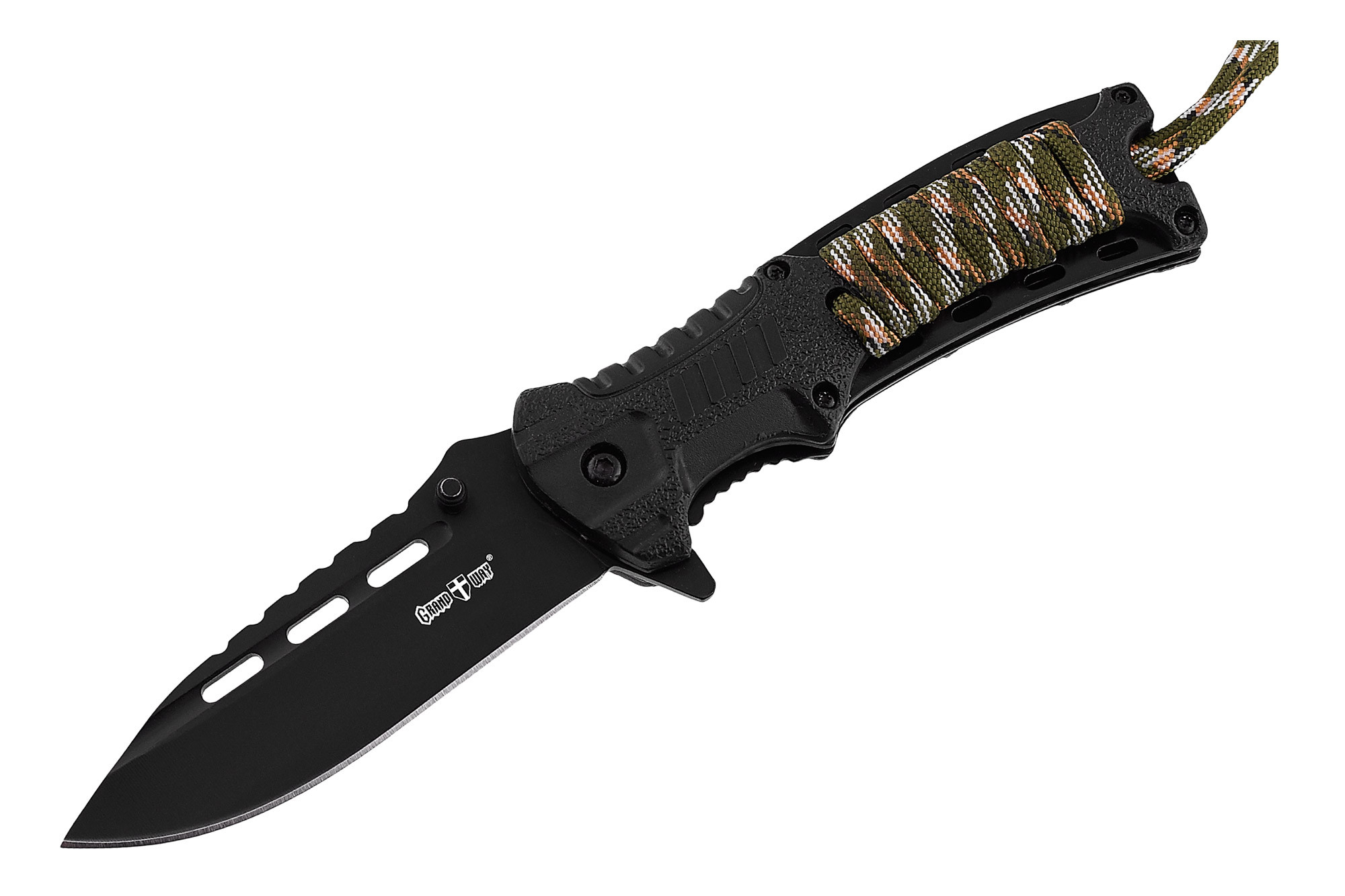 В рукоятке имеются дизайнерские вырезы и отверстия, в которые продет паракорд. Длинные окончания этой оплетки можно использовать в качестве темляка.
