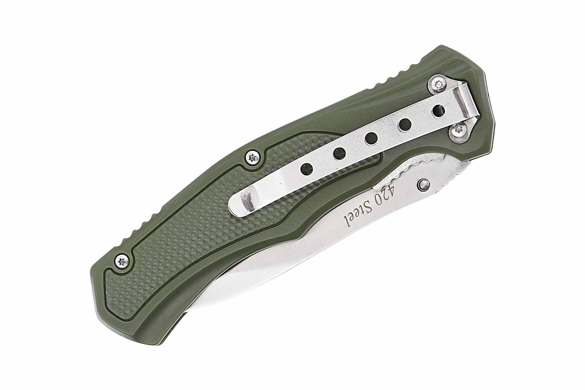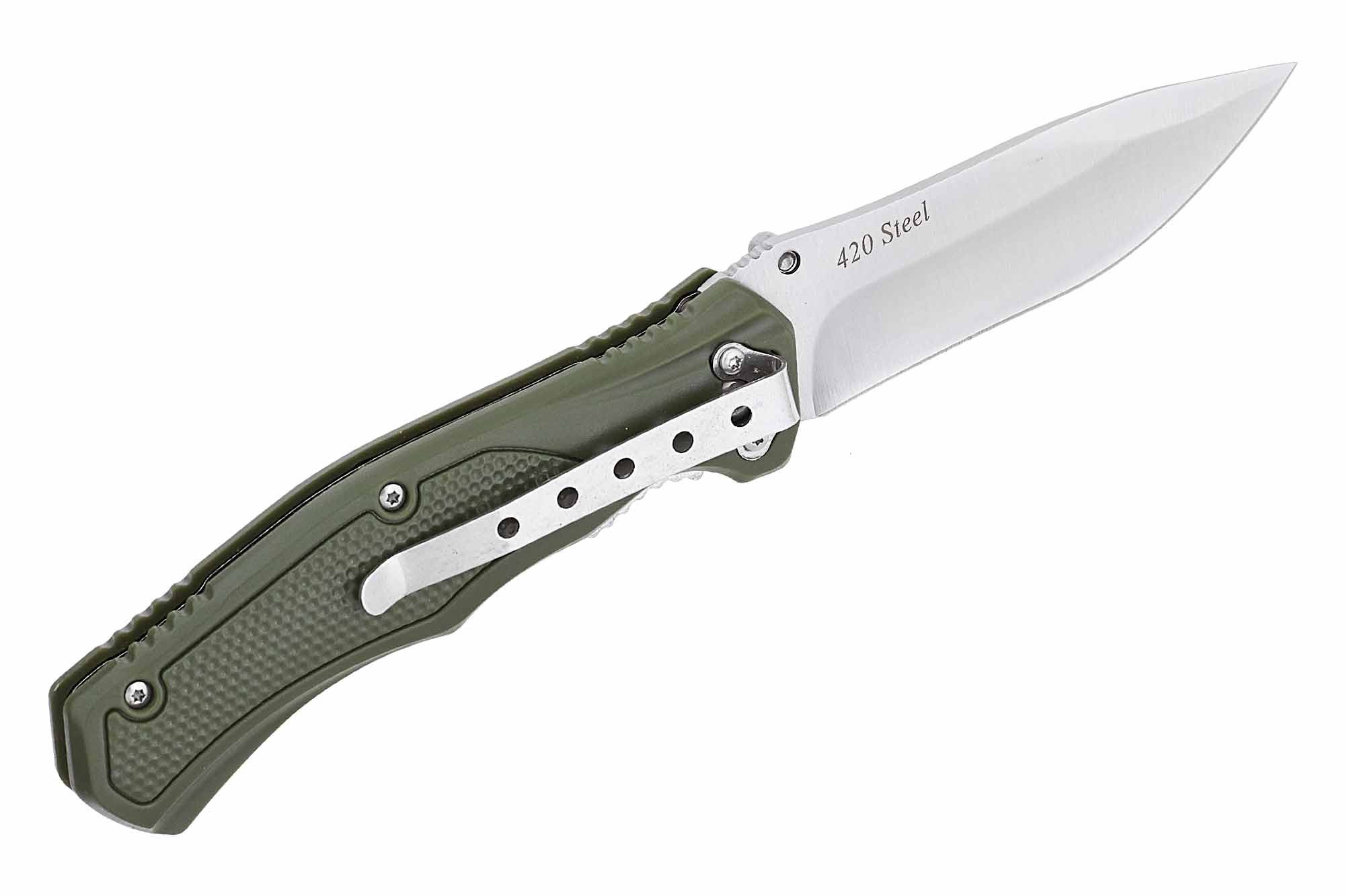 Так клинок изготовлен из нержавеющей стали марки 420. Несмотря на то, что эта сталь и уступает твёрдостью более дорогим сортам, она фактически не подвержена коррозии и чрезвычайно легко затачивается до вполне приличной остроты. Если при этом учесть, что поверхность клинка отделана довольно качественным сатином, цена ножа удивляет ещё больше.